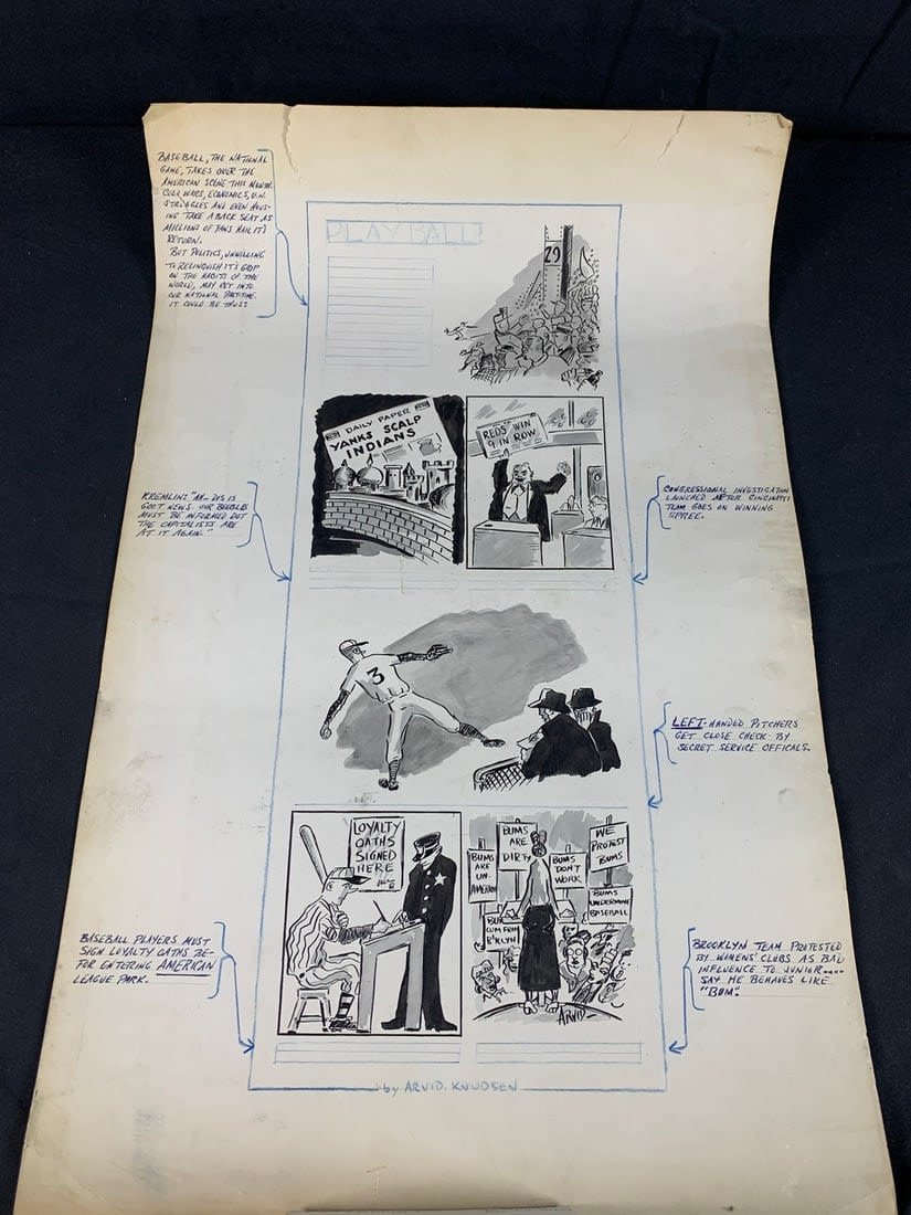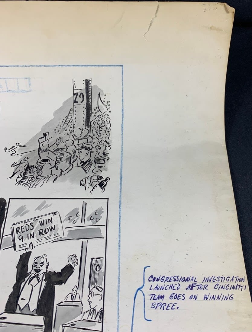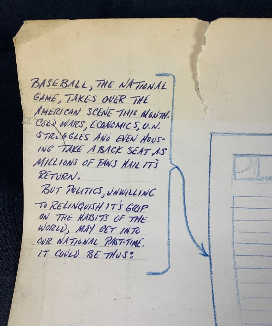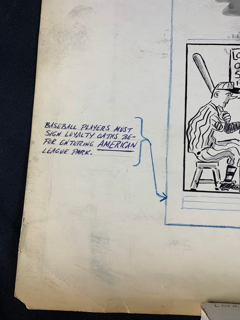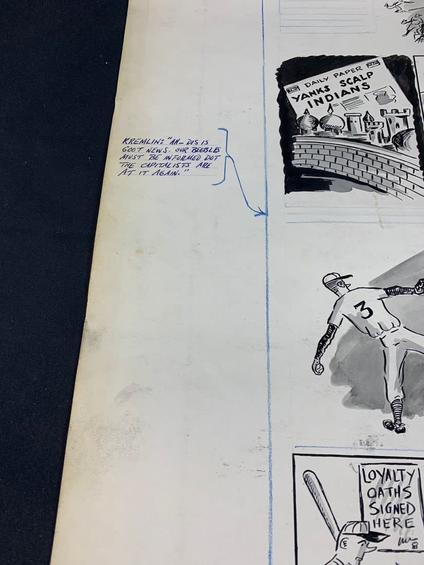 This original sketch is referencing baseball coming back what what if cold war and politics influenced the game. And incredible subject matter for the time period. Large Multi-Media Piece that measures 14"x 23". Please note there are some tears and edge wear and light staining. Main artwork is in great shape