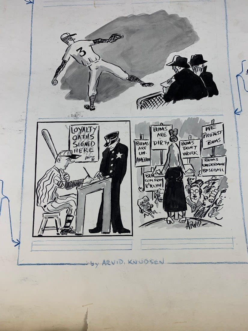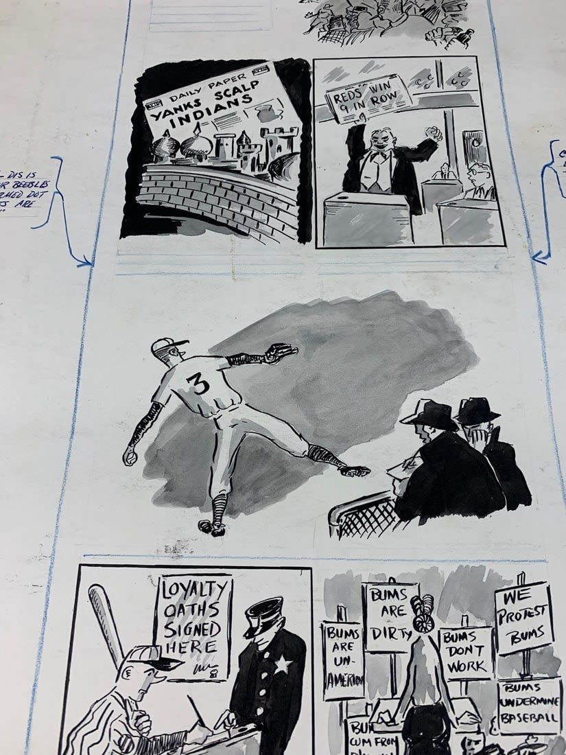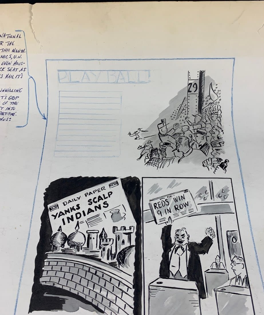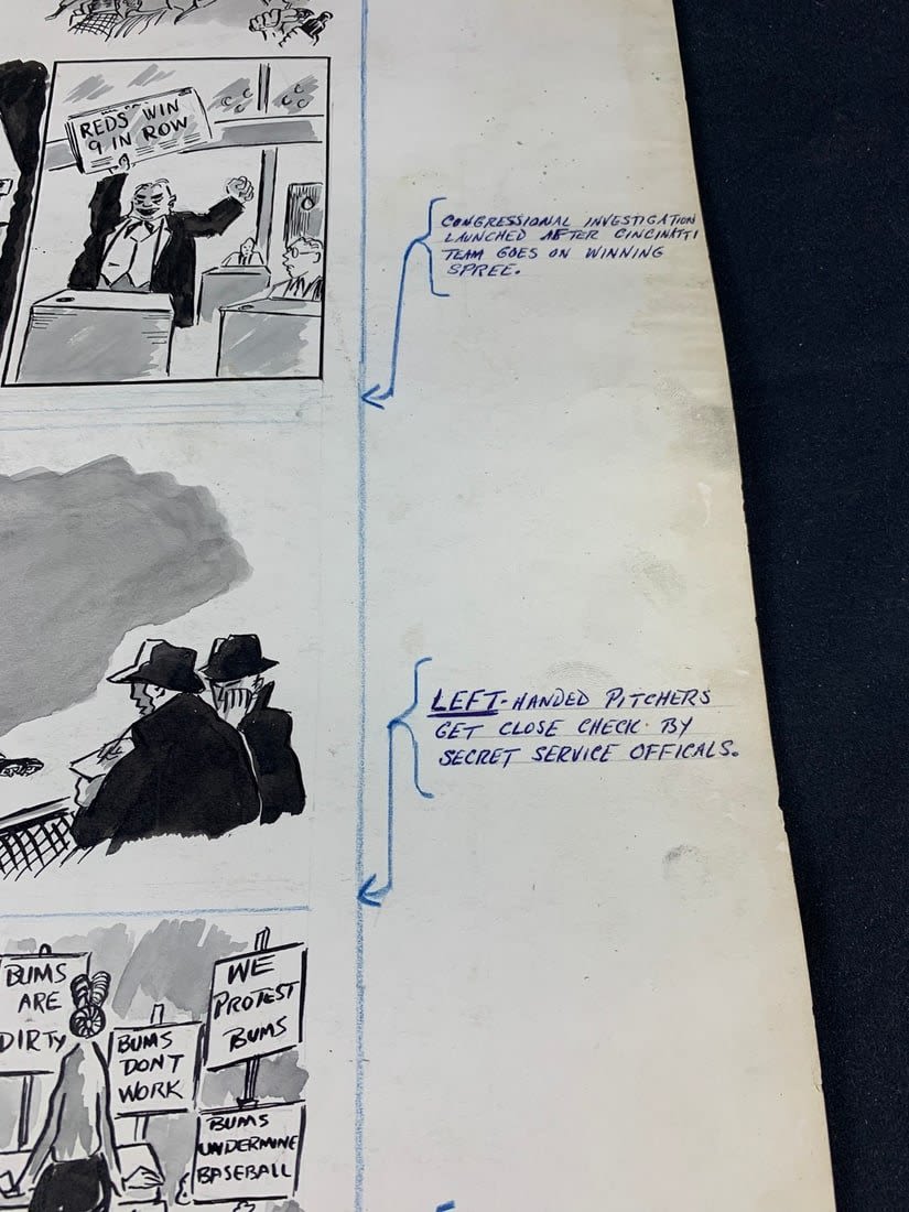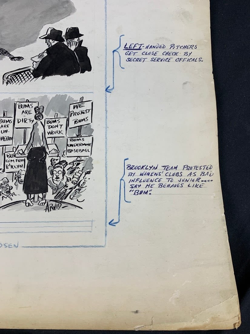 This original sketch is referencing baseball coming back what what if cold war and politics influenced the game. And incredible subject matter for the time period. Large Multi-Media Piece that measures 14"x 23". Please note there are some tears and edge wear and light staining. Main artwork is in great shape
