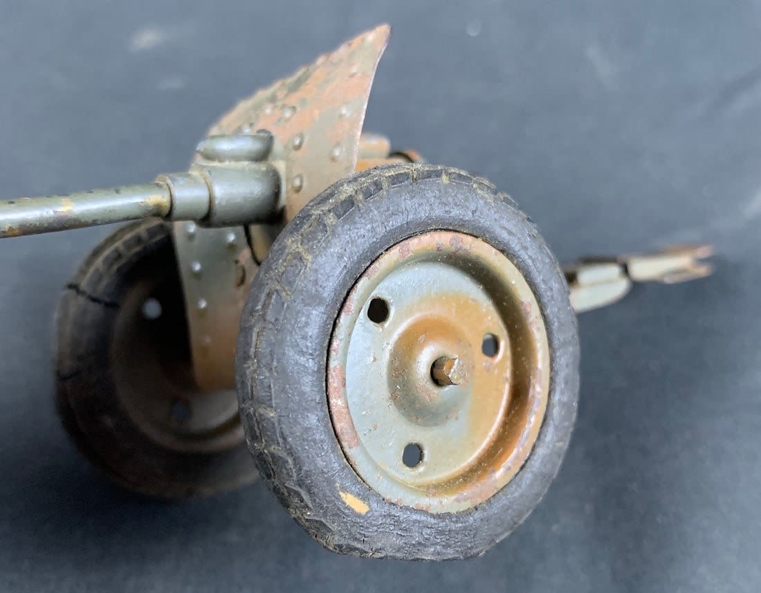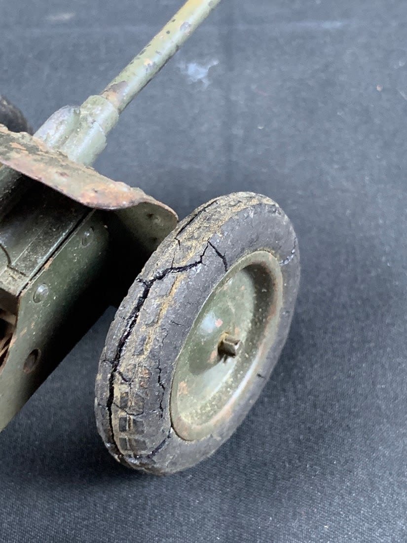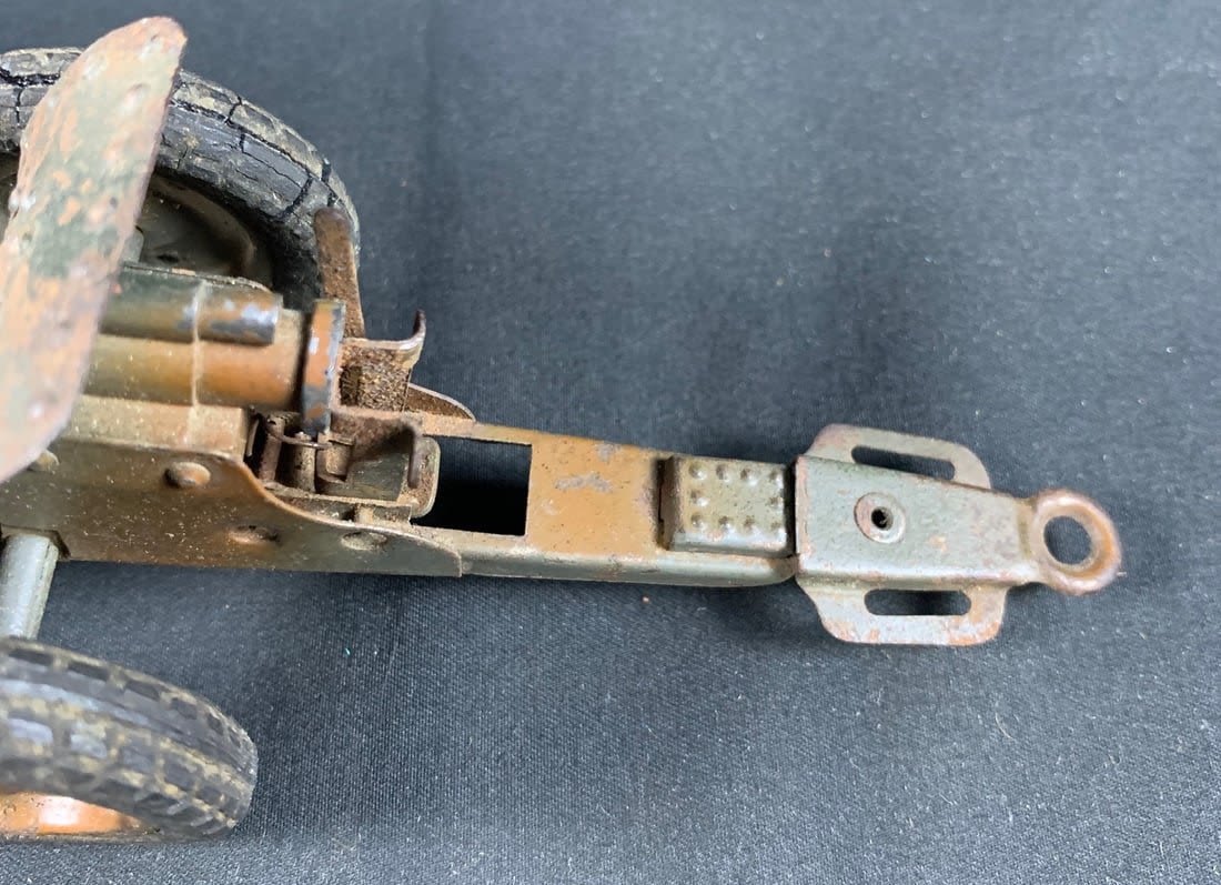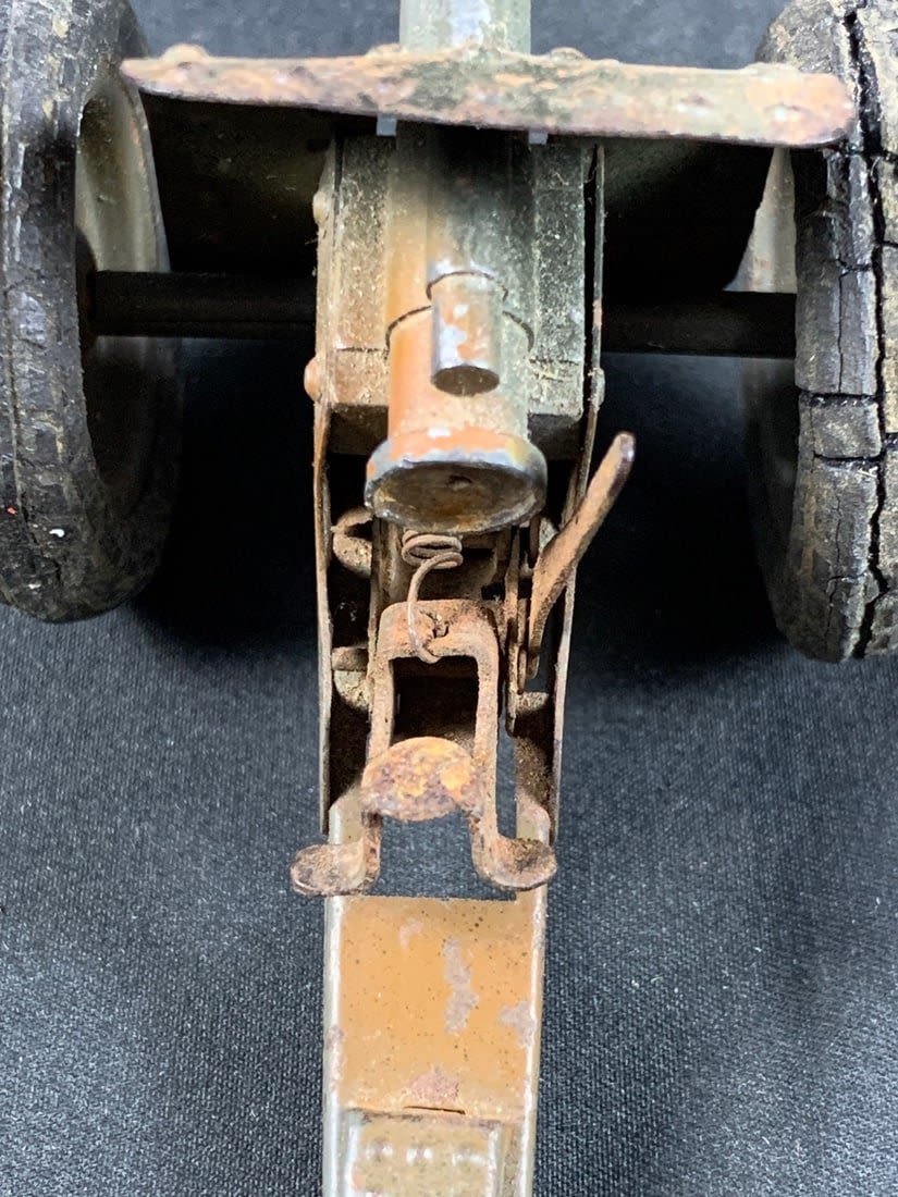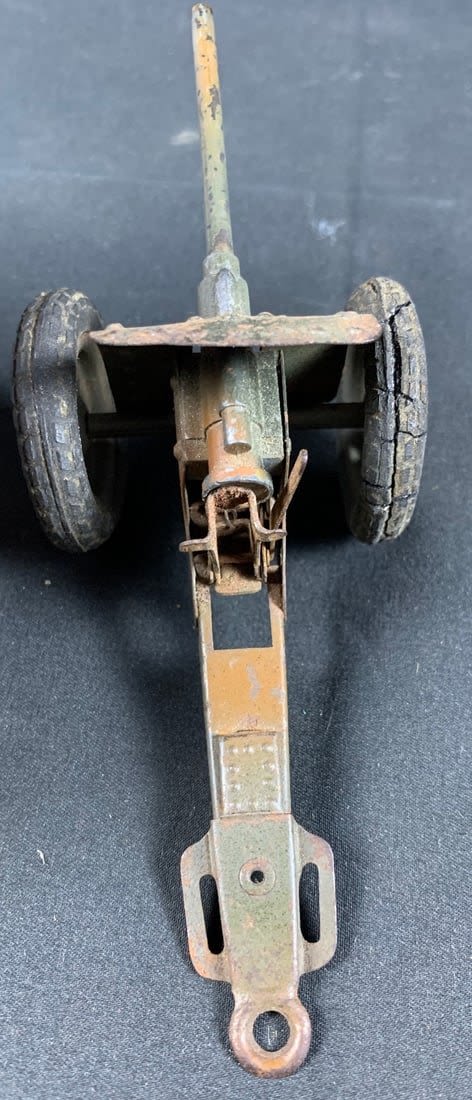 Little Rust and wheel sare cracked. But cap gun portion still locks and fires. Roughly 6"