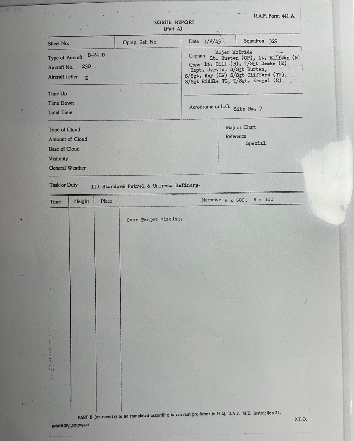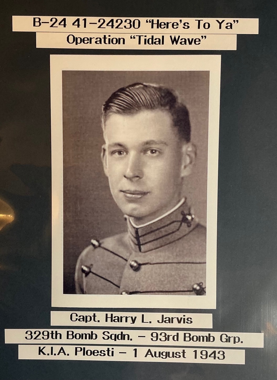This is an extraordinarily significant and tragic World War II grouping belonging to Captain Harry L. Jarvis Jr., a U.S. Army Air Forces pilot who was Killed in Action on the legendary, low-level Operation Tidal Wave Ploesti oil refinery raid on August 1, 1943. Captain Jarvis, a 1941 West Point graduate, served as the pilot of the B-24 Liberator Here s To Ya, 329th Bomb Squadron, 93rd Bomb Group, which was lost over the target, as confirmed by the original Sortie Report listing him as missing over target. The grouping includes his official, hand-engraved full-size medals: the Purple Heart and the Air Medal , both prominently engraved on the reverse with his name, CAPT. HARRY L. JARVIS JR., confirming their presentation as genuine issue pieces. The lot also features his Sterling Silver Pilot Wings, uniquely hand-engraved on the reverse with his last name JARVIS and confirmed to be made by the Orber Company. The full set of his awards includes the Distinguished Flying Cross DFC, Air Medal AM, and the Purple Heart PH, all suspended from their period ribbons, alongside an 8th Air Force patch and his West Point cadet portrait. This collection, which includes an original crew photograph , documents the ultimate sacrifice of a distinguished aviator in one of the deadliest and most famous air raids of the war.