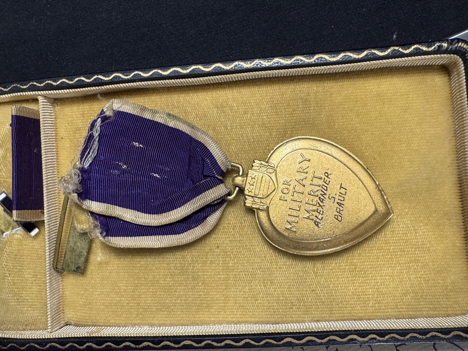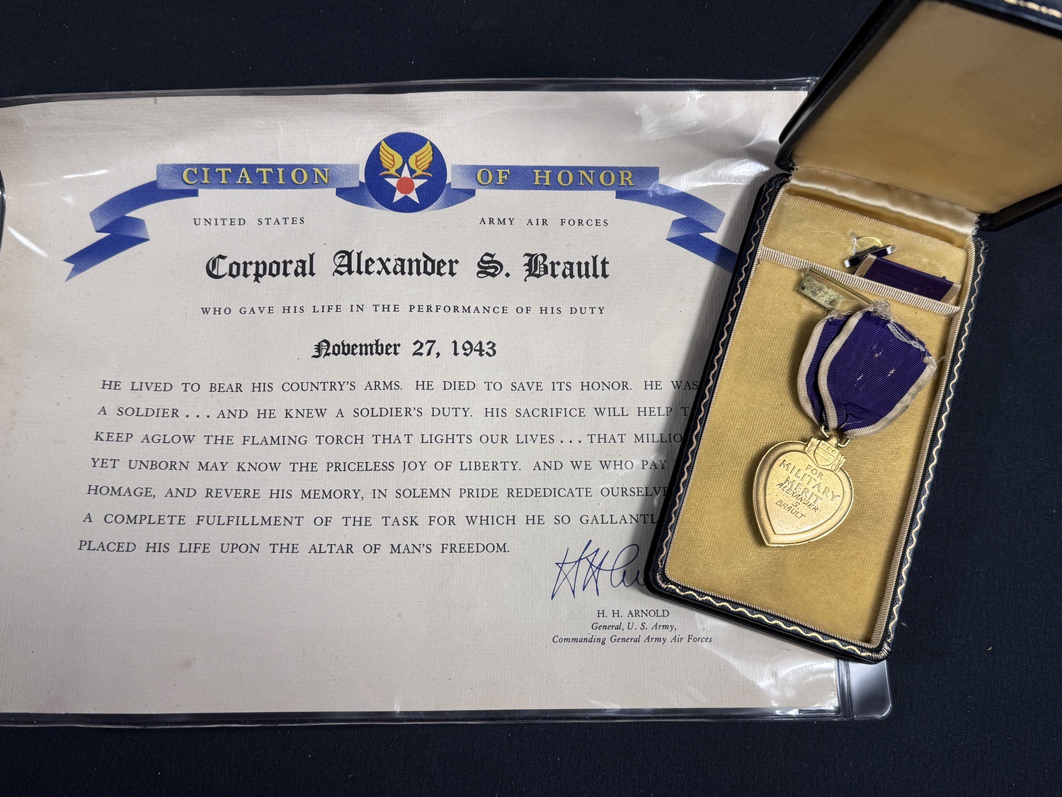 This is a poignant and historically complete memorial grouping dedicated to Corporal Alexander S. Brault, U.S. Army Air Forces, who died in the performance of his duty on November 27, 1943. The centerpiece of the documentation is the original Citation of Honor issued by the United States Army Air Forces, signed by General H. H. Arnold, Commanding General Army Air Forces. This citation recognizes Corporal Brault s ultimate sacrifice, using solemn language to honor his life given for his country. The lot also includes a Purple Heart Medal in its presentation case, clearly engraved on the reverse with his name: ALEXANDER S. BRAULT . While the Purple Heart is traditionally awarded for wounds or death resulting from enemy action, the specific circumstances of Corporal Brault s deathÑa non-battle fatalityÑsuggest that this medal was likely added to the memorial grouping by his family as a token of honor, a common practice for loved ones wishing to commemorate service members who died in the line of duty but outside of direct combat. The medal is presented in a classic hinged case with a purple velvet interior and is accompanied by its ribbon bar. This set represents a moving and documented tribute to a WWII airman who gave his life for the war effort, regardless of the cause of death.