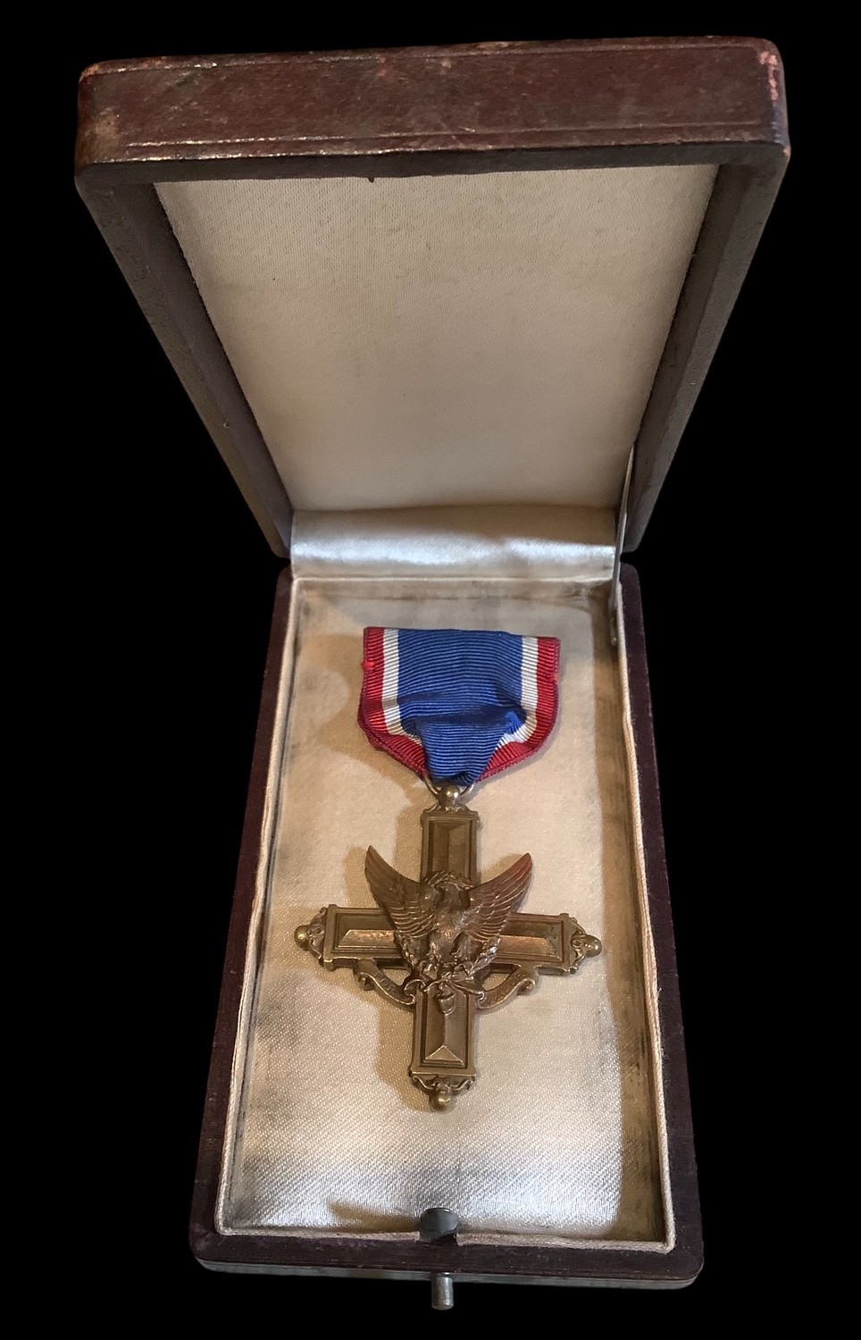 This is an exceedingly rare, documented, and poignant grouping dedicated to First Lieutenant Richard Fuller Woodward, U.S. Army, 319th Infantry Regiment, 80th Division, A.E.F., who was Killed in Action on October 9, 1918, during the Meuse-Argonne Offensive. The centerpiece is his Distinguished Service Cross DSC, the nation s second-highest award for combat valor, which is an original, early issue WWI cross presented in its distinctive maroon presentation case marked D.S.C. The DSC is confirmed as an officially issued medal with the control number 6872 stamped on the cross s edge, aligning with the included veteran s records. Lieutenant Woodward s DSC was awarded for extraordinary heroism in action near Cunel, France, on October 9, 1918, where disregarding his intense suffering from wounds, Lieutenant Woodward continued to lead and encourage his men until killed by another rain of machine-gun bullets. This profound act of bravery is further documented by the full citation and a photograph of his grave marker in France. The grouping is complete with his WWI Victory Medal, which includes the four campaign clasps SOMME OFFENSIVE, ST. MIHIEL, MEUSE-ARGONNE, and DEFENSIVE SECTOR, a period photograph of Lieutenant Woodward in uniform, and official documentation, representing a museum-quality memorial to a decorated WWI officer who died a hero.