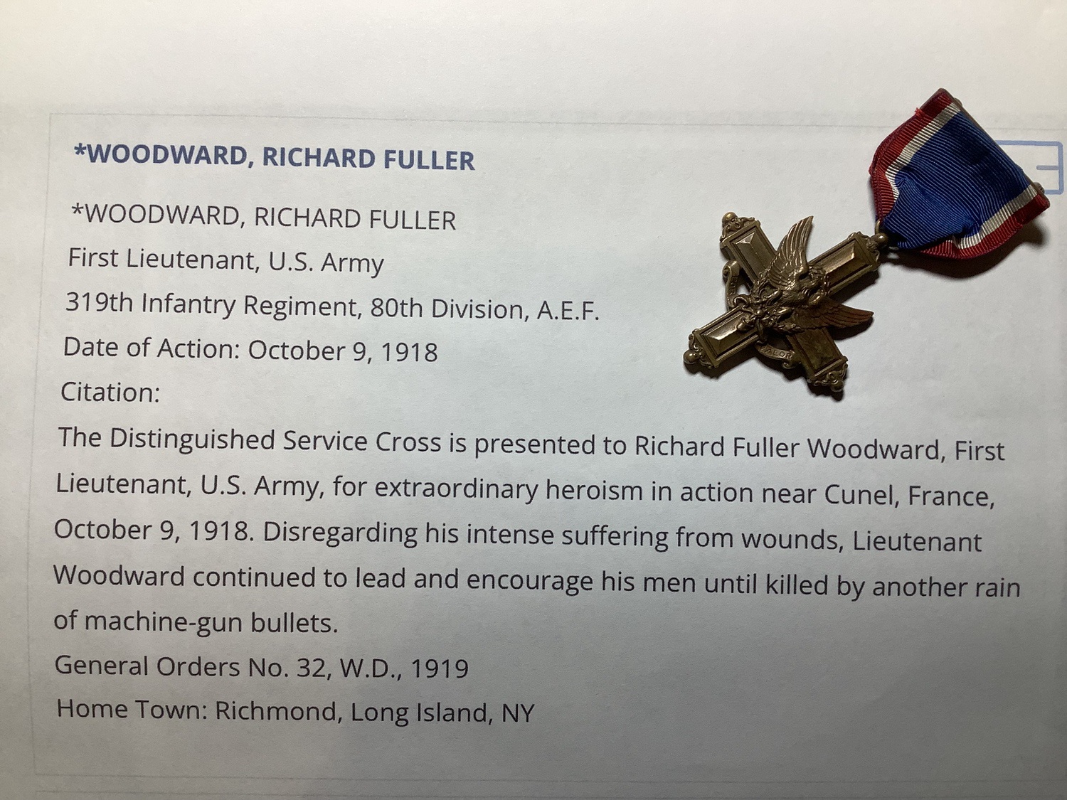 WWI Distinguished Service Cross K.I.A. Grouping to First Lieutenant Richard Fuller Woodward