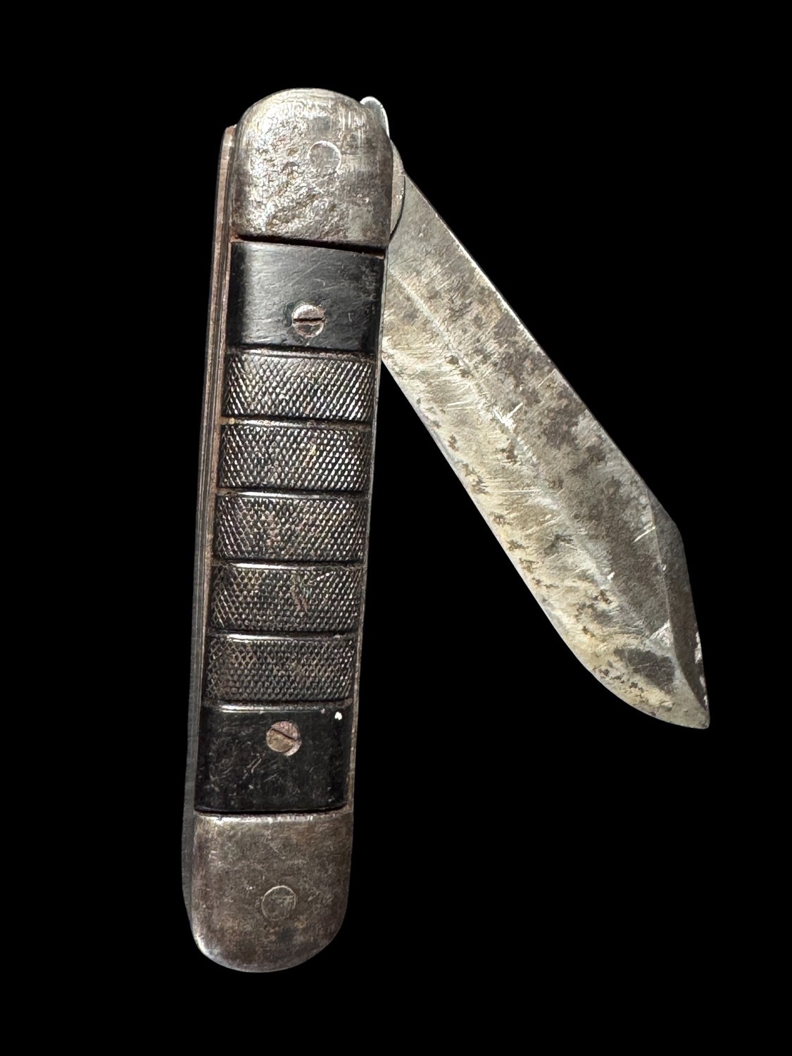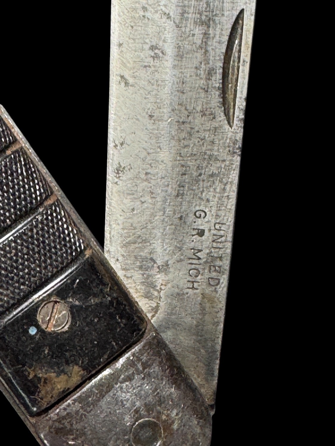 This is a robust and authentic vintage folding pocket knife, clearly marked on the blade as UNITED G.R. MICH., indicating it was manufactured by the United Knife Company of Grand Rapids, Michigan. The knife features a single, heavy clip point blade that exhibits significant sharpening wear, pitting, and patina consistent with extensive field use. The handle is constructed of metal bolsters and fittings with dark, likely black or dark brown, composite scales that are secured by screws and feature a distinct grid or cross-hatched pattern for secure grip. This style of rugged, single-blade folding knife was highly popular for utility purposes and closely resembles military-issue or military-style utility knives carried by American servicemen during the World War II era and immediate post-war period. The heavy-duty construction and clear manufacturer stamp make this a desirable piece of vintage American industrial and military utility history.