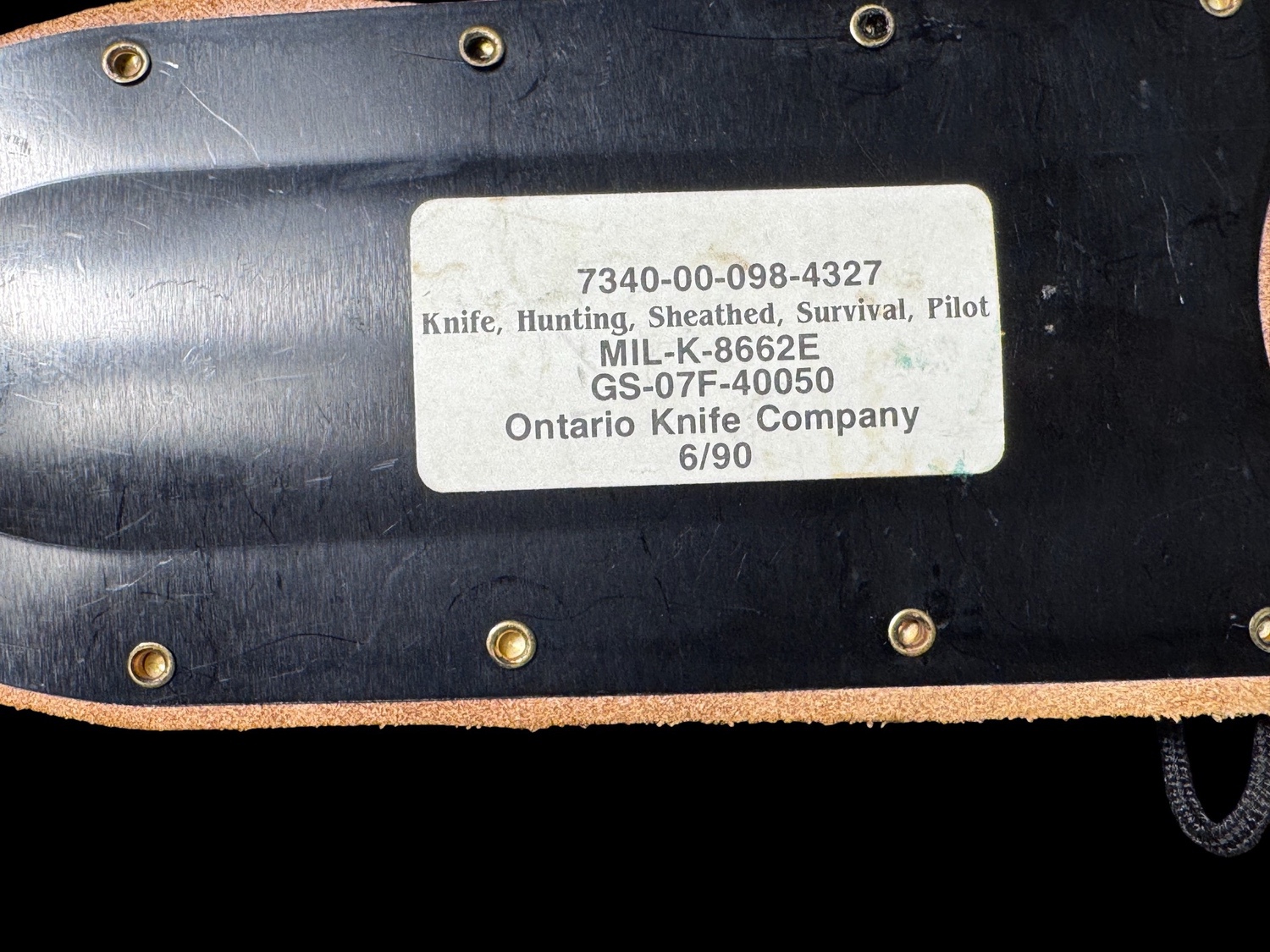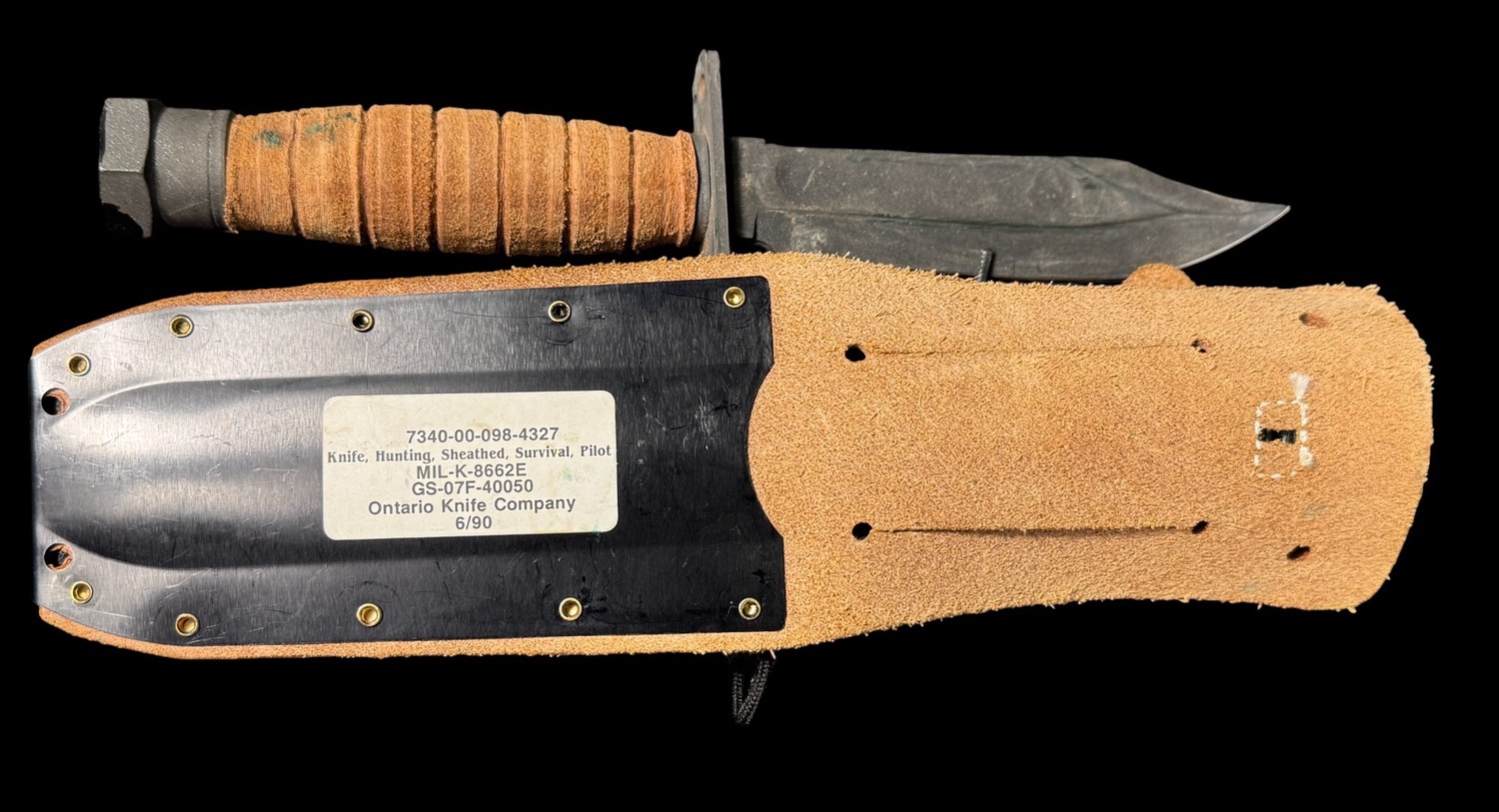 This is an authentic, modern-issue U.S. Military Pilot Survival Knife, clearly identified by the affixed specification label as conforming to the military standard MIL-K-8662E. The knife was manufactured by the Ontario Knife Company in June 1990, as indicated by the date 6/90 on the label, and features the National Stock Number 7340-00-098-4327. This robust fixed-blade knife is commonly known as the Air Force Survival Knife and is designed for use by pilots and aircrews. The knife features a heavy clip-point blade with a durable black oxide finish and a saw-back spine for utility. The handle is made of stacked leather washers, secured by a large, slotted steel butt cap, which can be used for hammering. It is accompanied by its issue brown leather sheath, which is reinforced with a metal cap at the tip for durability and includes a stone pouch and securing strap. This set is a high-quality example of post-Vietnam War era U.S. military survival gear and is highly sought after for its proven durability and clear military provenance.