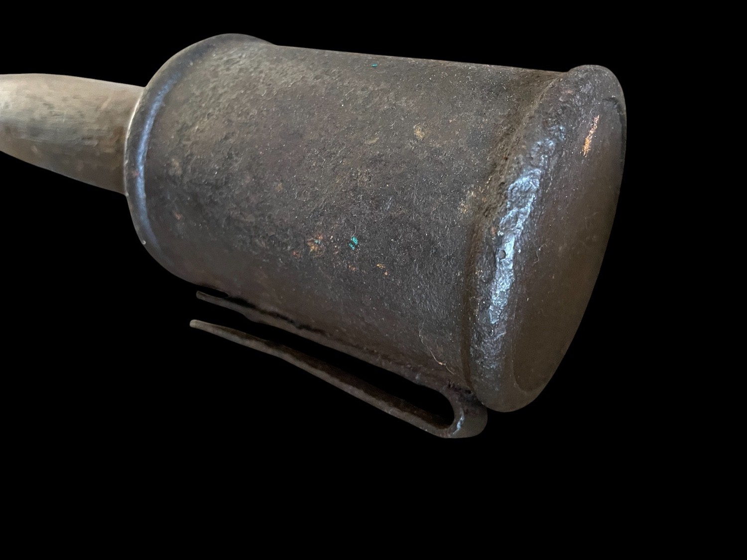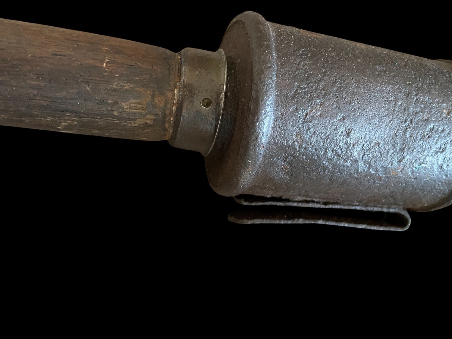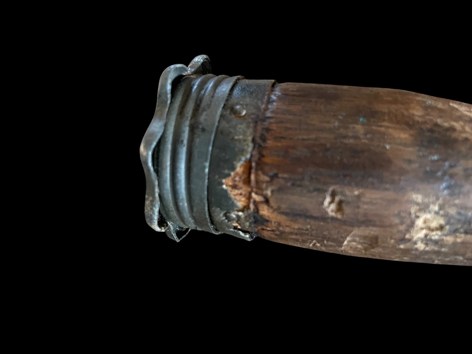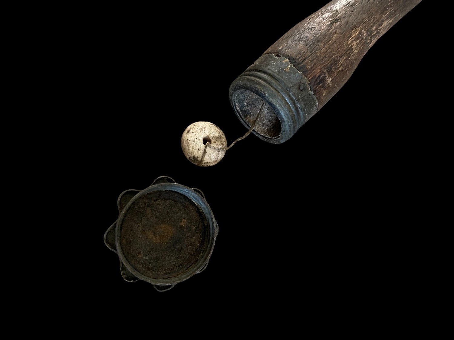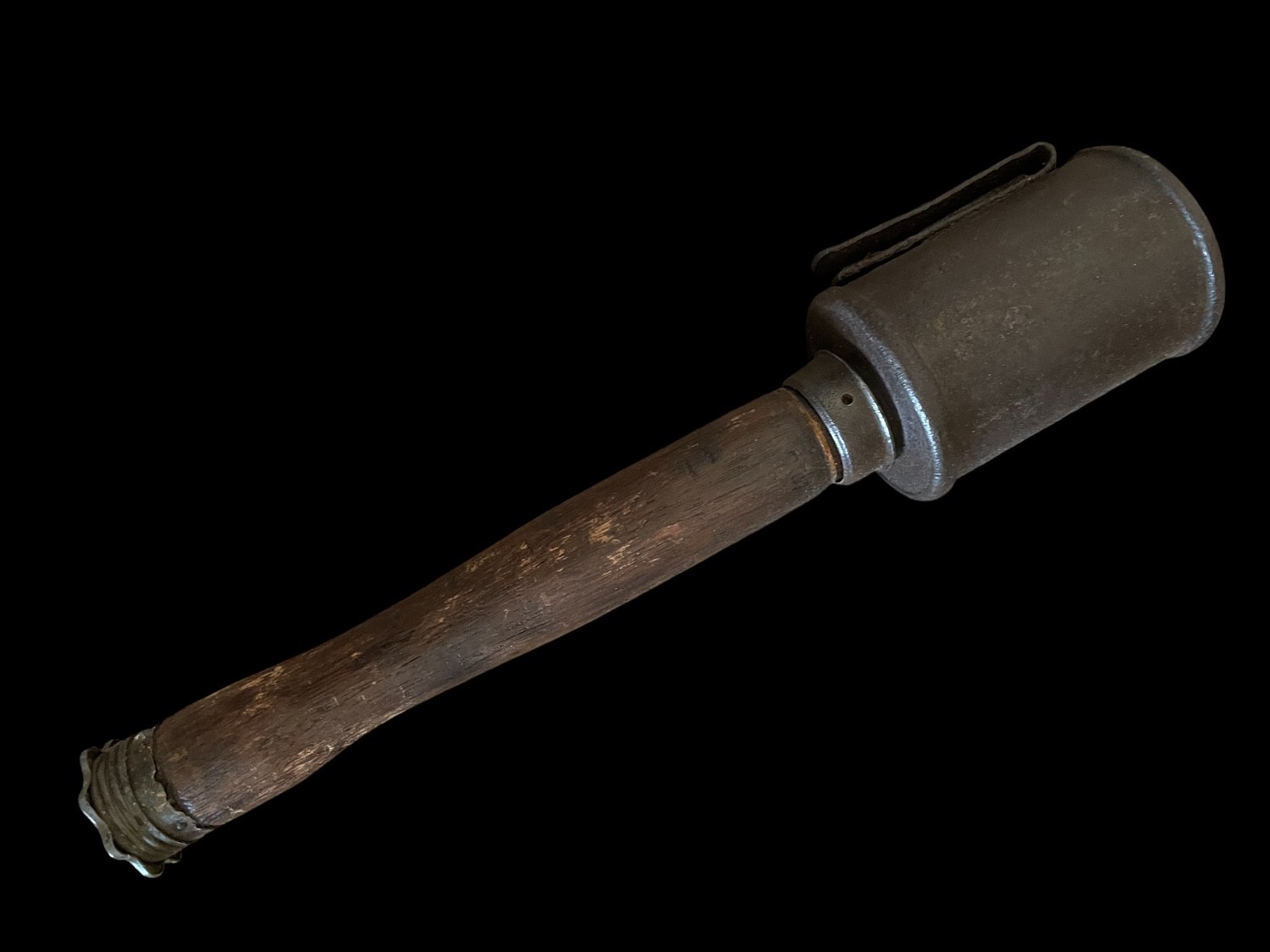 This is an authentic and iconic piece of World War I militaria: an Imperial German Stielhandgranate stick grenade, specifically the Model 1915 M15 variant. This early pattern of the stick grenade, famously dubbed the potato masher, features a substantial, textured cast iron or sheet metal head containing the explosive charge, which is fitted onto a tapered wooden handle. The grenade head exhibits a dark, heavy patina and pitting consistent with its WWI origins and trench usage. A metal belt clip is attached beneath the head for carrying on the uniform. The wooden handle retains its original metal base cap, which, when unscrewed , reveals the porcelain ball attached to the fuse pulling cord, the mechanism used to ignite the timed fuse. This fragmentation grenade was instrumental in trench warfare tactics and is a rare survivor, representing one of the most recognizable weapons of the Great War. INERT