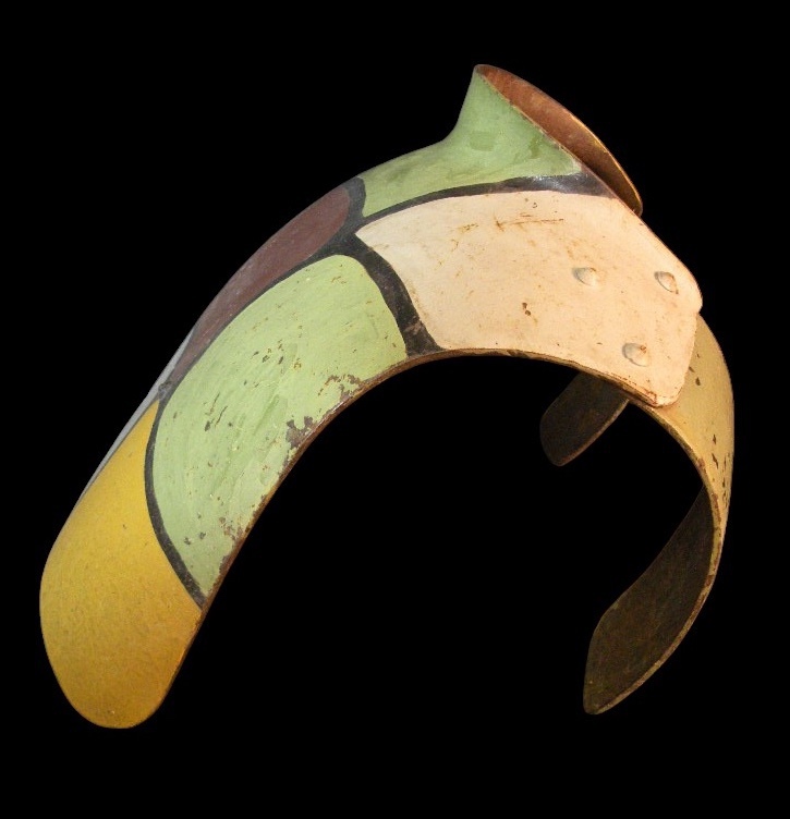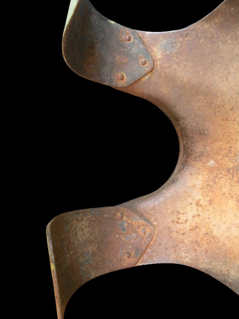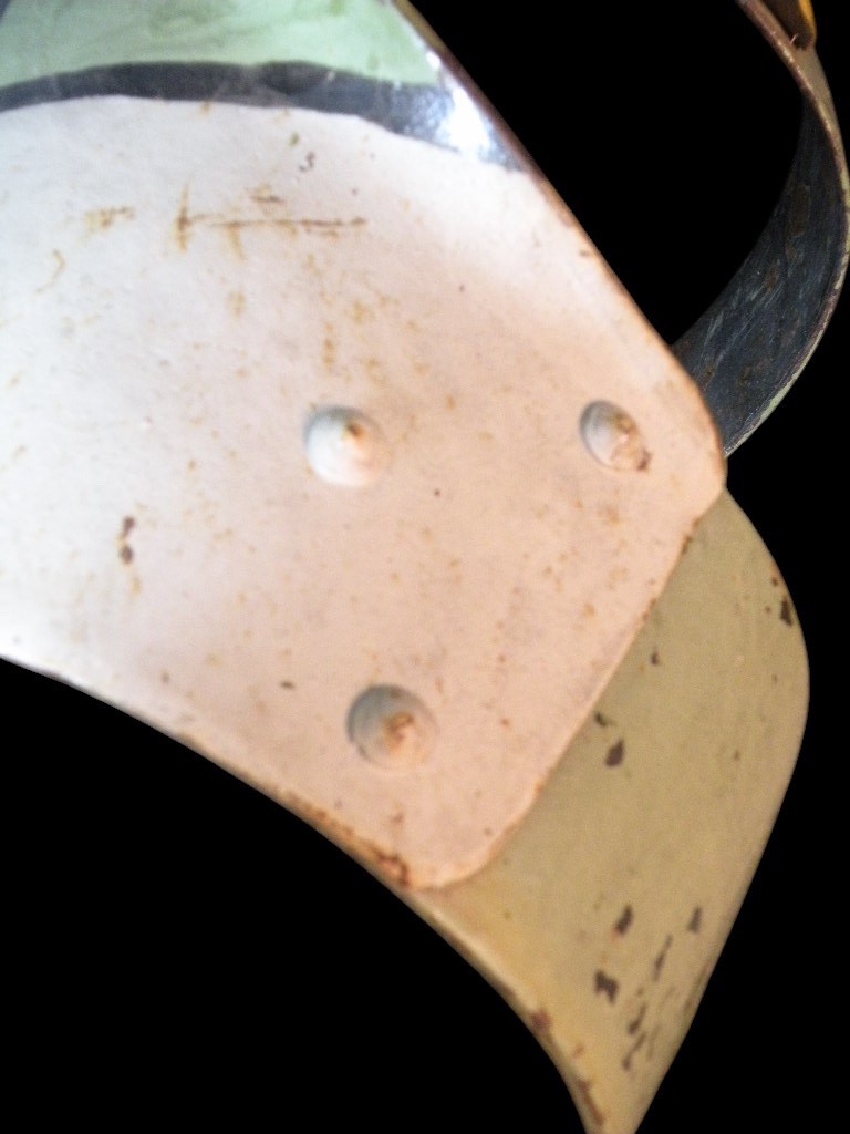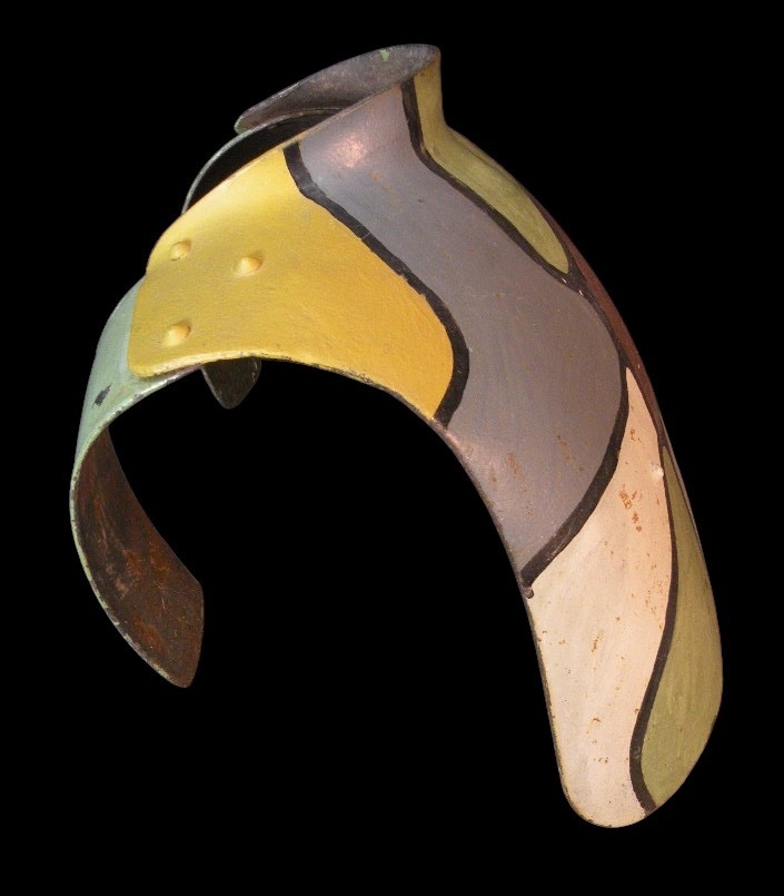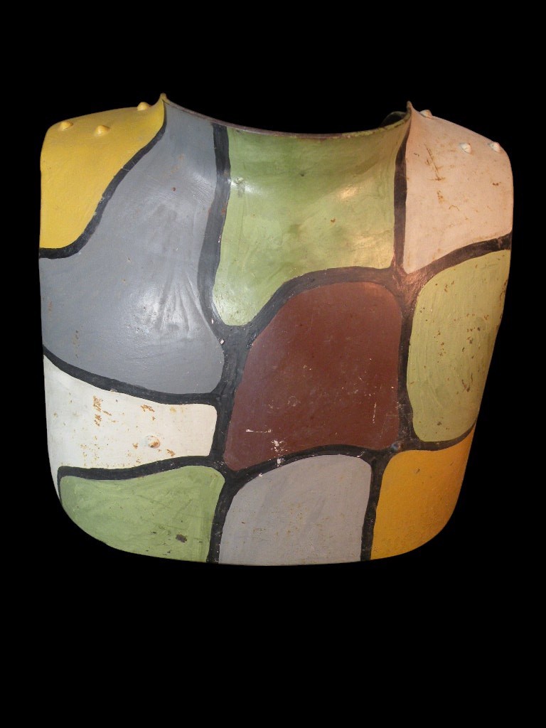 This is an extremely rare and historically significant artifact of World War I trench warfare: an Imperial German Body Armor breastplate, known colloquially as the Grabenpanzer or Trench Armor. This heavy, multi-plated steel breastplate was designed to provide protection against rifle and machine gun fire for stationary personnel such as snipers, machine gunners, and sentries, as illustrated by a period photograph of a German soldier wearing a similar vest. This example is particularly exceptional because it retains its original, striking Cubist-style geometric camouflage paint scheme , featuring large, irregular patches of yellow, olive green, brown, gray, and off-white separated by thick black lines. This distinctive pattern was an early attempt at disruptive camouflage intended to break up the wearer s outline against the complex background of the trenches. The armor consists of a thick, riveted steel plate designed to cover the chest and upper abdomen, with separate shoulder pieces for added protection. The reverse shows heavy rust and the remnants of the attachment loops for securing the vest, confirming its period authenticity and combat use in the trenches.
