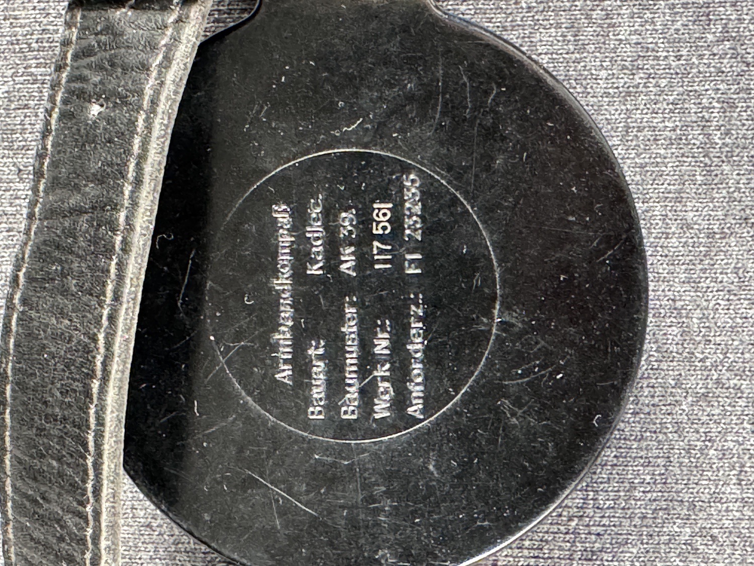 This is an authentic and rare piece of World War II German flight equipment: a Luftwaffe Pilot s Wrist Compass, identified by the inscription as a Armbandkompa§ wrist compass, Model AK 39 M. This specific compass was manufactured by Kadlec, a known supplier of aviation instruments, and bears the serial number Werk Nr.: 117 561 and the required service designation Anforderz.: FL 23235, confirming its official Luftwaffe issue status. The compass features a large, black circular housing with a rotating bezel and a clear glass face, displaying a dark dial with bright luminous radium paint for night use, marked with 24-hour designations 0-330 degrees. The compass is fitted with its original black leather wrist strap, showing wear and age consistent with period use, making this a highly desirable and functional piece of navigation equipment used by German pilots and aircrew throughout the war.