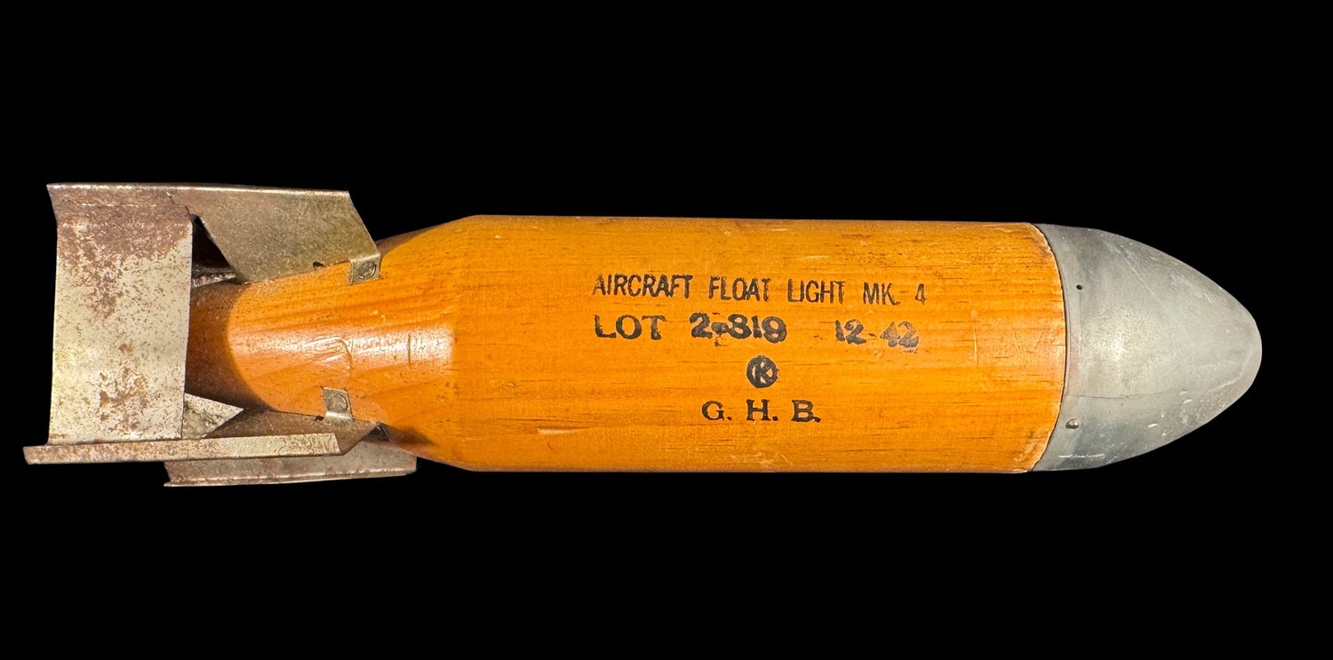 This is an authentic and extremely rare piece of U.S. Naval Aviation equipment from the World War II era: an Aircraft Float Light Marker MK. 4. This device was essential for maritime air operations, typically dropped by aircraft to mark the location of a downed pilot, a submerged submarine, or a target at sea, producing a bright flare or smoke when it hit the water. The marker features a wooden body finished in its original bright orange/yellow color, indicating an early production or training version, and has a rounded metal nose and metal stabilizing fins at the tail.