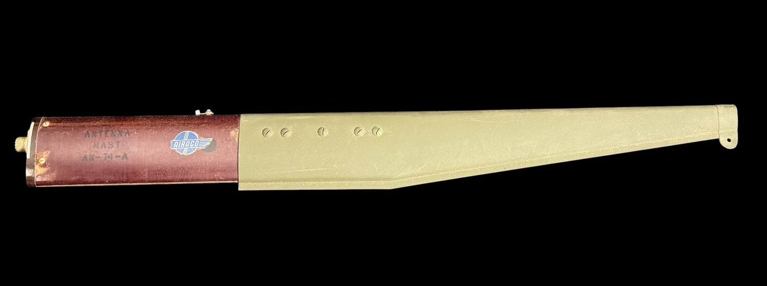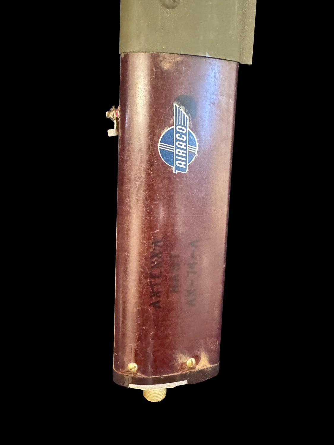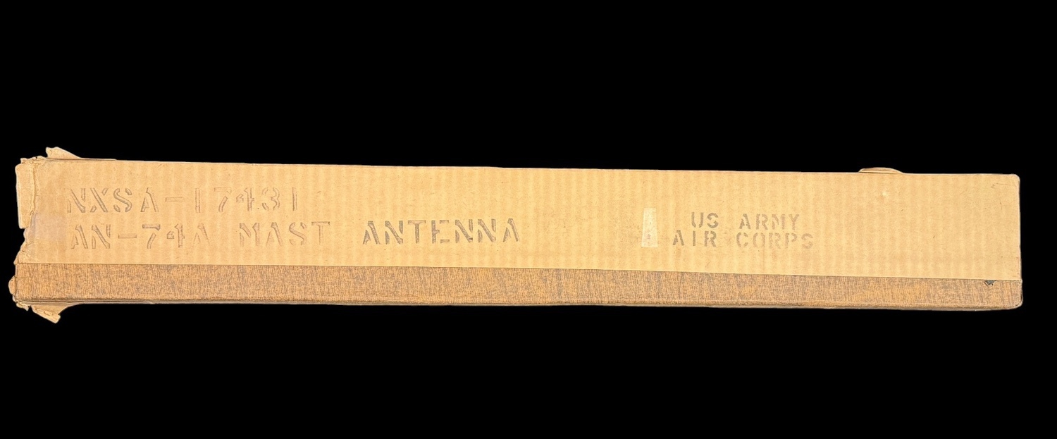 This is an extremely rare and specialized piece of World War II U.S. Army Air Corps aircraft radio equipment: an AN-74A Mast Antenna presented in its original contract packaging. This rigid blade antenna was designed for the SCR-522 VHF Radio Set, providing essential two-way radio communication for both command and navigation purposes in U.S. military aircraft. The antenna unit consists of a distinctive dark reddish-brown plastic or Bakelite mast marked with the manufacturer s logo AIRACO and the model designation AN-74-A ANTENNA MAST, fitted onto a streamlined, olive drab metal base stamped AMERICAN CHICAGO. The military issue is confirmed by the original brown cardboard box, which is clearly stenciled US ARMY AIR CORPS along with the complete model designation AN-74A MAST ANTENNA and the stock number NXSA-17431. The AN-74A was an early-war model superseded by the AN-104, and as such, was principally used on early variants of heavy bombers and some fighter aircraft, including the B-17 Flying Fortress, B-24 Liberator, and B-25 Mitchell bombers, as well as fighter aircraft like the P-51 Mustang and P-38 Lightning. Its survival, complete with original Army Air Corps marked box and documentation, makes it an exceptionally valuable artifact of World War II aviation communication technology.