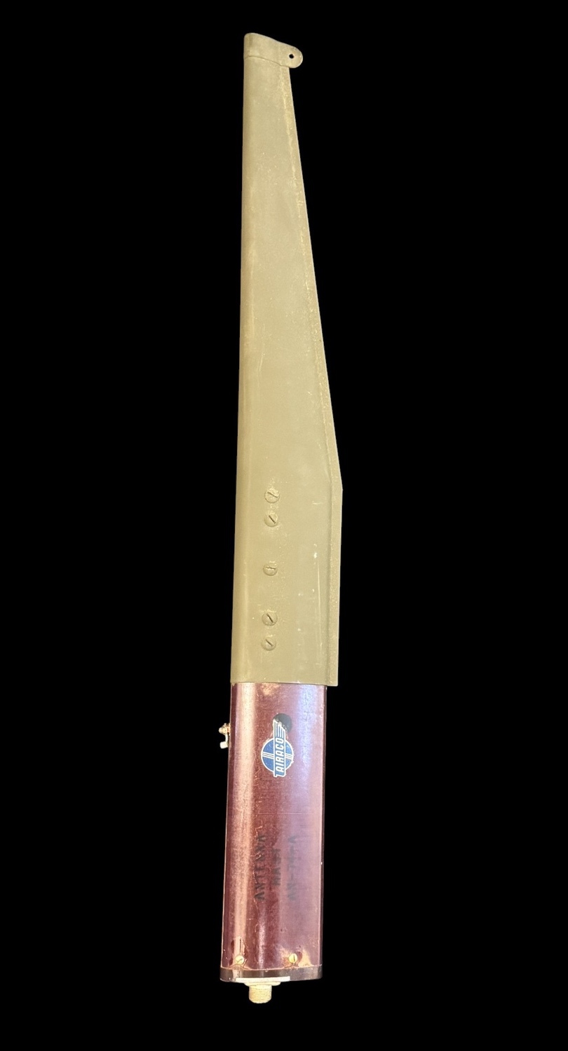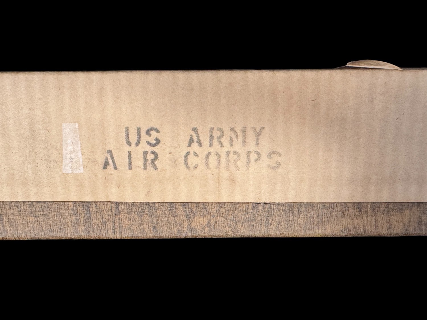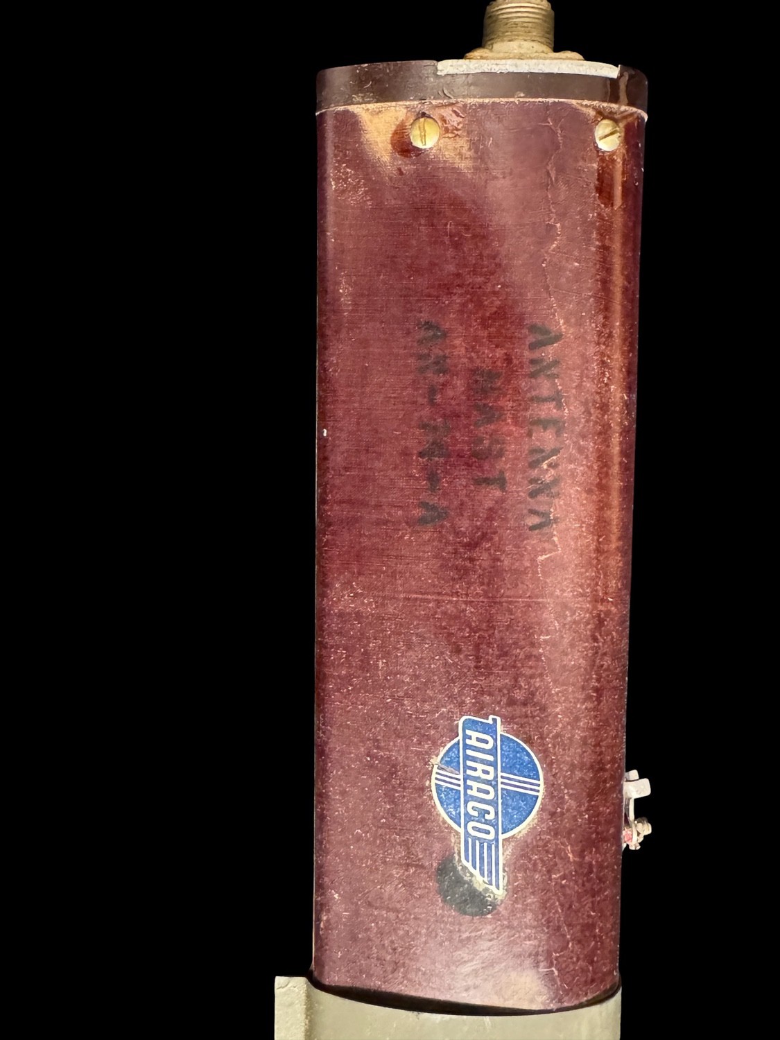 This is an extremely rare and specialized piece of World War II U.S. Army Air Corps aircraft radio equipment: an AN-74A Mast Antenna presented in its original contract packaging. This rigid blade antenna was designed for the SCR-522 VHF Radio Set, providing essential two-way radio communication for both command and navigation purposes in U.S. military aircraft. The antenna unit consists of a distinctive dark reddish-brown plastic or Bakelite mast marked with the manufacturer s logo AIRACO and the model designation AN-74-A ANTENNA MAST, fitted onto a streamlined, olive drab metal base stamped AMERICAN CHICAGO. The military issue is confirmed by the original brown cardboard box, which is clearly stenciled US ARMY AIR CORPS along with the complete model designation AN-74A MAST ANTENNA and the stock number NXSA-17431. The AN-74A was an early-war model superseded by the AN-104, and as such, was principally used on early variants of heavy bombers and some fighter aircraft, including the B-17 Flying Fortress, B-24 Liberator, and B-25 Mitchell bombers, as well as fighter aircraft like the P-51 Mustang and P-38 Lightning. Its survival, complete with original Army Air Corps marked box and documentation, makes it an exceptionally valuable artifact of World War II aviation communication technology.