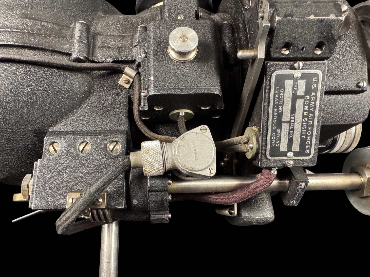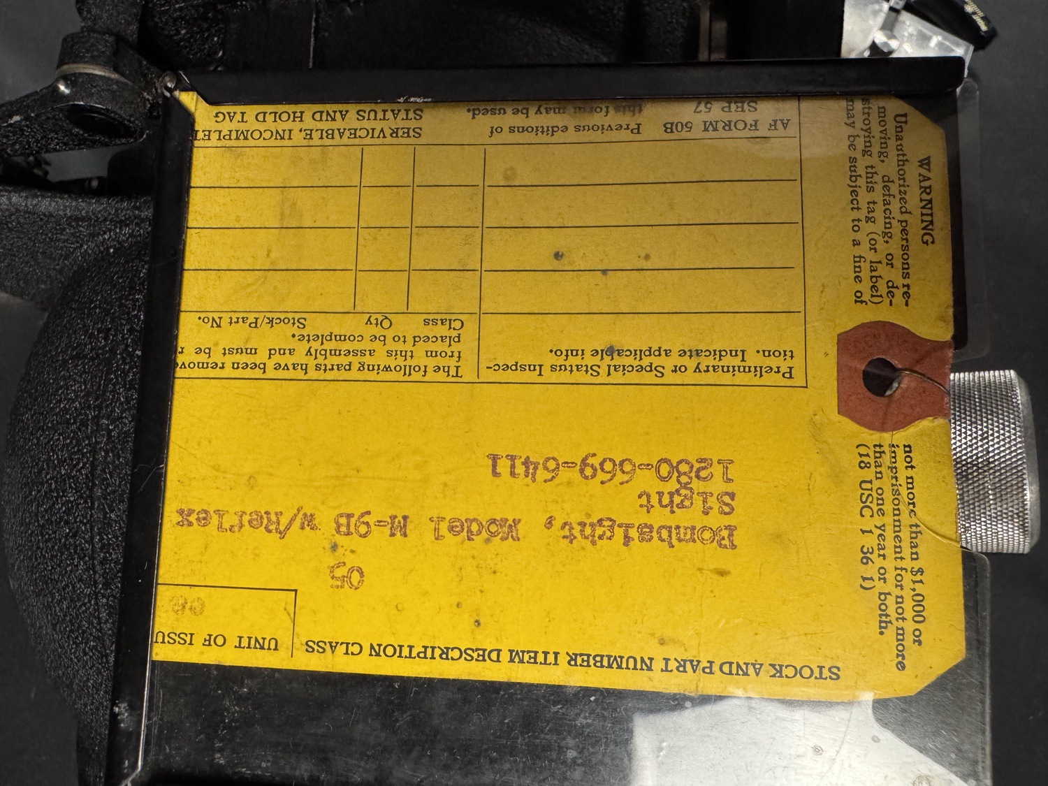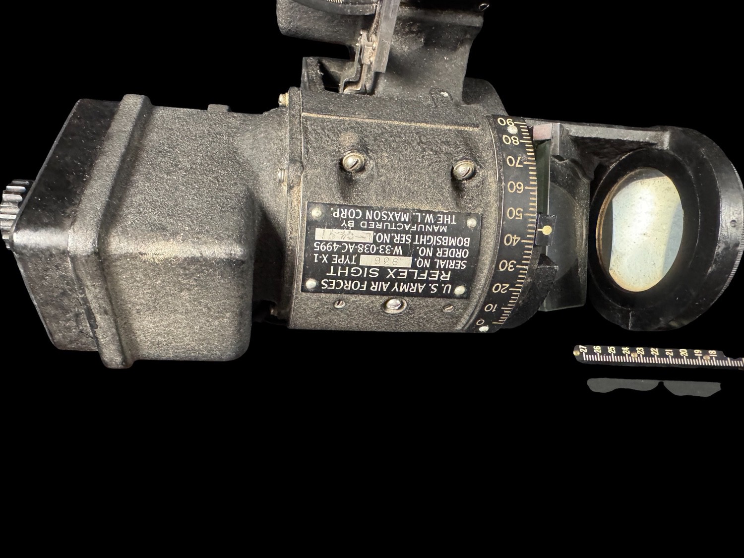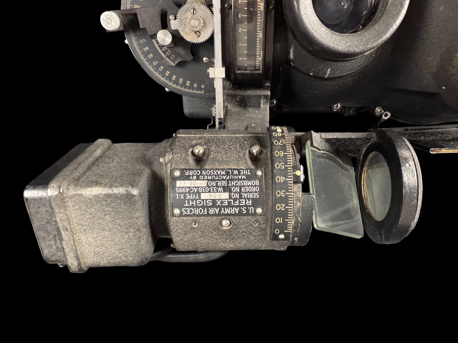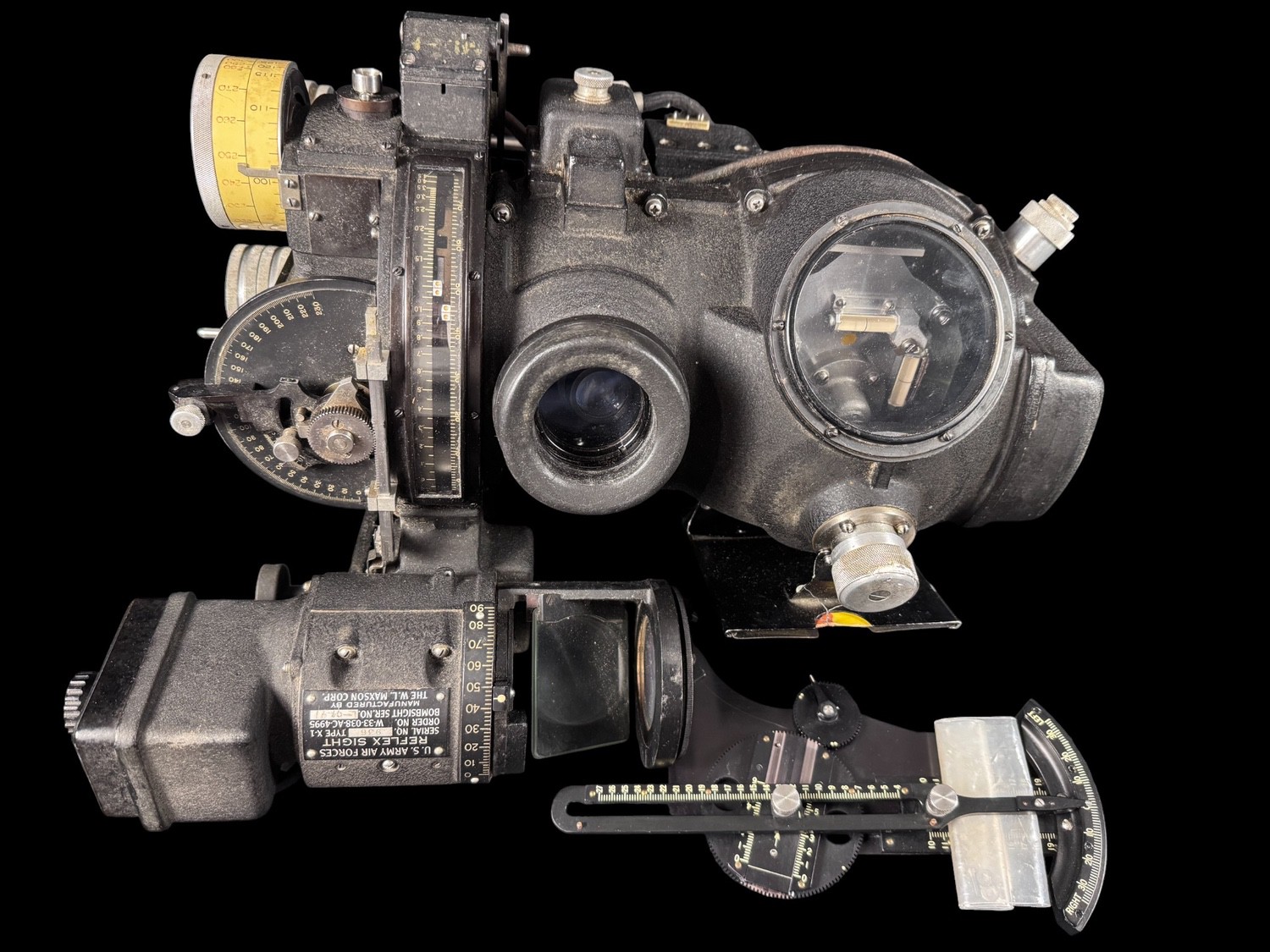This is an extremely complex and historically paramount assembly of U.S. Army Air Forces bombing equipment, identified as a component of the secret Norden Bombsight system, specifically the Model M-9B w/Reflex Sight apparatus, which played a critical, though technologically sensitive role in Allied precision bombing during World War II. This massive mechanical and optical instrument was essential for calculating the exact trajectory for bomb release, and the main unit is identifiable as a bombsight component manufactured by LUKAS-HAROLD CORP. The assembly integrates a specialized aiming device, a U.S. ARMY AIR FORCES REFLEX SIGHT, TYPE X-1, manufactured by THE W. L. MAXSON CORP., which provided the bombardier with a reflected reticle for manual corrections or low-altitude sighting. This system, which utilized complex mechanical linkages, geared controls, and precision optics, represented the pinnacle of U.S. wartime fire control technology, installed in virtually all major U.S. bombers from the B-17 to the B-29. The unit retains an original AF FORM 50B inspection tag from September 1957, which classifies it as SERVICEABLE, INCOMPLETE, confirming its long institutional use into the early Cold War era. This comprehensive, multi-component assembly of a key piece of American military history is a museum-quality artifact.