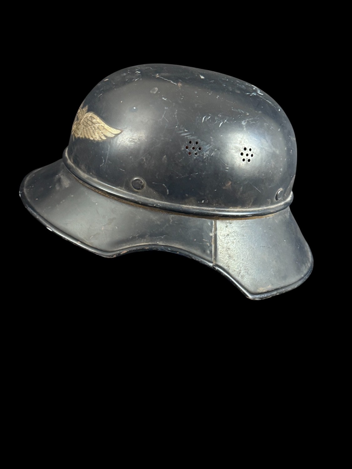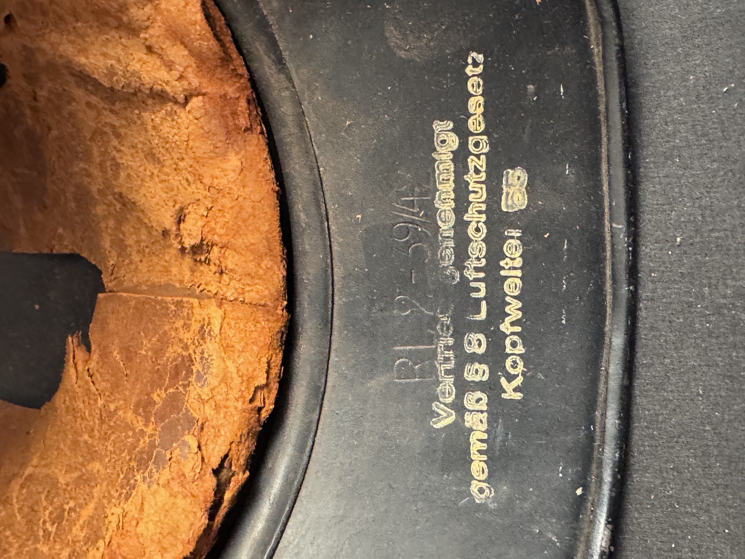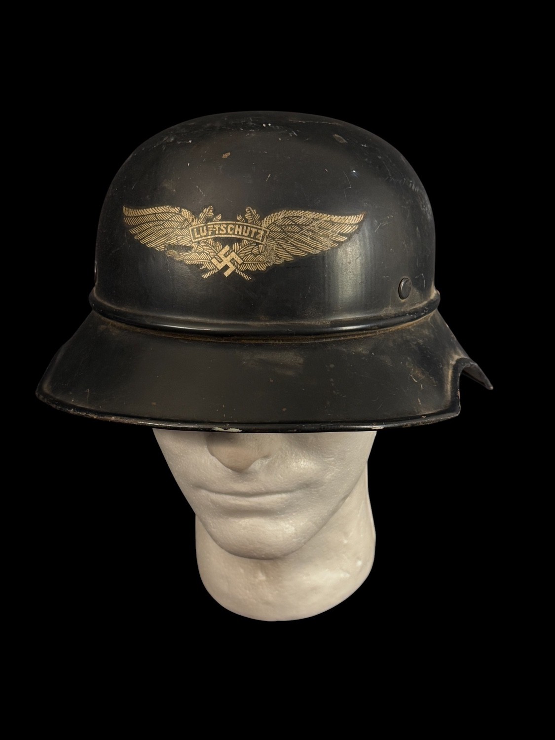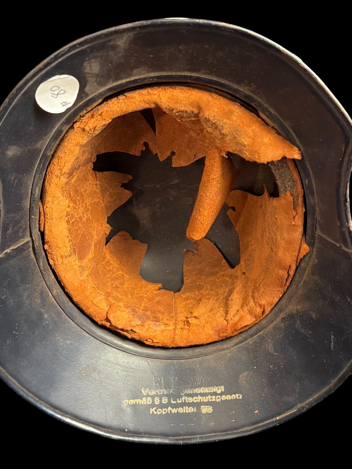 Luftschutz Gladiator Style Air Raid Helmet used by members of the German Air Protection League. This lightweight helmet is characterized by its shallow crown and its distinctive, broad, multi-stage visor and flared rim, resembling the look of an ancient gladiator s helmet. The shell retains its original black or dark blue finish and is adorned with the prominent decal for the Luftschutz , featuring a stylized winged device surrounding a central swastika, confirming its civil defense provenance. Crucially, the interior of the helmet features stamped markings RL2-39/42 and the text Vertrieb genehmigt gem§ ¤ 8 Luftschutzgesetz Distribution approved according to ¤ 8 Air Protection Law, which are official markings of the Reichsluftschutzbund and confirm its period issue. The interior liner is made of leather, which shows cracking and degradation consistent with age and storage, but its presence and the clear exterior decal make this a superior example of German air raid protection gear.