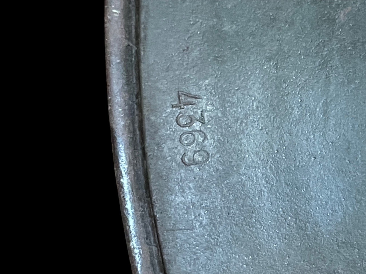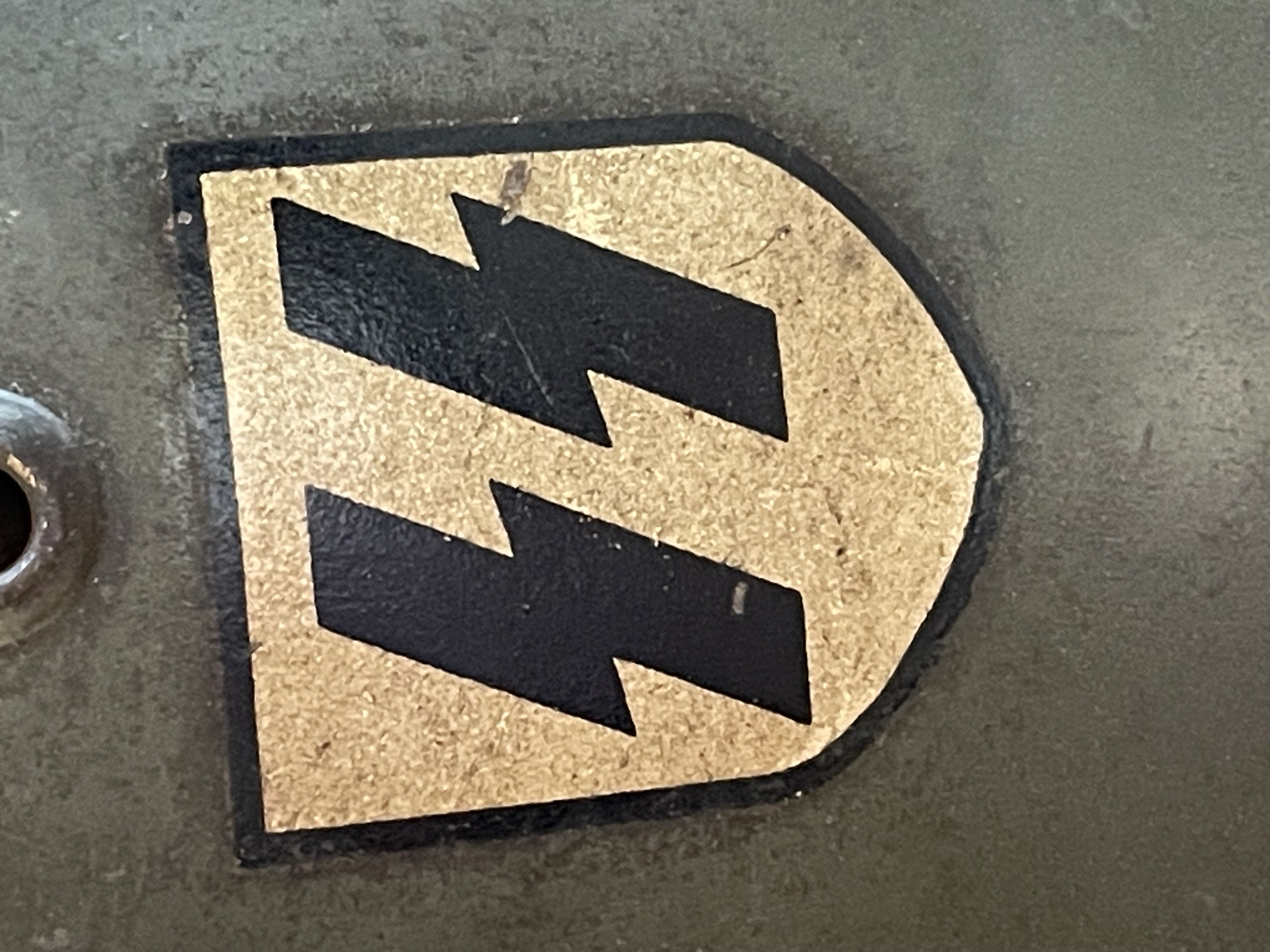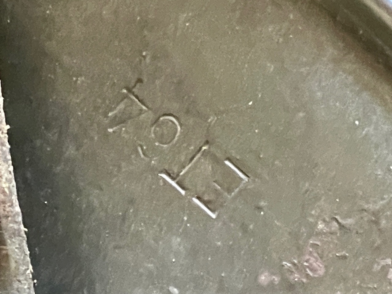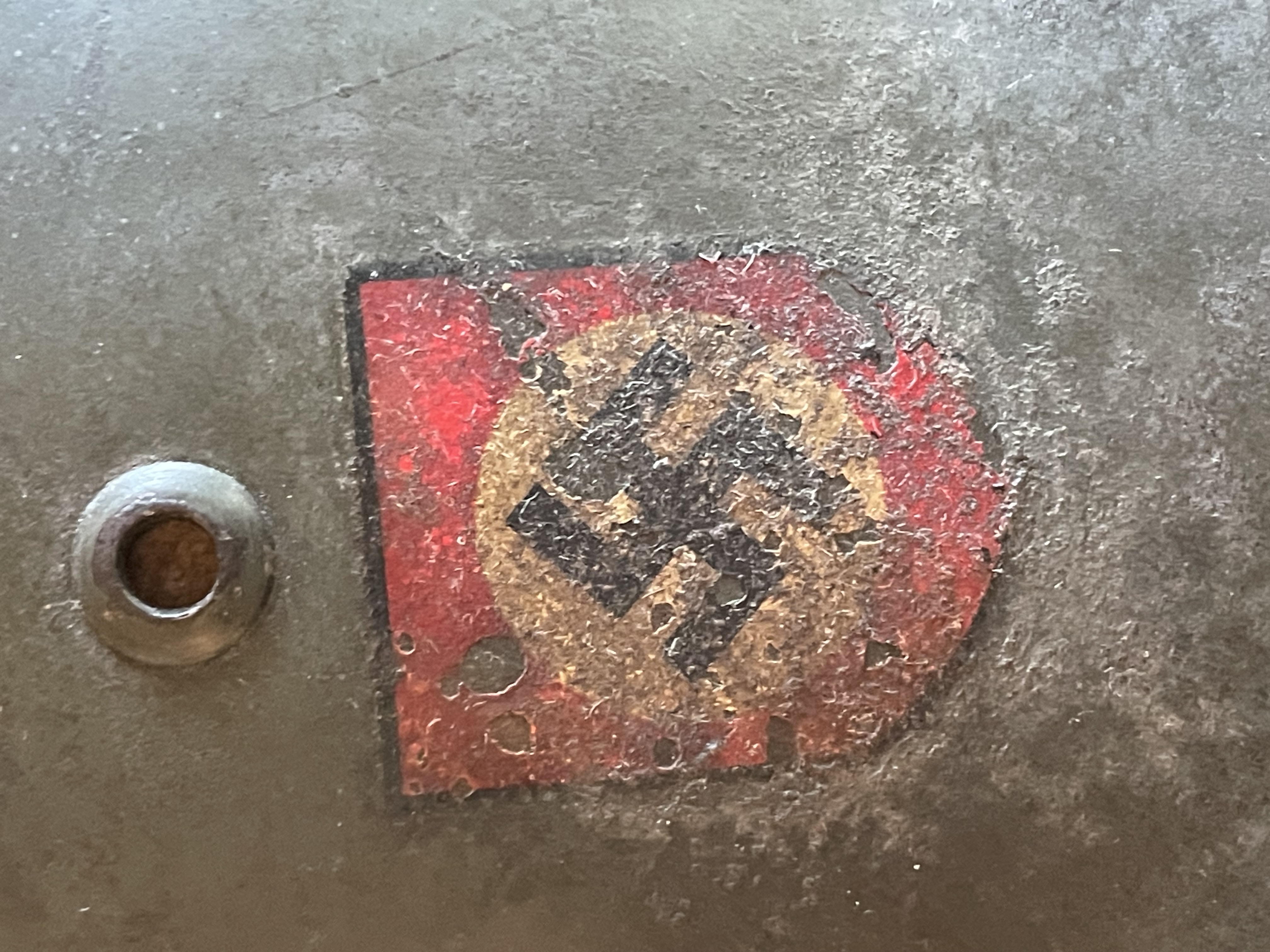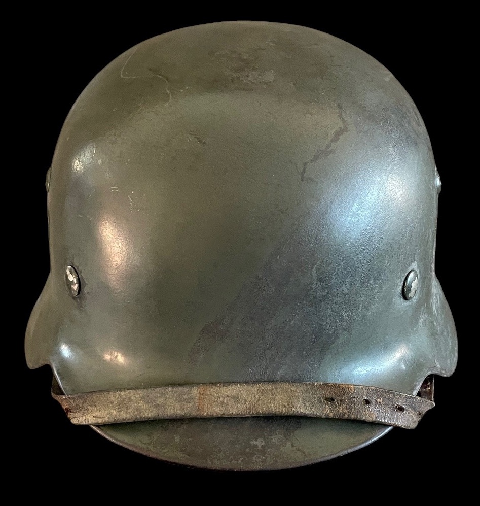 A highly original WWII German M40 steel combat helmet bearing both the SS runes and national shields, retaining its wartime apple green finish and full interior fittings. The shell is stamped ET 66 Eisenhttenwerke Thale, size 66 with lot number 4369, placing production circa 1940 – 41. Both decals are period-applied and exhibit authentic toning beneath the paint surface Ñ the runic shield on the right side remaining strong and well-defined, while the national tricolor retains partial red and black tones under an aged surface.