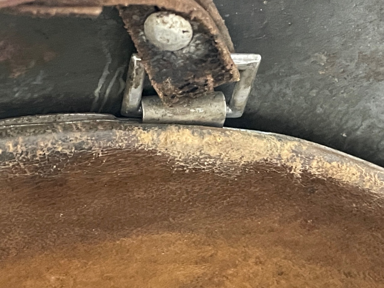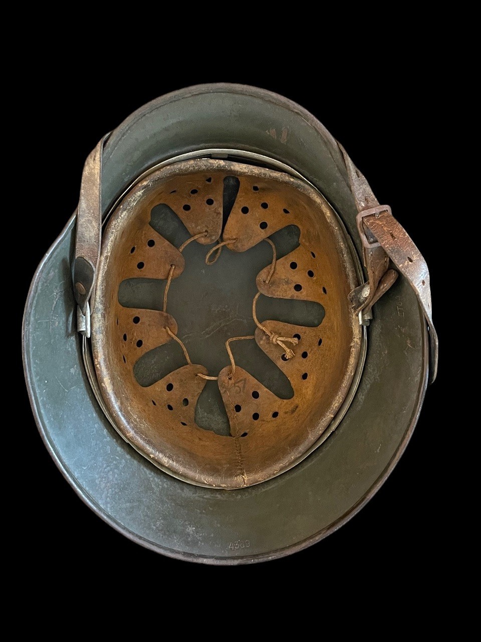 The helmet retains its complete leather liner assembly, showing darkened wear from use, and the original full-length chinstrap secured by aluminum liner bales. The exterior paint exhibits an undisturbed patina with light abrasions and minor oxidation, consistent with age and service. This configuration represents a classic field-worn early-war Waffen-SS issue helmet prior to the 1943 directive eliminating the national shield.
