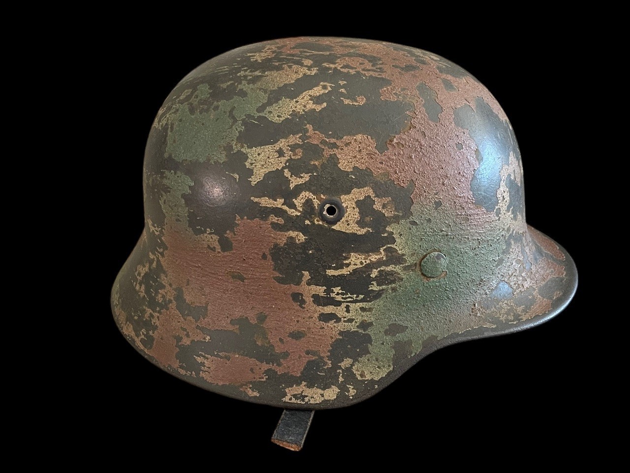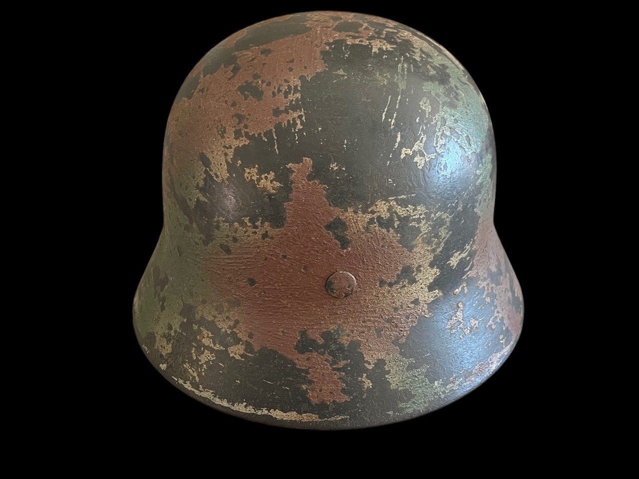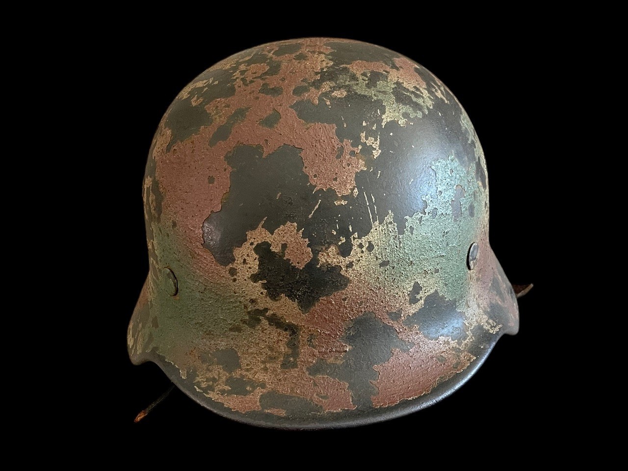 The helmet was originally a Single Decal SD type. The Wehrmacht Army Eagle decal would typically have been applied beneath the camouflage, and is either completely covered or removed, as was common practice when camouflage paint was applied in the field.