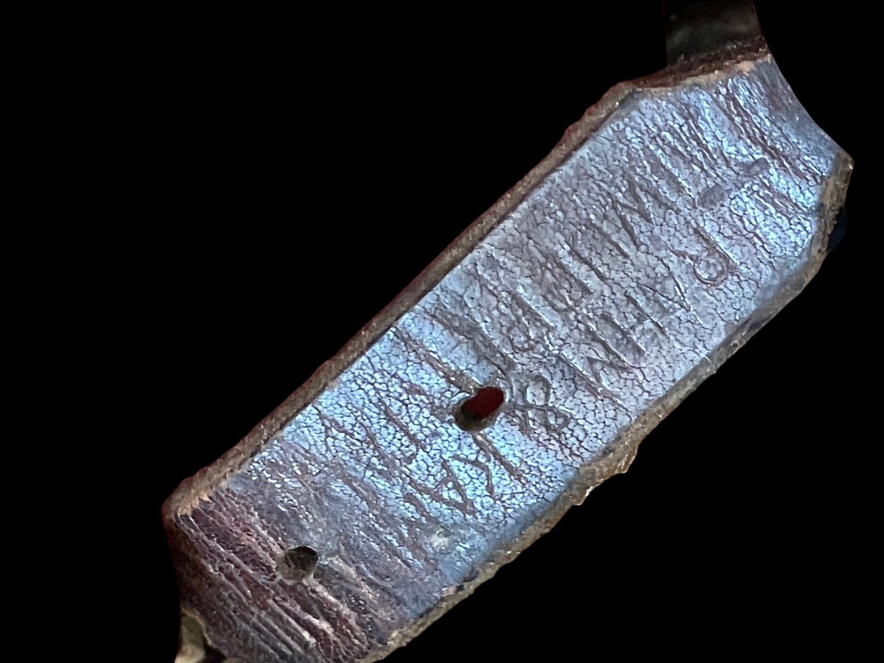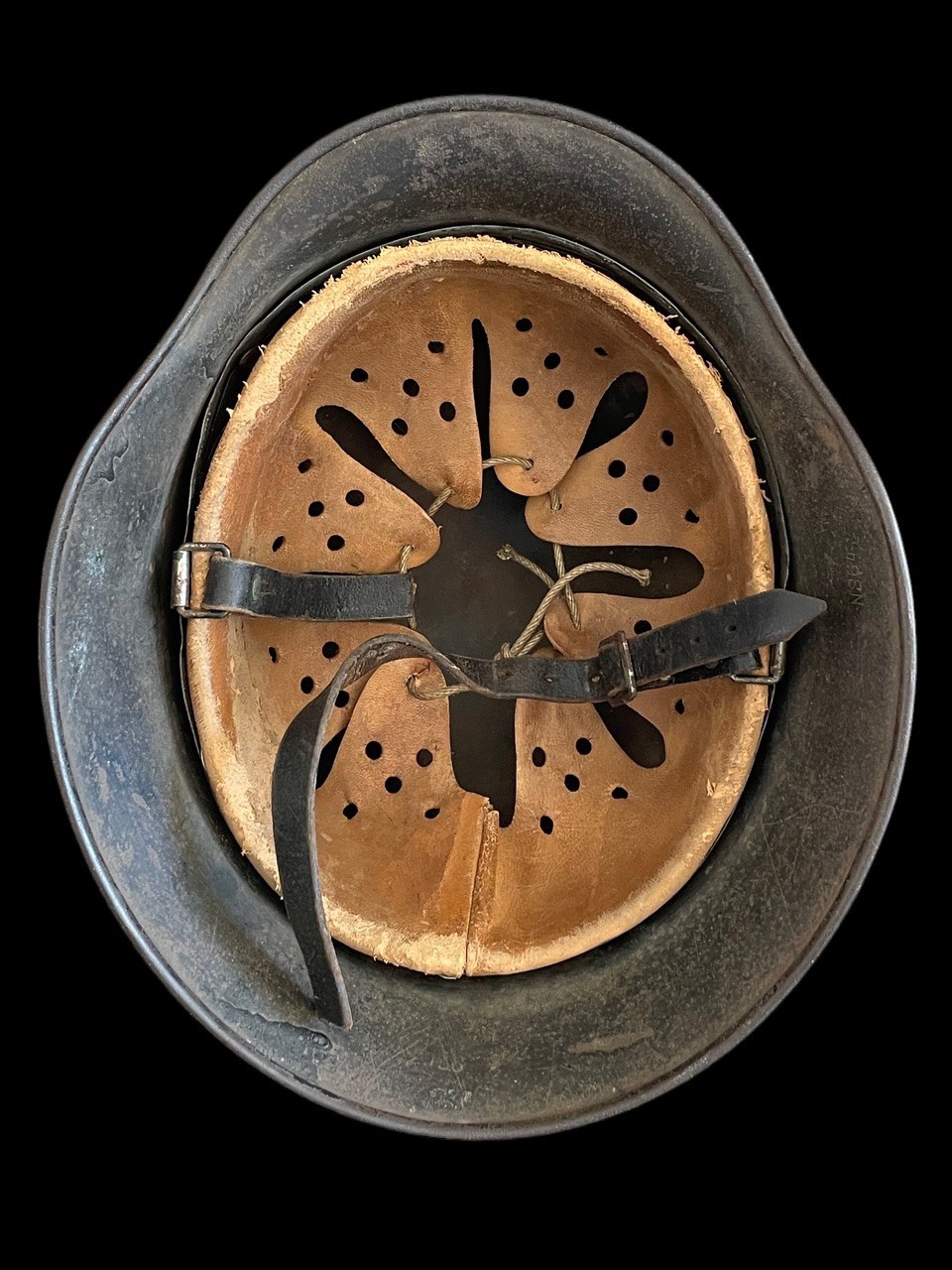 The interior is complete and retains its original components, including the zinc-plated steel liner band and the original leather liner. The leather liner is well-preserved, showing a warm brown patina, perforations for ventilation, and expected aging from use. Importantly, this helmet retains its original, full-length leather chinstrap, which is properly affixed to the liner band. The chinstrap displays legible manufacturer markings on the metal buckle and the expected wear.