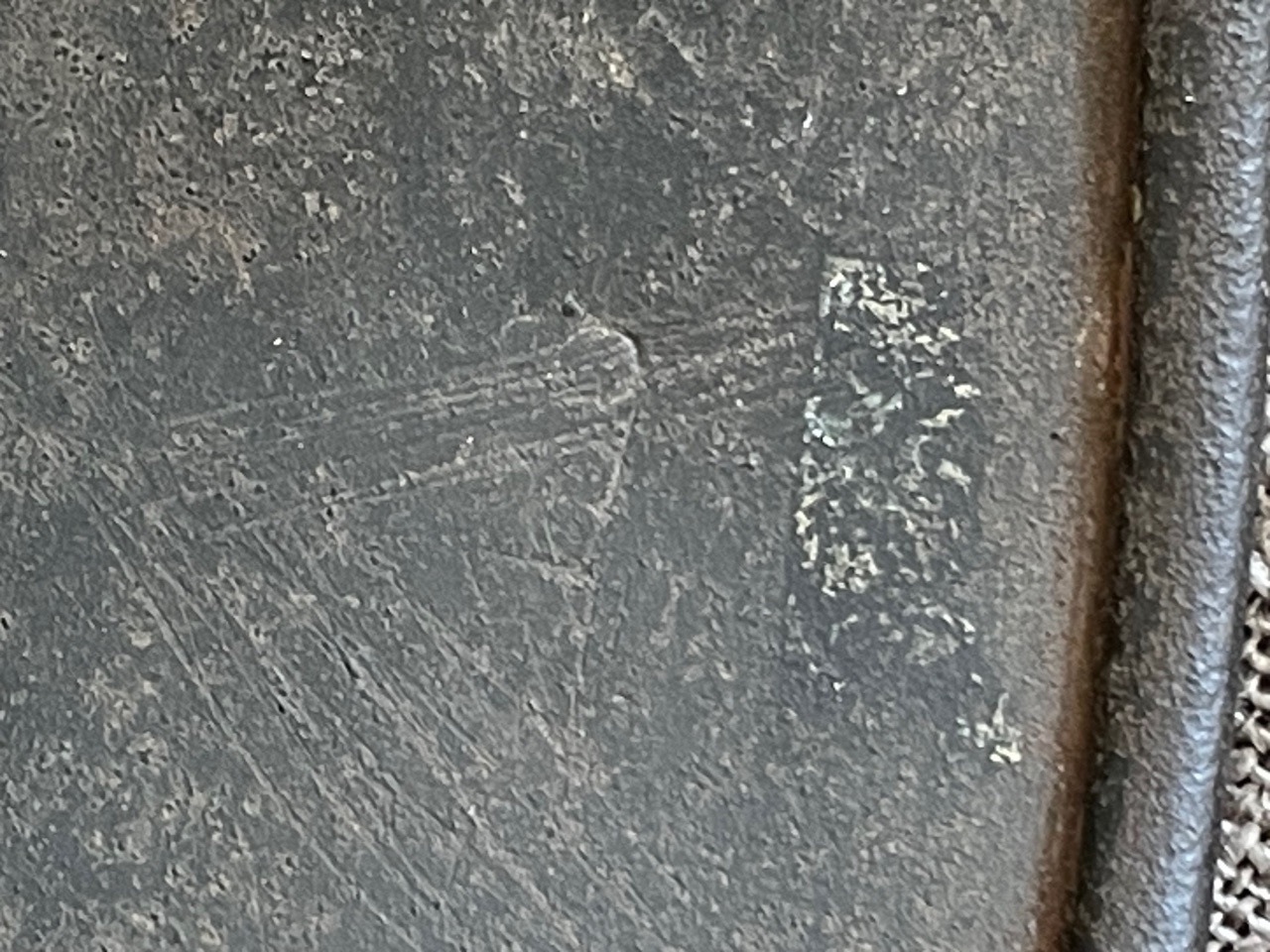 This M40 camouflage helmet is a classic, untouched -veteran- piece, highly valued for its striking and authentic three-color camouflage, desirable large shell size, and completeness with the original chinstrap.