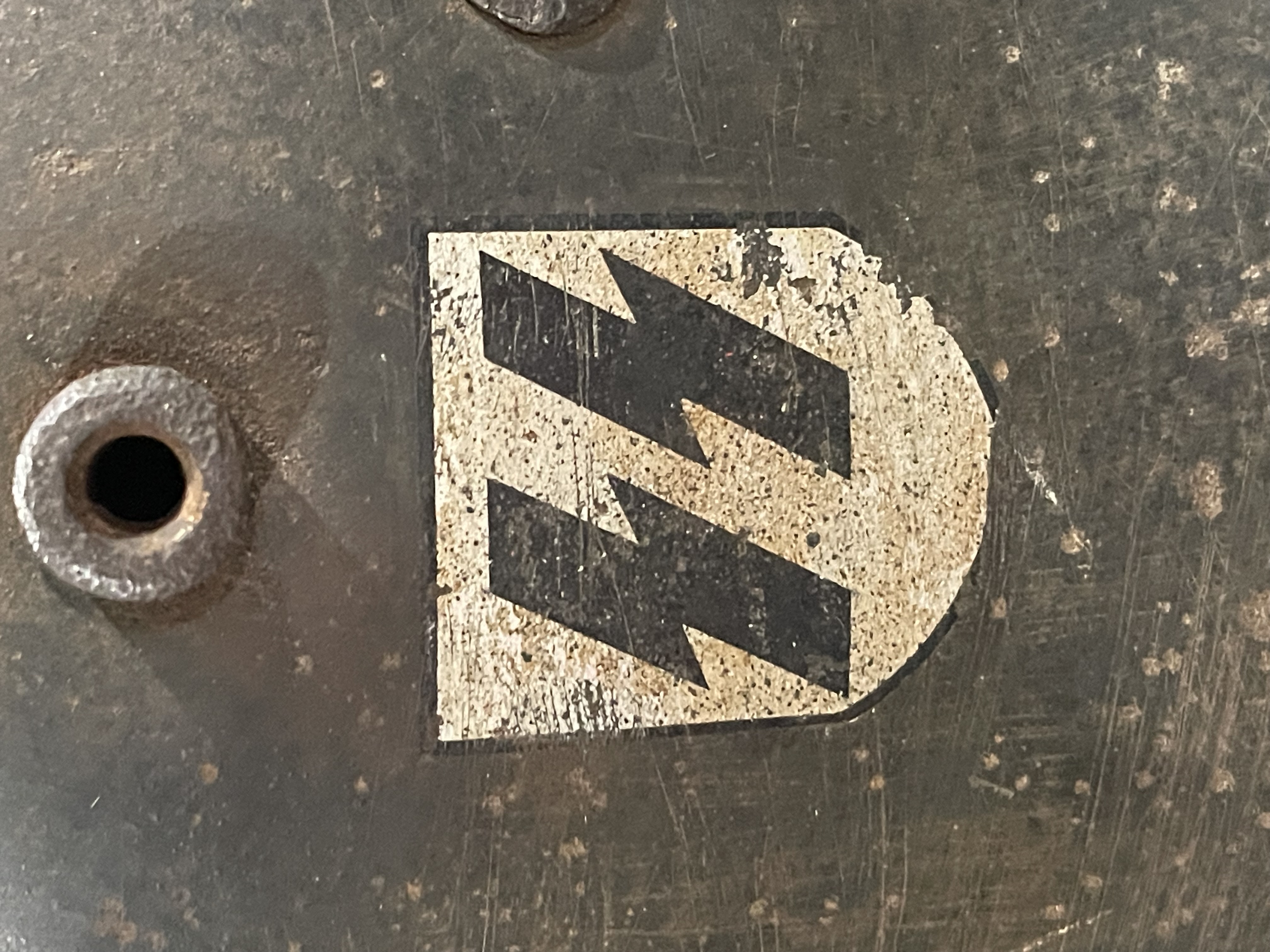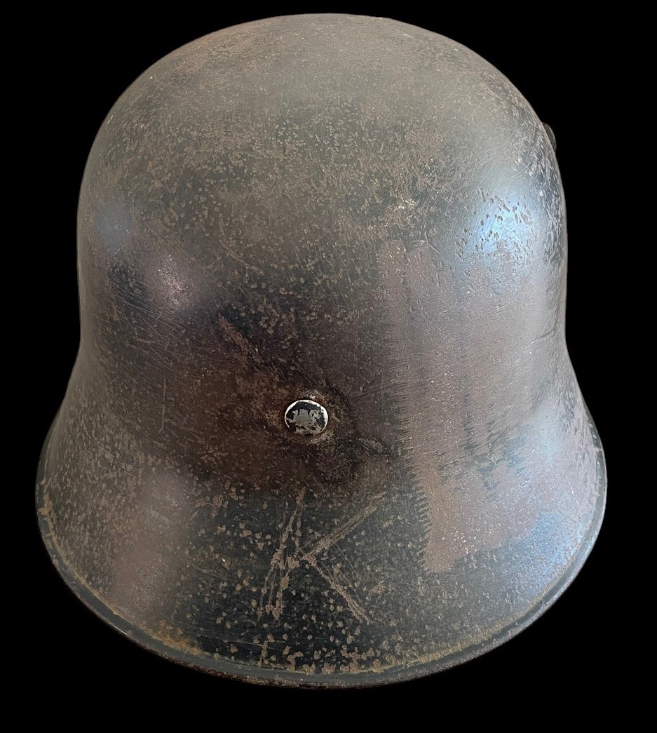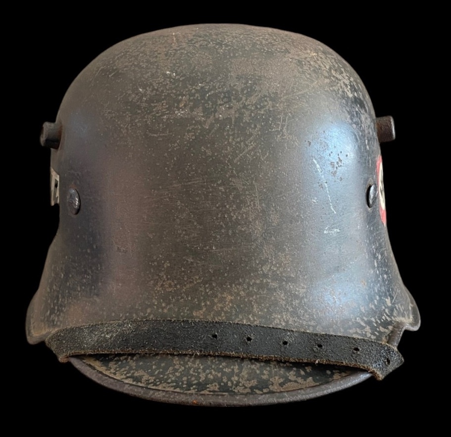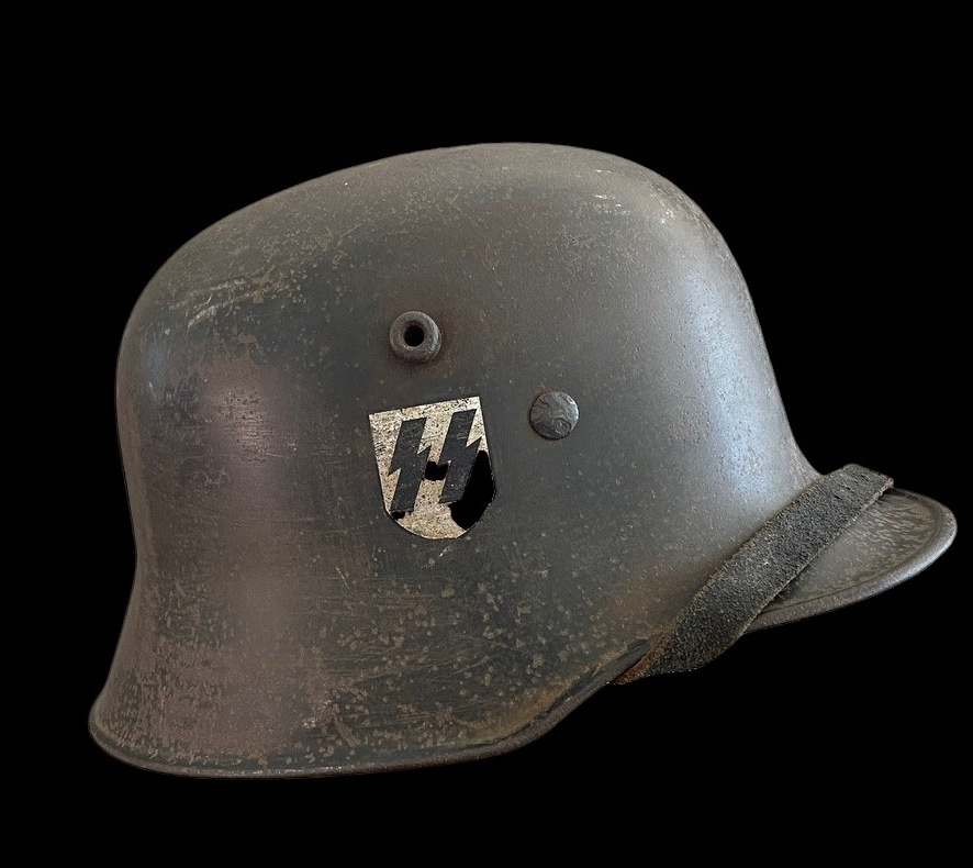The helmet is distinctive for its dual decals. The left side features the powerful and iconic SS runes shield, the hallmark of the Schutzstaffel. The right side displays the Party shield, featuring the national colors surrounding a central swastika. This decal configuration is correct for early SS helmets before the standardization of the M35. The decals show significant age, wear, and patina consistent with the shell s original factory paint and field use. The condition of these decals is paramount to value.