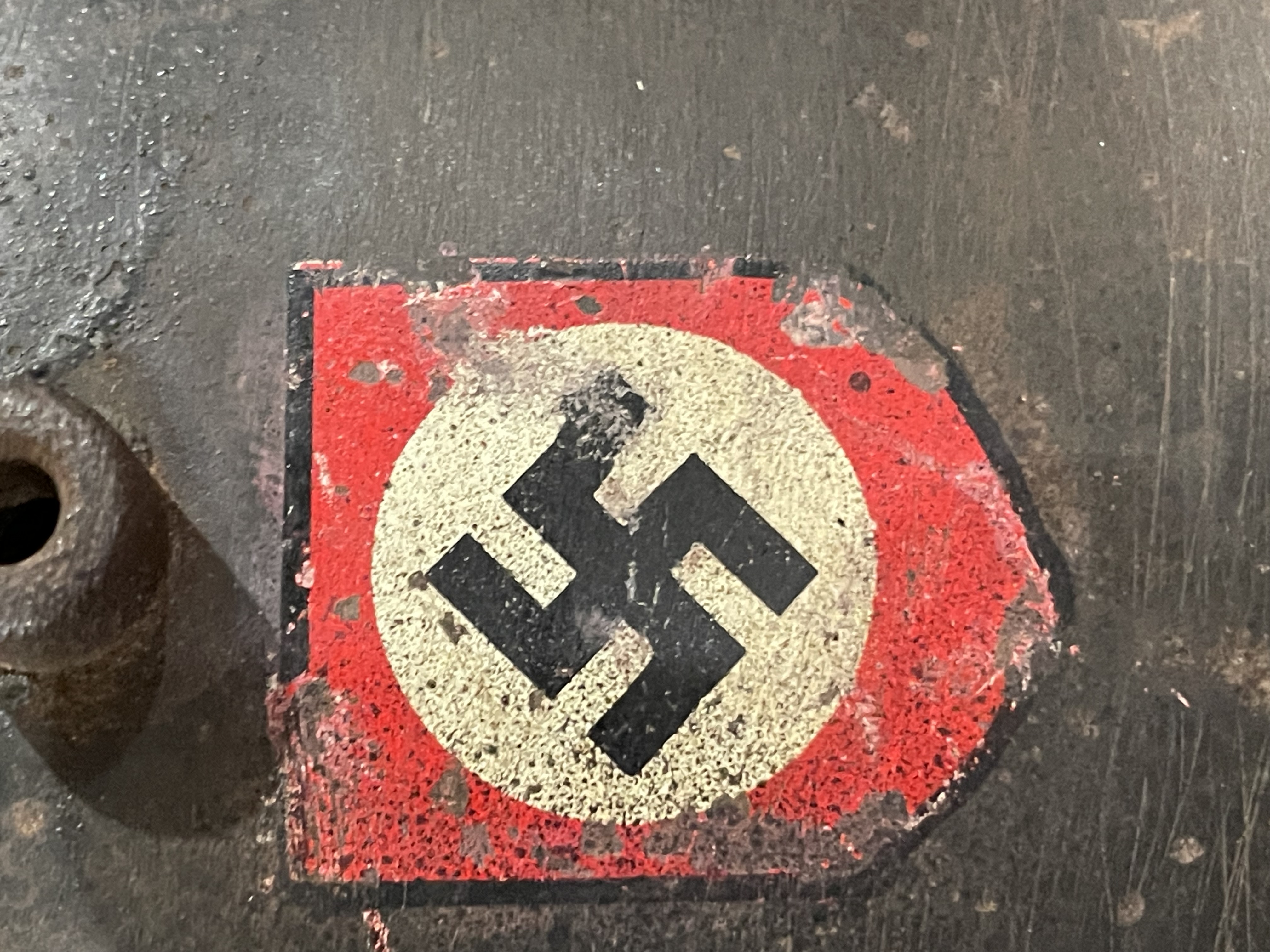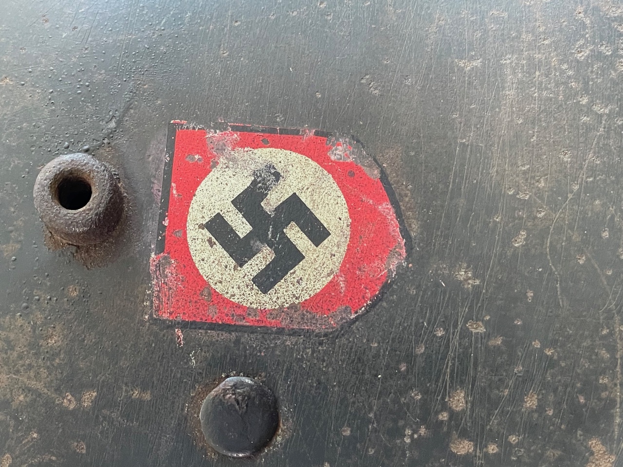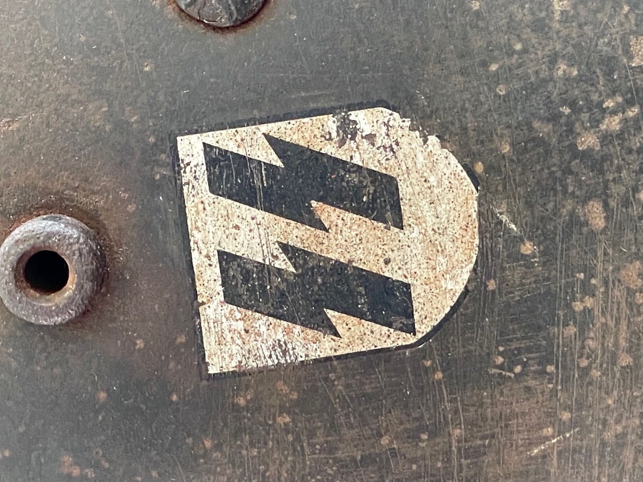 The helmet is distinctive for its dual decals. The left side features the powerful and iconic SS runes shield, the hallmark of the Schutzstaffel. The right side displays the Party shield, featuring the national colors surrounding a central swastika. This decal configuration is correct for early SS helmets before the standardization of the M35. The decals show significant age, wear, and patina consistent with the shell s original factory paint and field use. The condition of these decals is paramount to value.