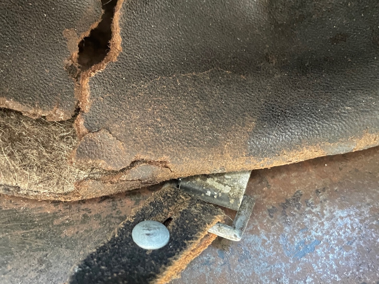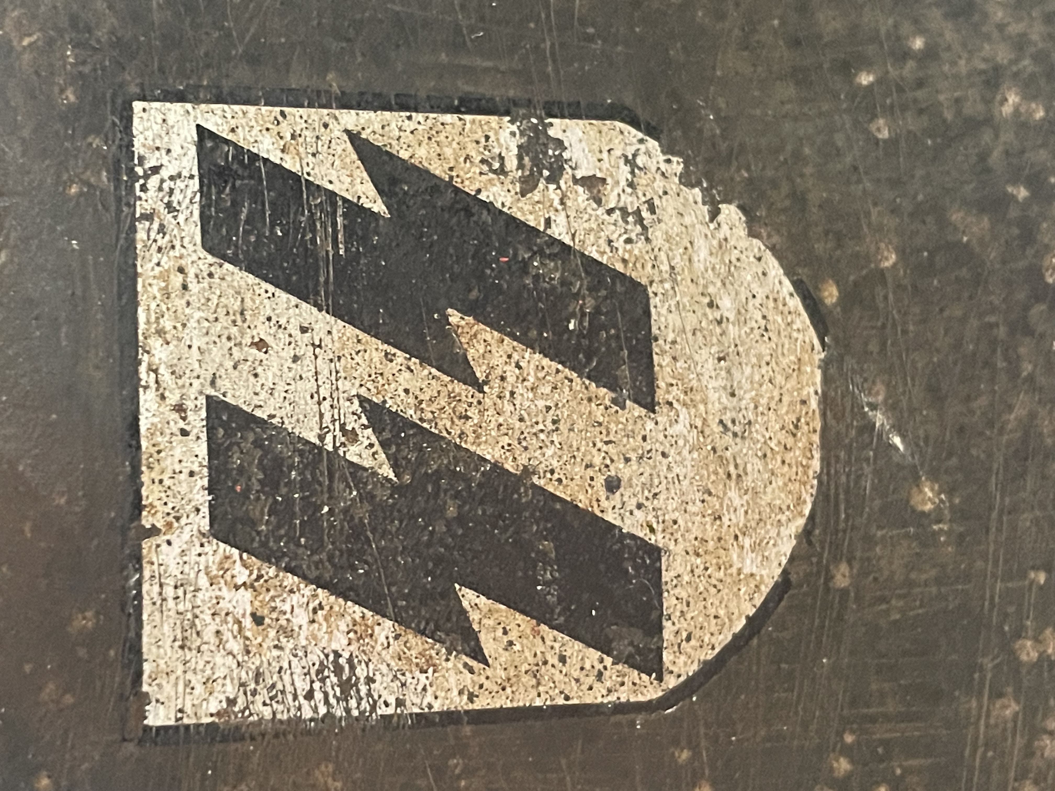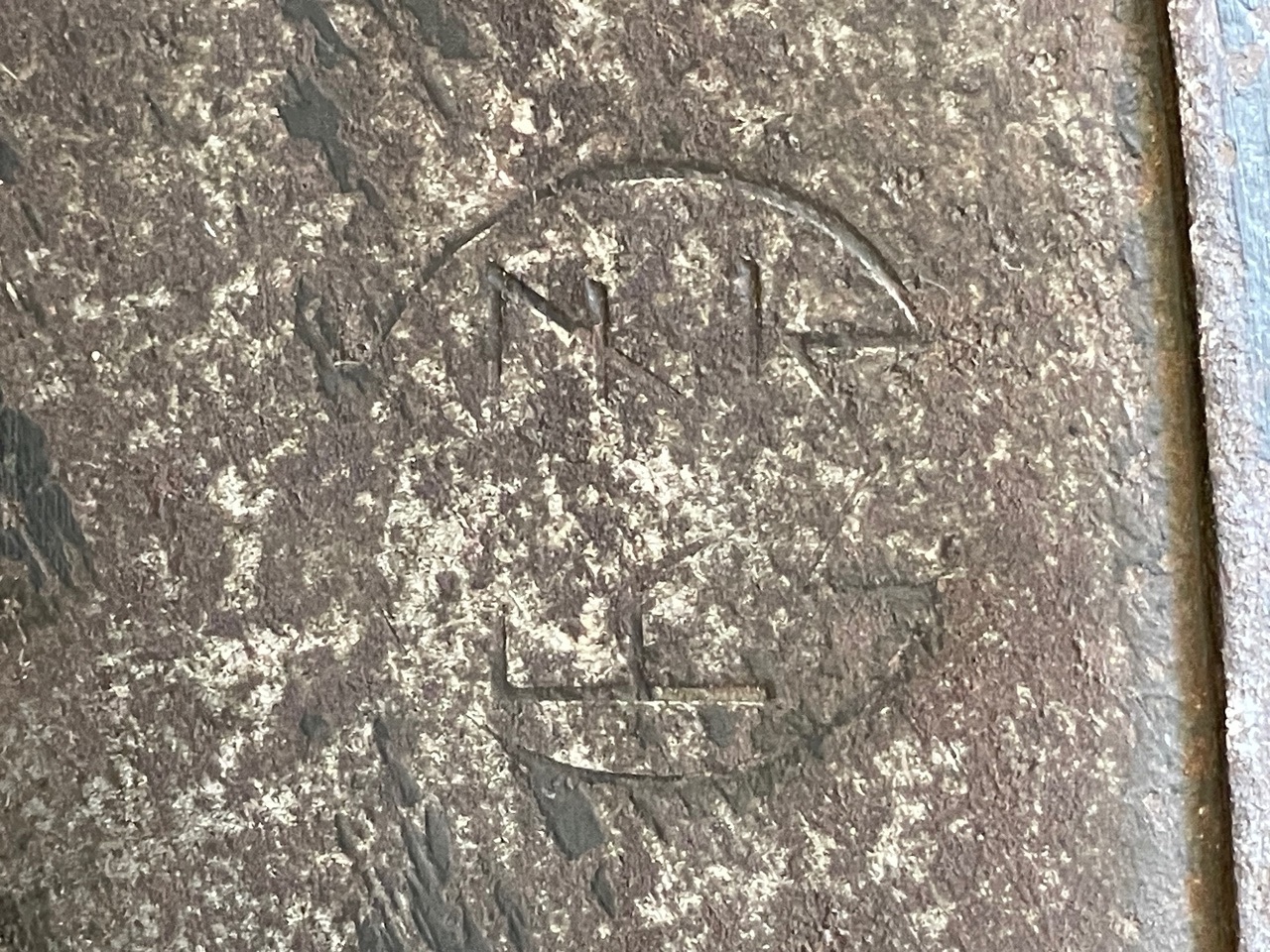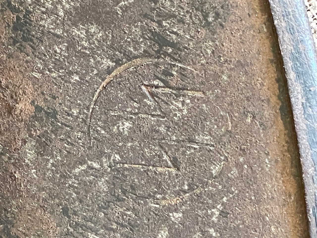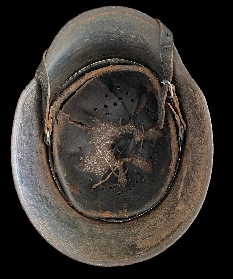 Close inspection of the helmetÕs interior reveals a legible factory mark. The images suggest a stamping, possibly F.W.T. or F.Z. inside a circle, often associated with a size or maker mark found on early shells. The M31 liner is present, showing heavy deterioration, dryness, and cracking of the leather, indicative of genuine age and decades of storage. The original chinstrap is also present though heavily worn. The overall appearance is that of an untouched, veteran-acquired piece with a deeply aged patina.