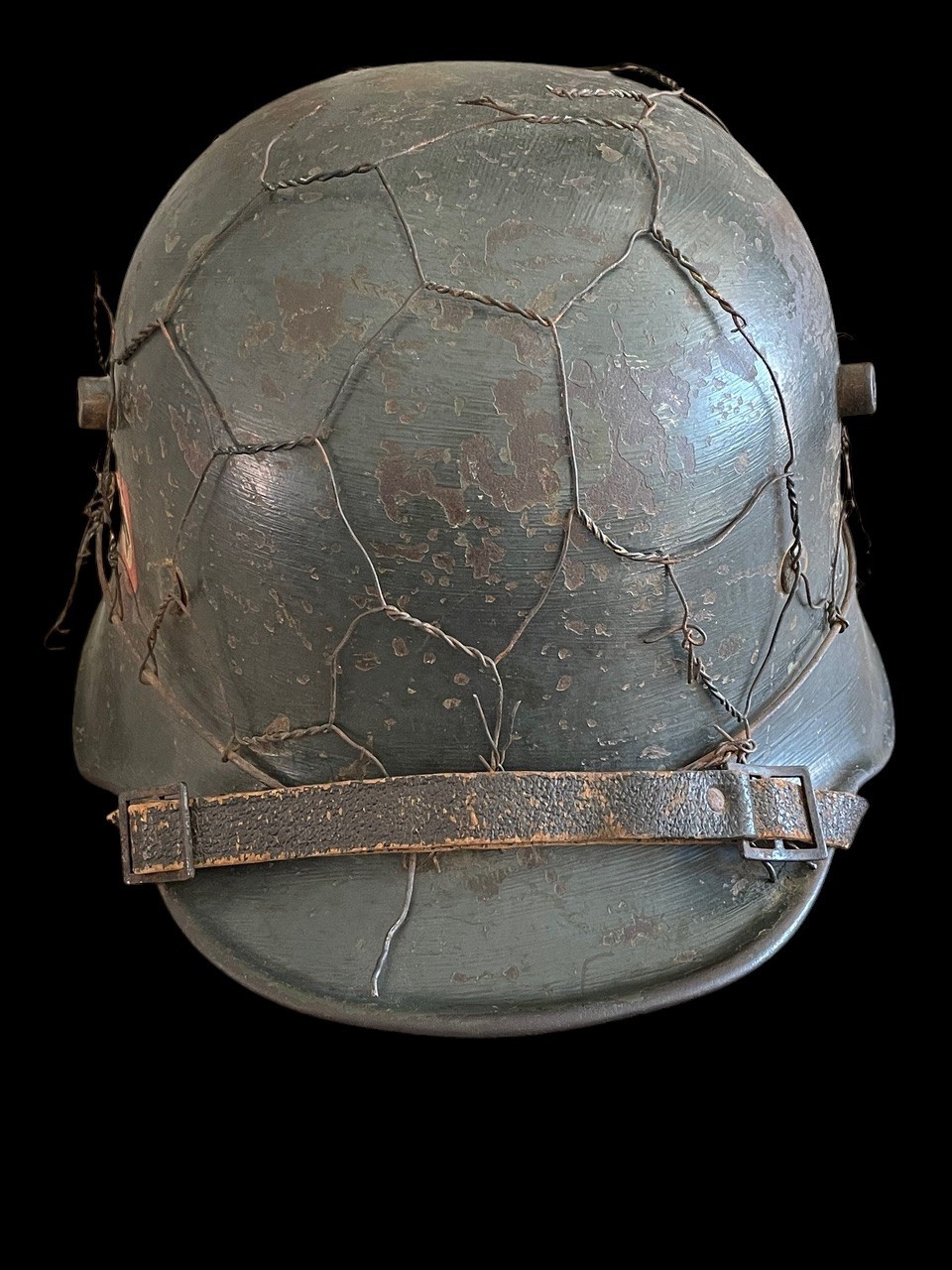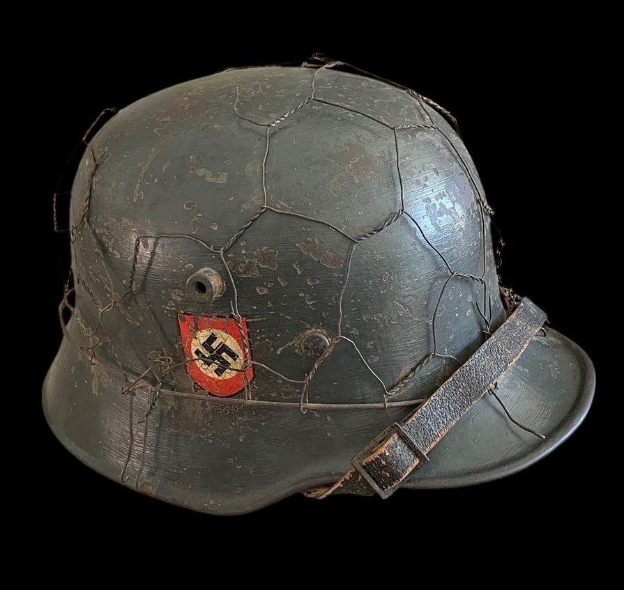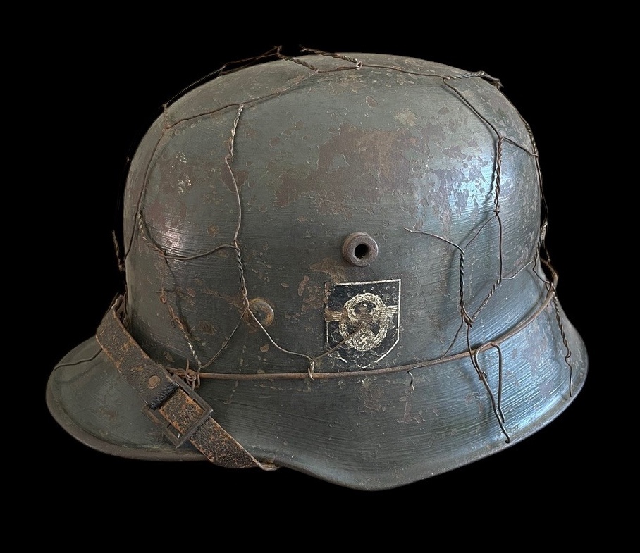 Crucially, this helmet retains both original, period-applied decals beneath the wire: on the wearer s right side is the National Colors Shield decal Black, White, and Red, with the central Swastika, estimated to be approximately 70-80% intact. On the wearer s left side is the Ordnungspolizei Eagle Decal, featuring the black shield with the silver/gold police eagle and wreathed swastika, estimated to be approximately 80% intact. The decals are visible despite the weathering and the securing wire.