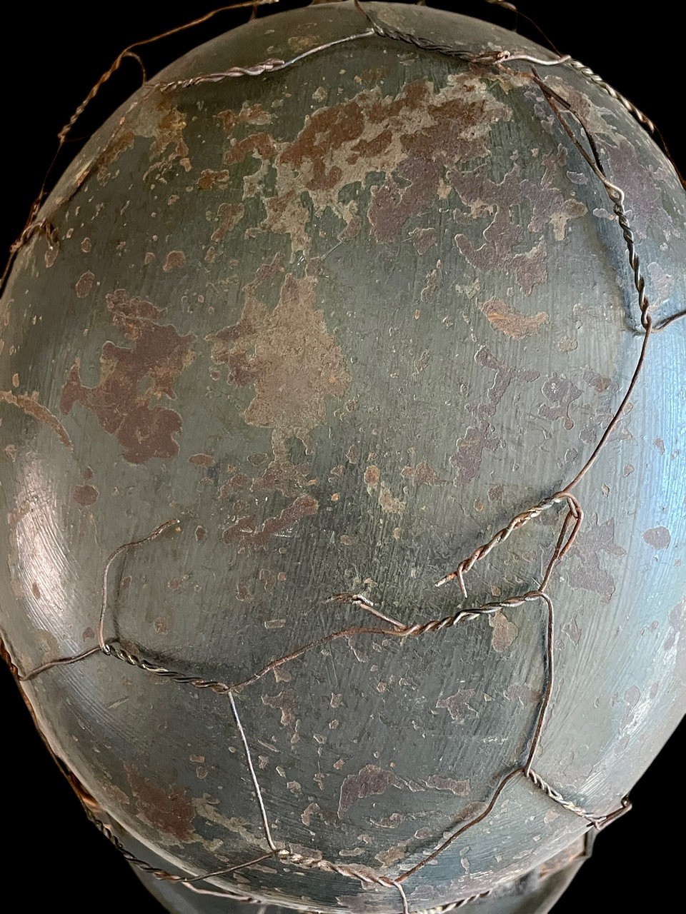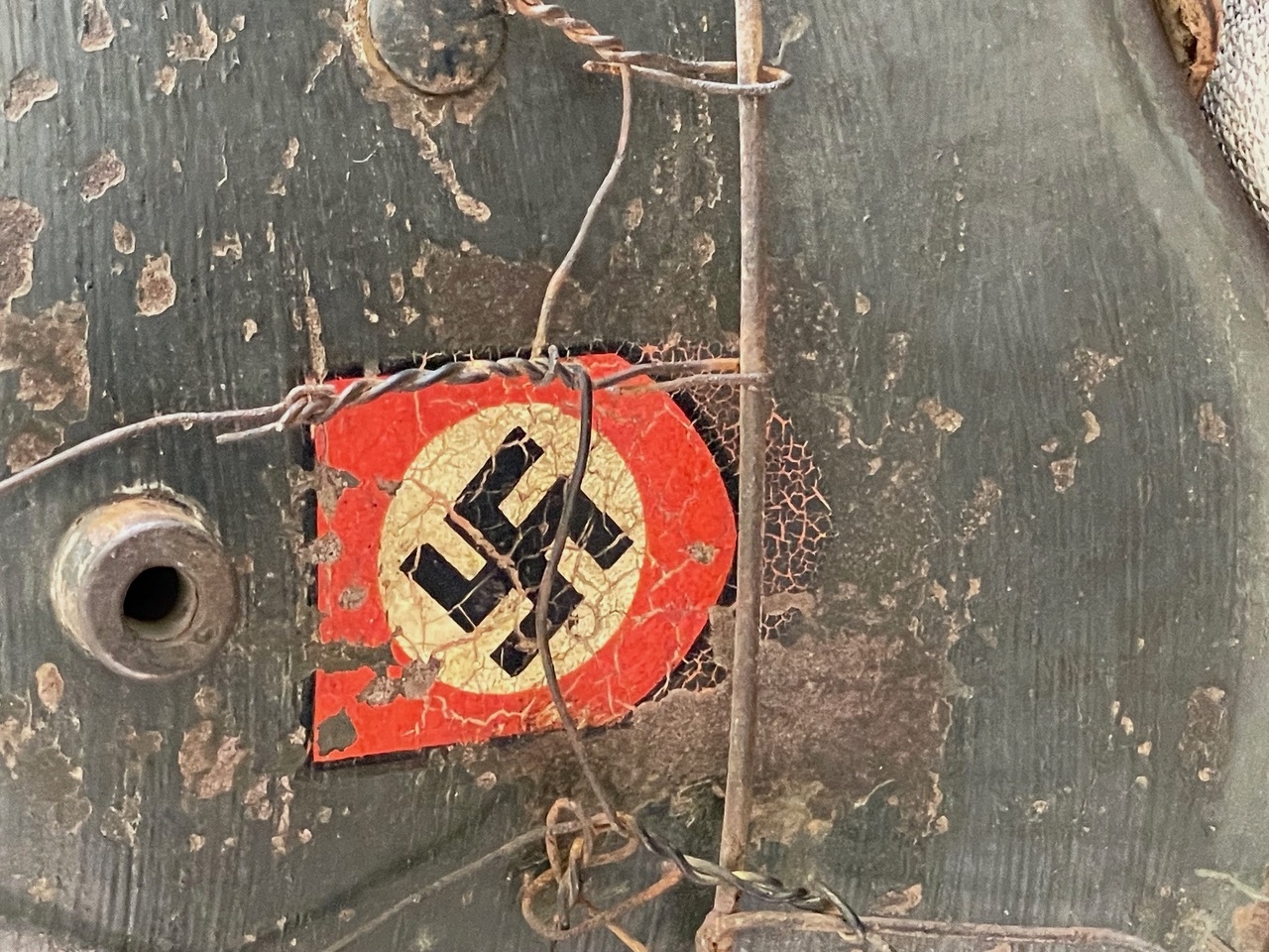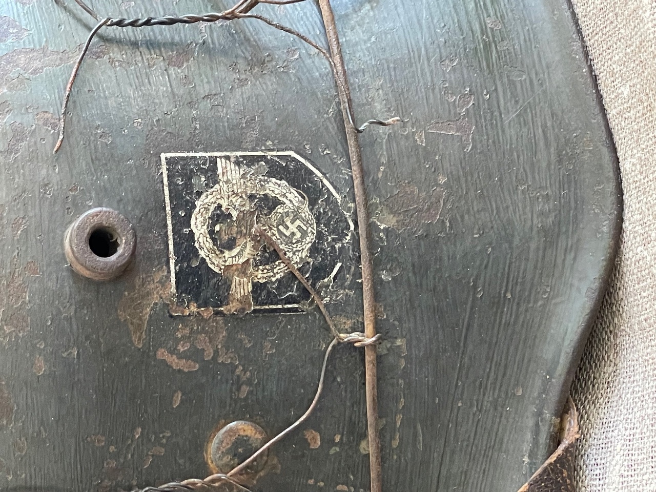 Crucially, this helmet retains both original, period-applied decals beneath the wire: on the wearer s right side is the National Colors Shield decal Black, White, and Red, with the central Swastika, estimated to be approximately 70-80% intact. On the wearer s left side is the Ordnungspolizei Eagle Decal, featuring the black shield with the silver/gold police eagle and wreathed swastika, estimated to be approximately 80% intact. The decals are visible despite the weathering and the securing wire.