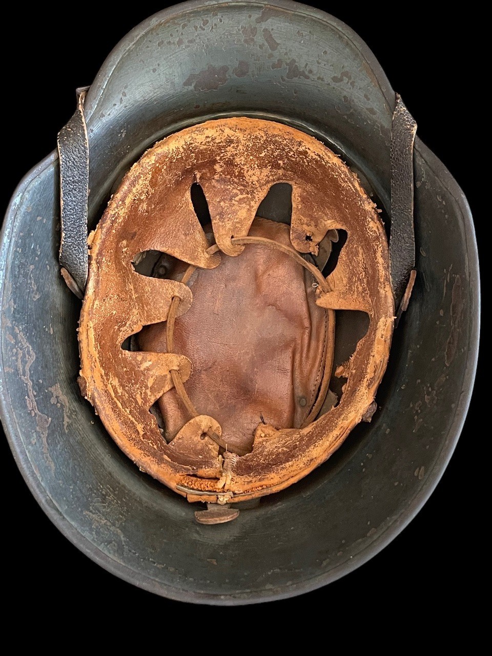 The interior retains a post-WWI or early WWII-era liner system, secured to the shell. The leather liner is complete, showing heavy drying, discoloration, and a darker patina consistent with years of use. The helmet retains its brown leather chinstrap which utilizes the M18-style lugs for attachment via a period aluminum clip/bail system, a hallmark of these rare transitional police helmets. The chinstrap is complete with its aluminum buckle and shows appropriate aging.