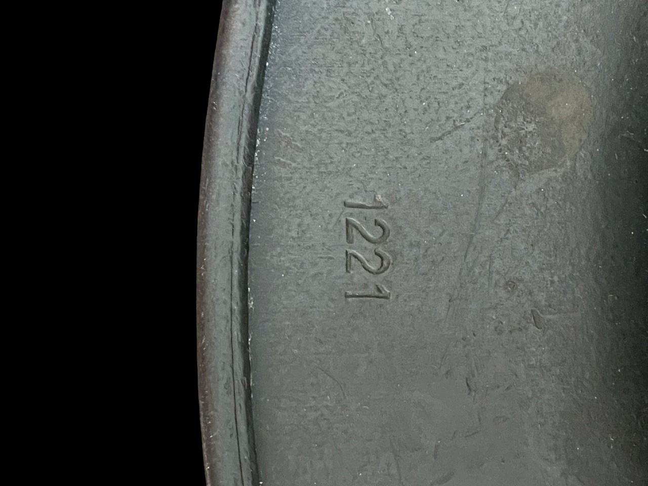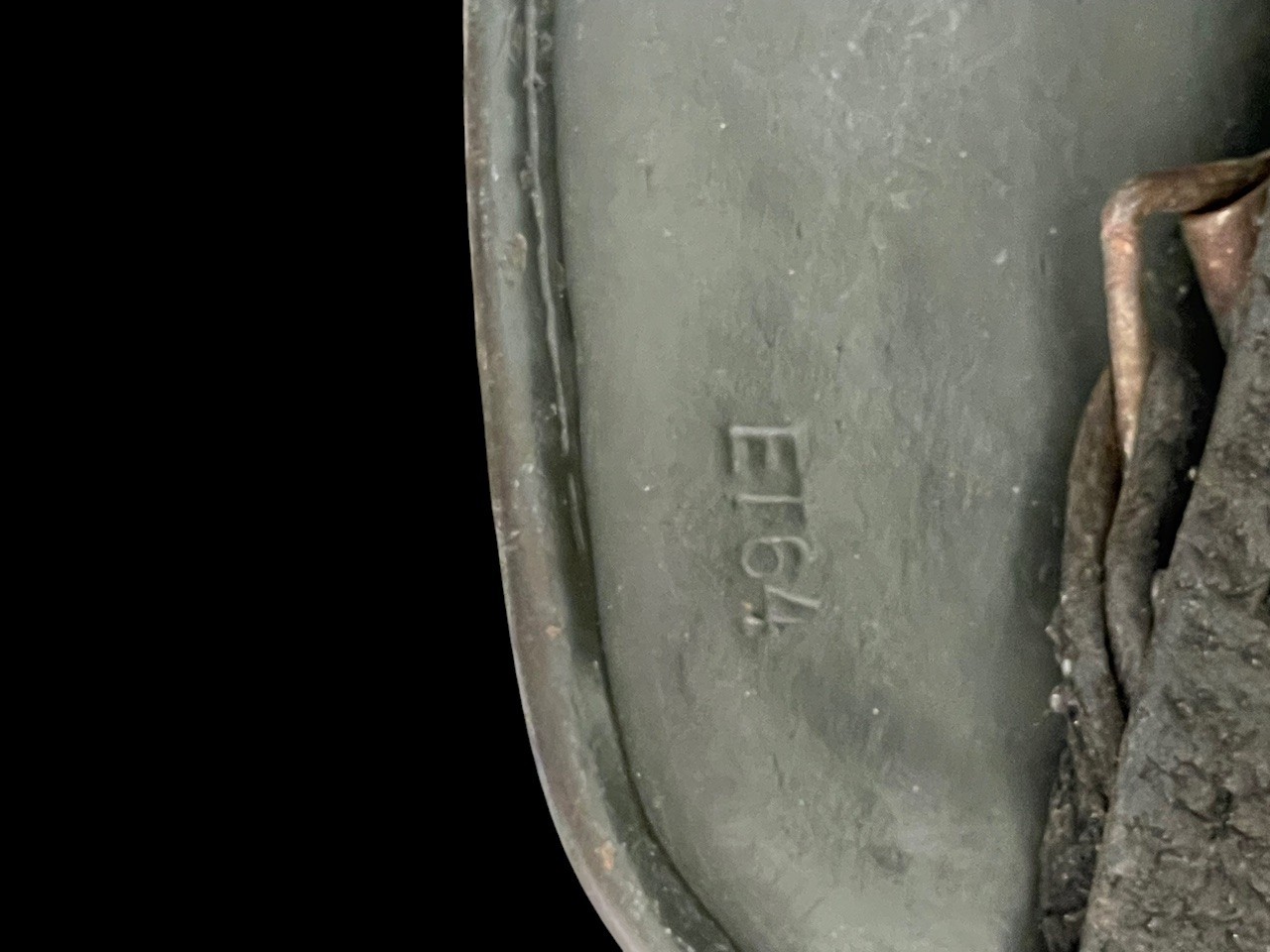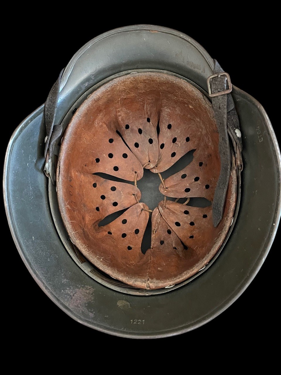 The exterior shows only light service wear and surface handling consistent with a carefully stored wartime piece, while the paint remains bright and smooth with minimal oxidation. The interior retains its original liner and chinstrap assembly, both untouched and showing honest patina. The leather liner is intact and supple, showing natural darkening from age, with all eight tongues present and secured by the original drawstring. The liner band and rivets remain unmoved and unpolished, with factory oxidation to the steel components. The chinstrap is complete and exhibits typical wear from light use, with no repairs or replaced hardware. Shell markings are clear and legible, with the ET64 manufacturer code indicating Thale production and lot stamp 1221 placing it in mid-war output. The decal is not a toned Heer version.