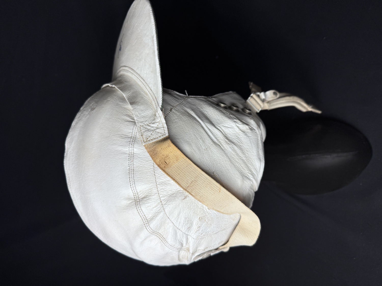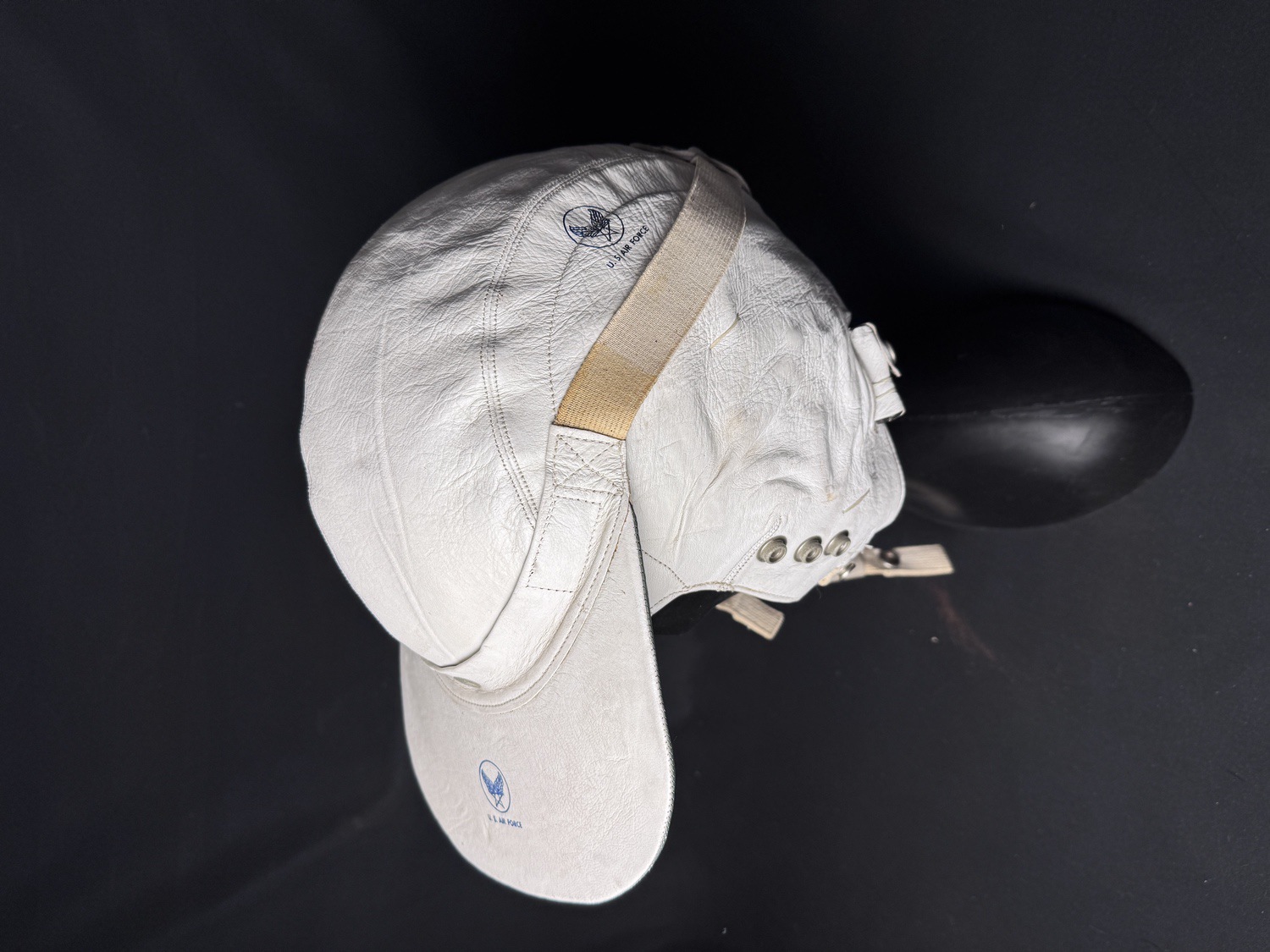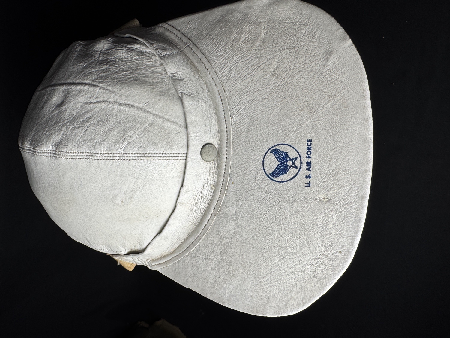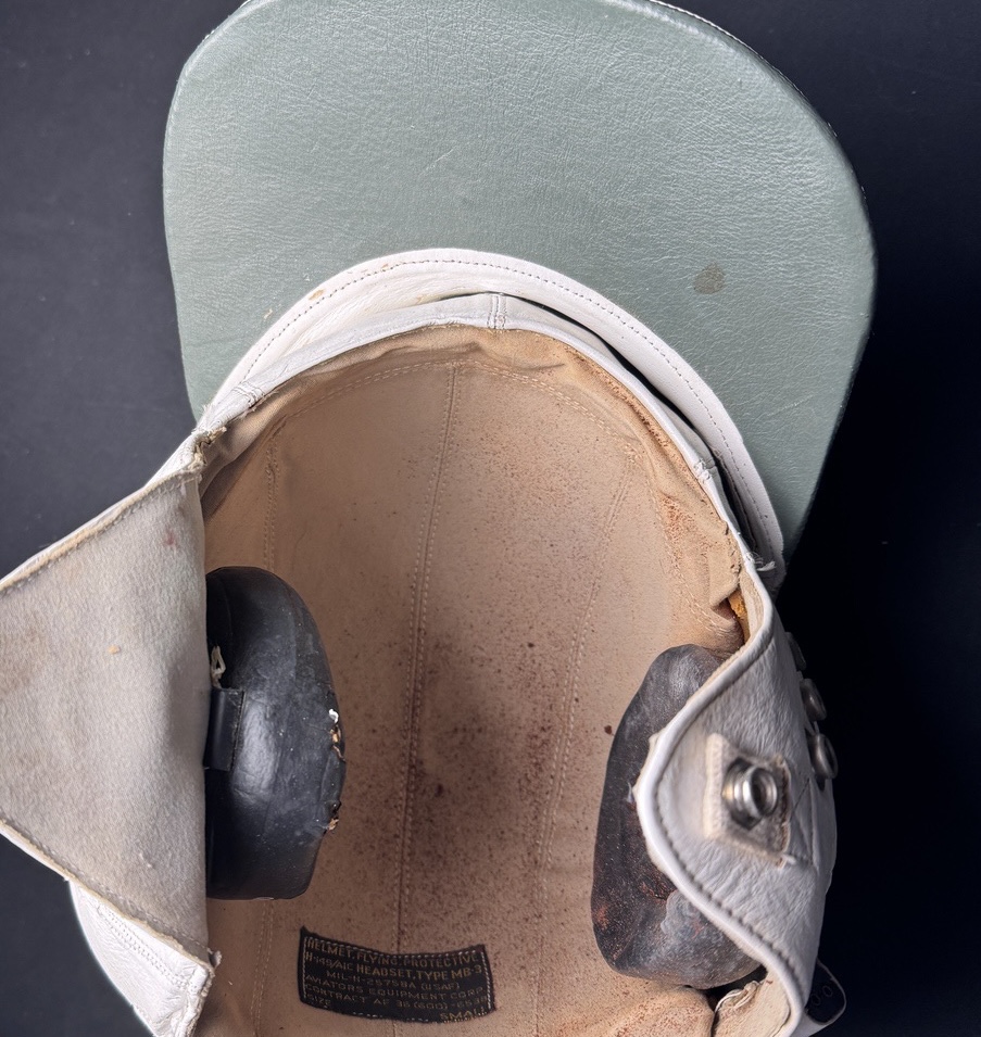 This lot features a rare and distinctive piece of Cold War aviation history: an Original US Air Force USAF Protective Flying Helmet H-149/AIC Headset, Type MB-3. These unique helmets were primarily worn by bomber and transport crews and personnel in non-ejection seat aircraft during the early to mid-Cold War era. The helmet is constructed of soft, white or off-white leather in a distinct baseball cap style with an integrated, snap-fastened ear flap assembly for communication equipment. The helmet shows clear signs of age and use, including scuffing on the leather and some discoloration, particularly on the internal lining and canvas straps. A prominent feature is the blue USAF logo and U.S. AIR FORCE stamping on the front visor. The visor itself is wide and stiff, designed for sun protection, with a contrasting greenish-gray underside.
