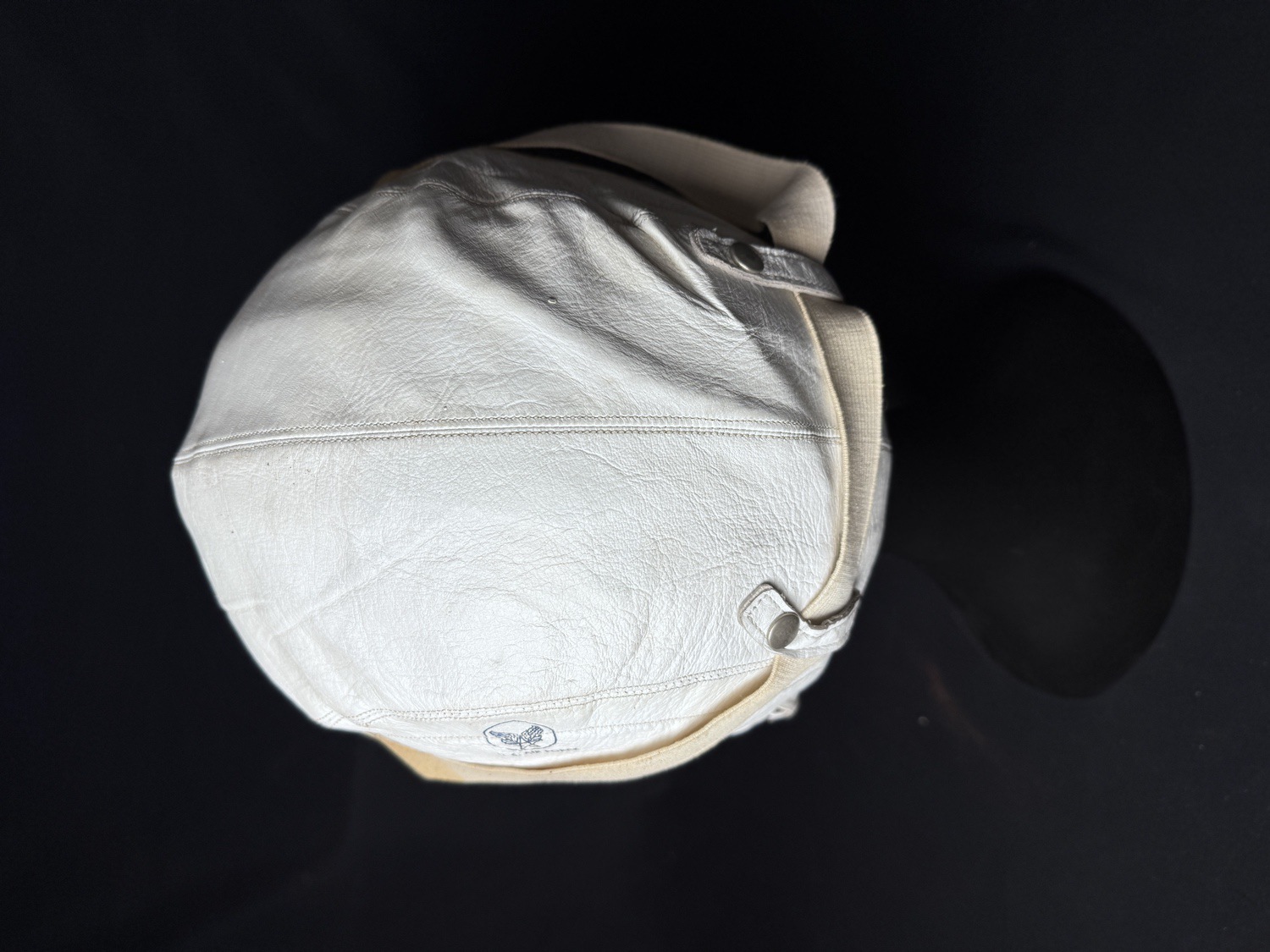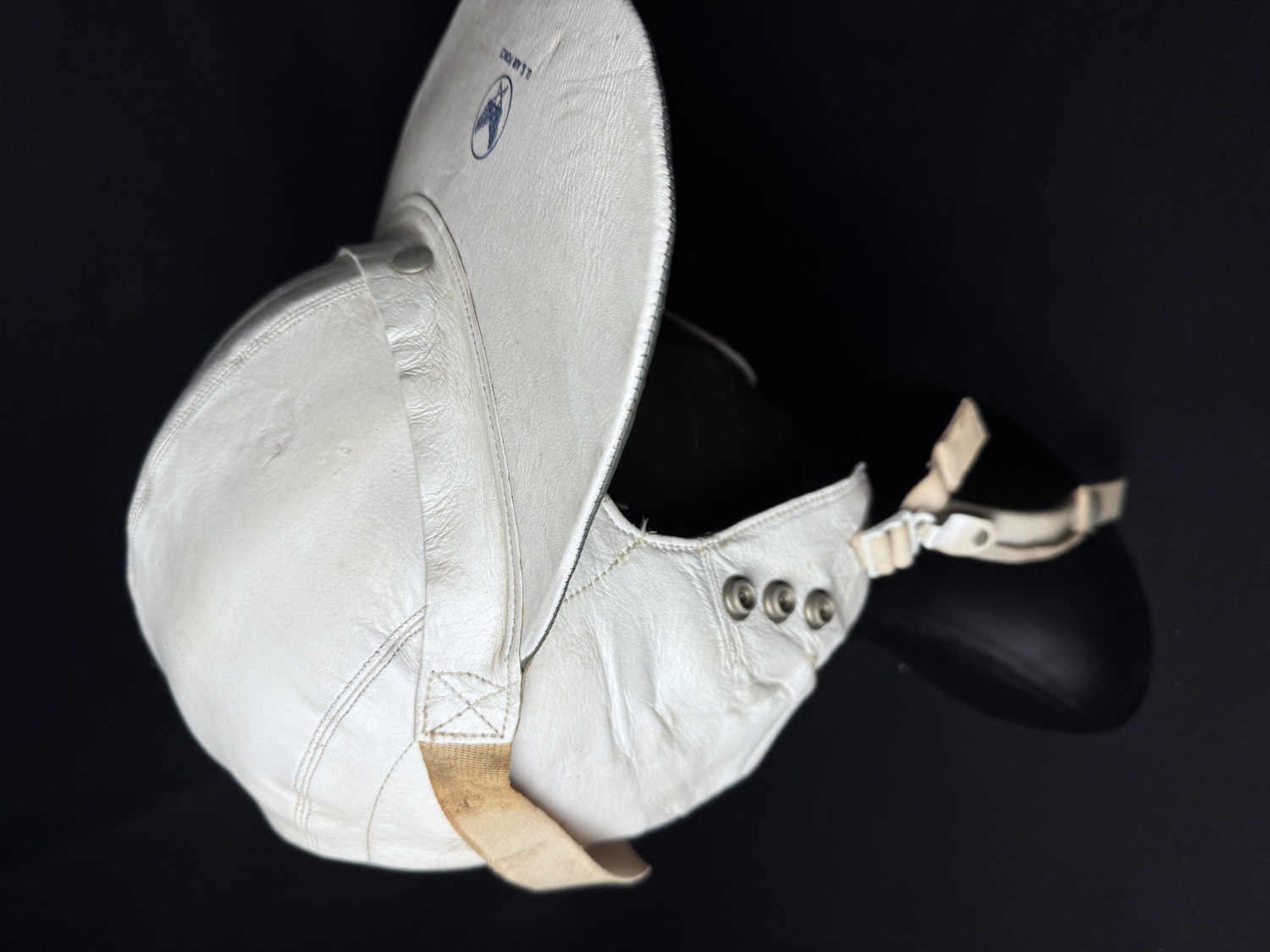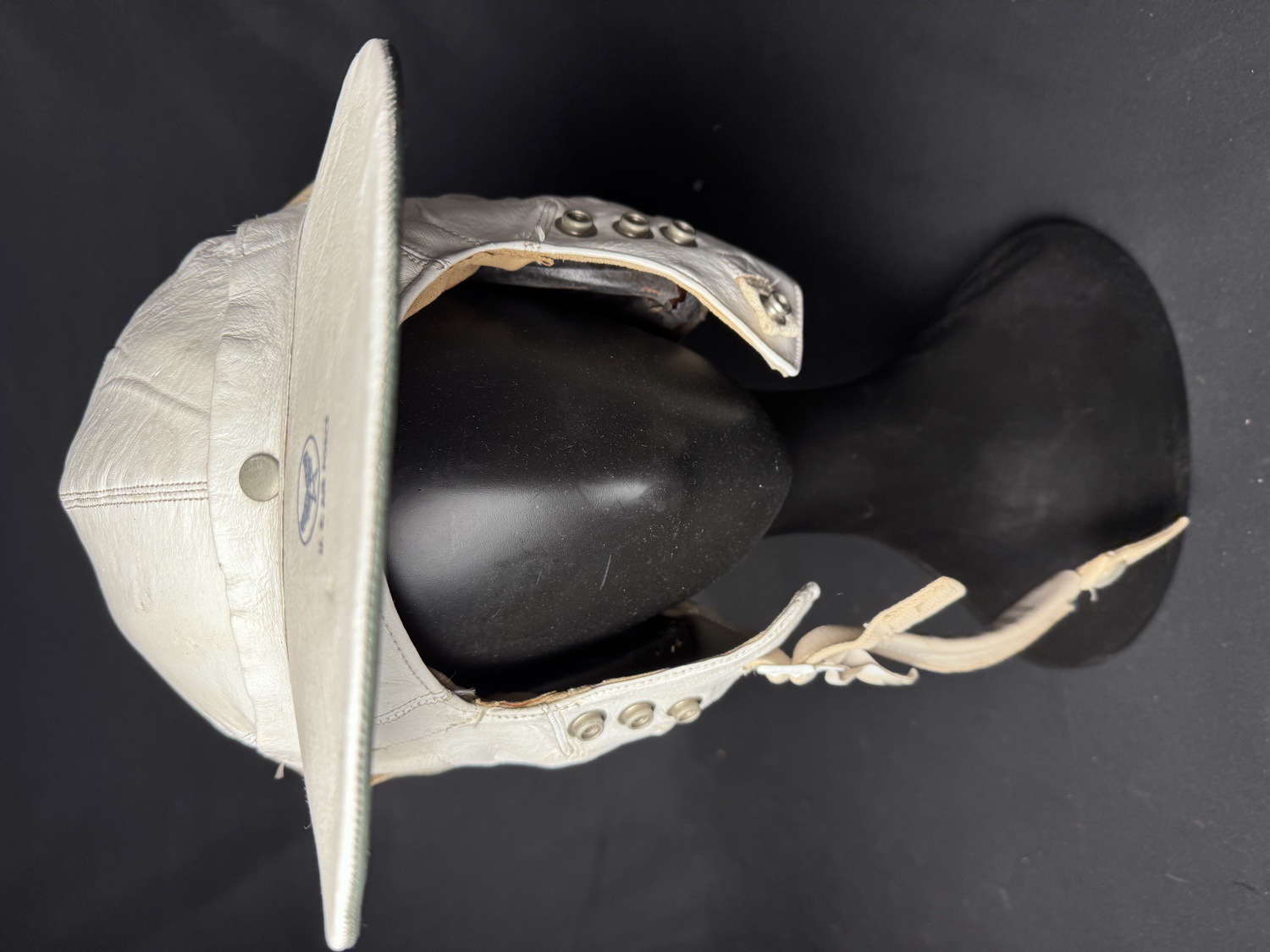 This lot features a rare and distinctive piece of Cold War aviation history: an Original US Air Force USAF Protective Flying Helmet H-149/AIC Headset, Type MB-3. These unique helmets were primarily worn by bomber and transport crews and personnel in non-ejection seat aircraft during the early to mid-Cold War era. The helmet is constructed of soft, white or off-white leather in a distinct baseball cap style with an integrated, snap-fastened ear flap assembly for communication equipment. The helmet shows clear signs of age and use, including scuffing on the leather and some discoloration, particularly on the internal lining and canvas straps. A prominent feature is the blue USAF logo and U.S. AIR FORCE stamping on the front visor. The visor itself is wide and stiff, designed for sun protection, with a contrasting greenish-gray underside.