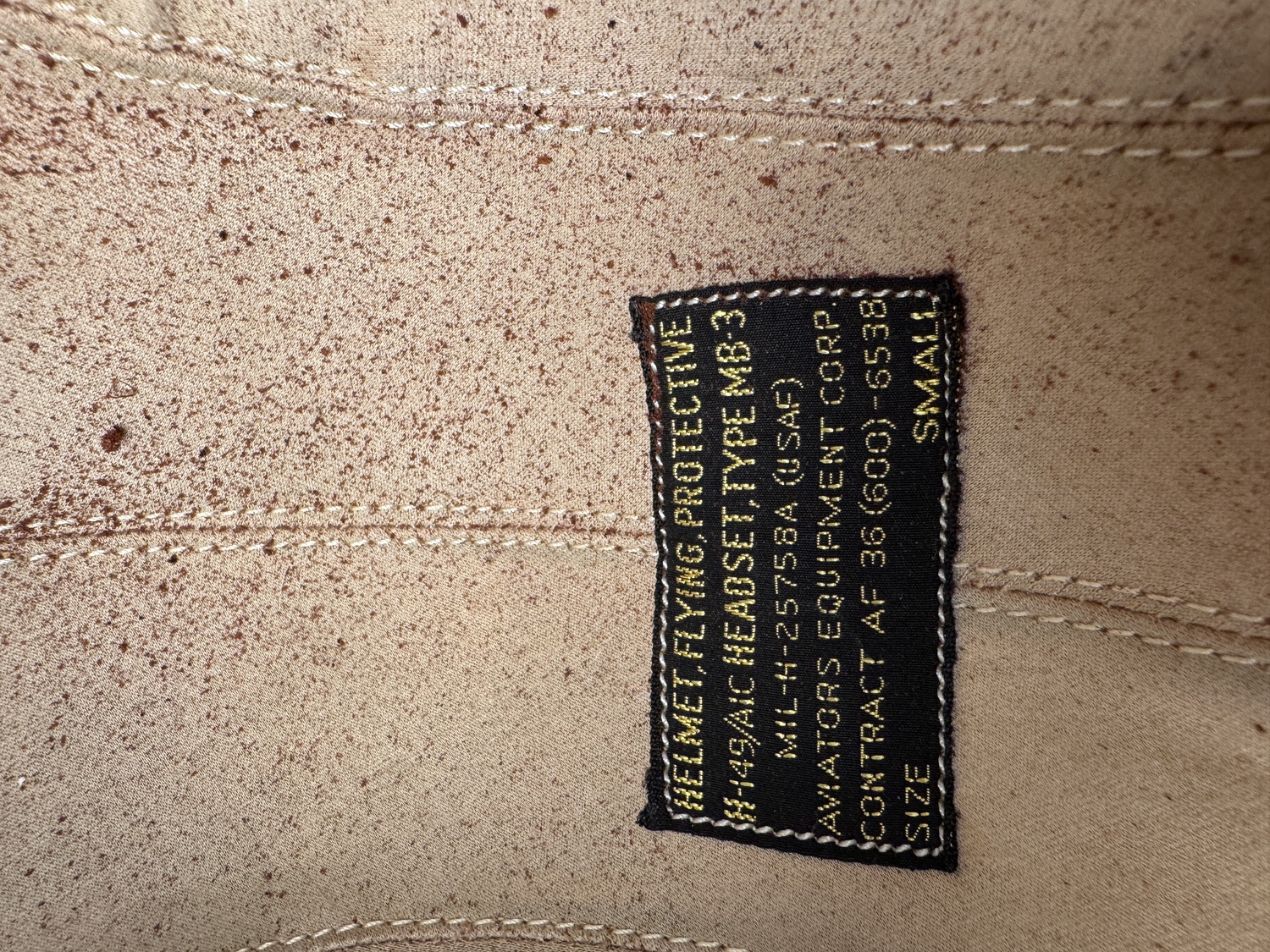 The interior retains its original communications components, specifically the earphone cups, integrated into the flaps. A crucial element for collectors is the presence of the original US Government specification tag, which is clearly legible and confirms its military specification and manufacturer, Aviators Equipment Corp., dating this helmet to an early Cold War contract circa the late 1950s or early 1960s. The tag explicitly states HELMET, FLYING, PROTECTIVE W/H-149/AIC HEADSET, TYPE MB-3 MIL-H-25758A USAF and the SIZE SMALL. The helmet is complete with its original canvas retention straps and leather chinstrap components