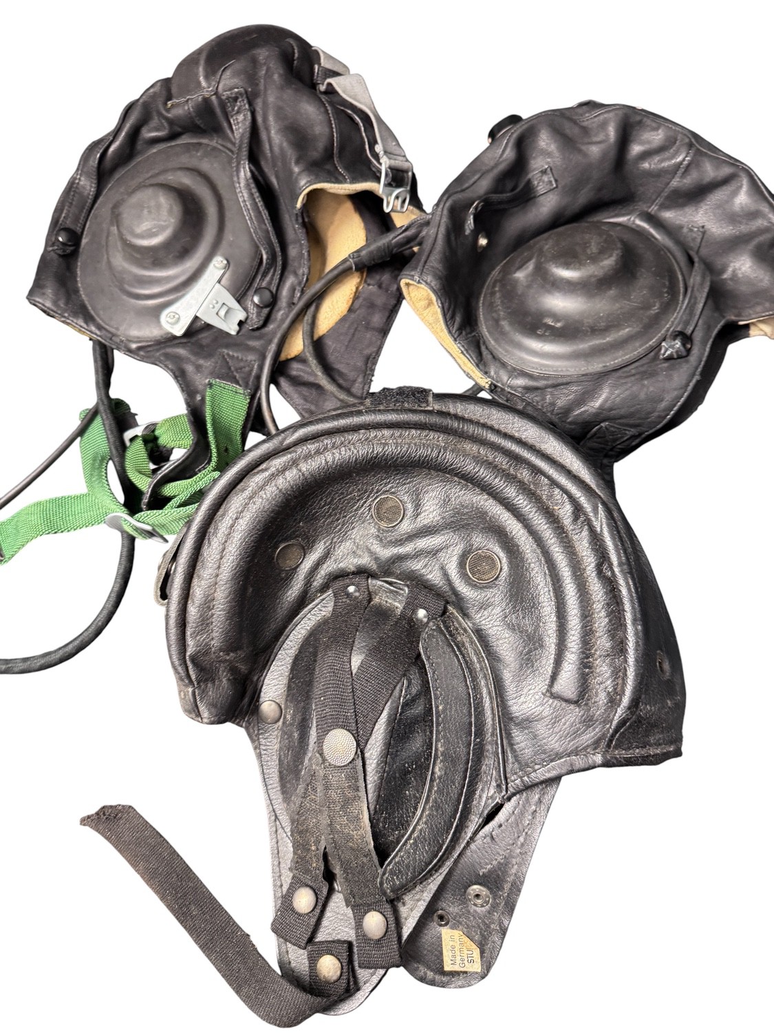 This lot of three features authentic and specialized pieces of Soviet Cold War aviation gear: an Original USSR Soviet Russian Leather Flying Helmet ____ used by pilots or aircrew. These helmets were standard issue across the Soviet Air Force and other Warsaw Pact nations from the mid-20th century onwards. Also used by tank crews.