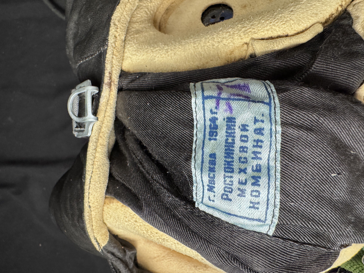 A highly important feature for provenance is the original internal manufacturer s cloth tag, which is secured to the black internal lining and printed in Cyrillic. The tag confirms the manufacturing location and date: _. ______ 1964 _. Moscow 1964, and identifies the manufacturer as the ____________ _______ ________ Rostokinsky Fur Combine, though the helmet itself appears leather. This specific model and date place the helmet firmly in the mid-Cold War era, during the height of Soviet aviation development.