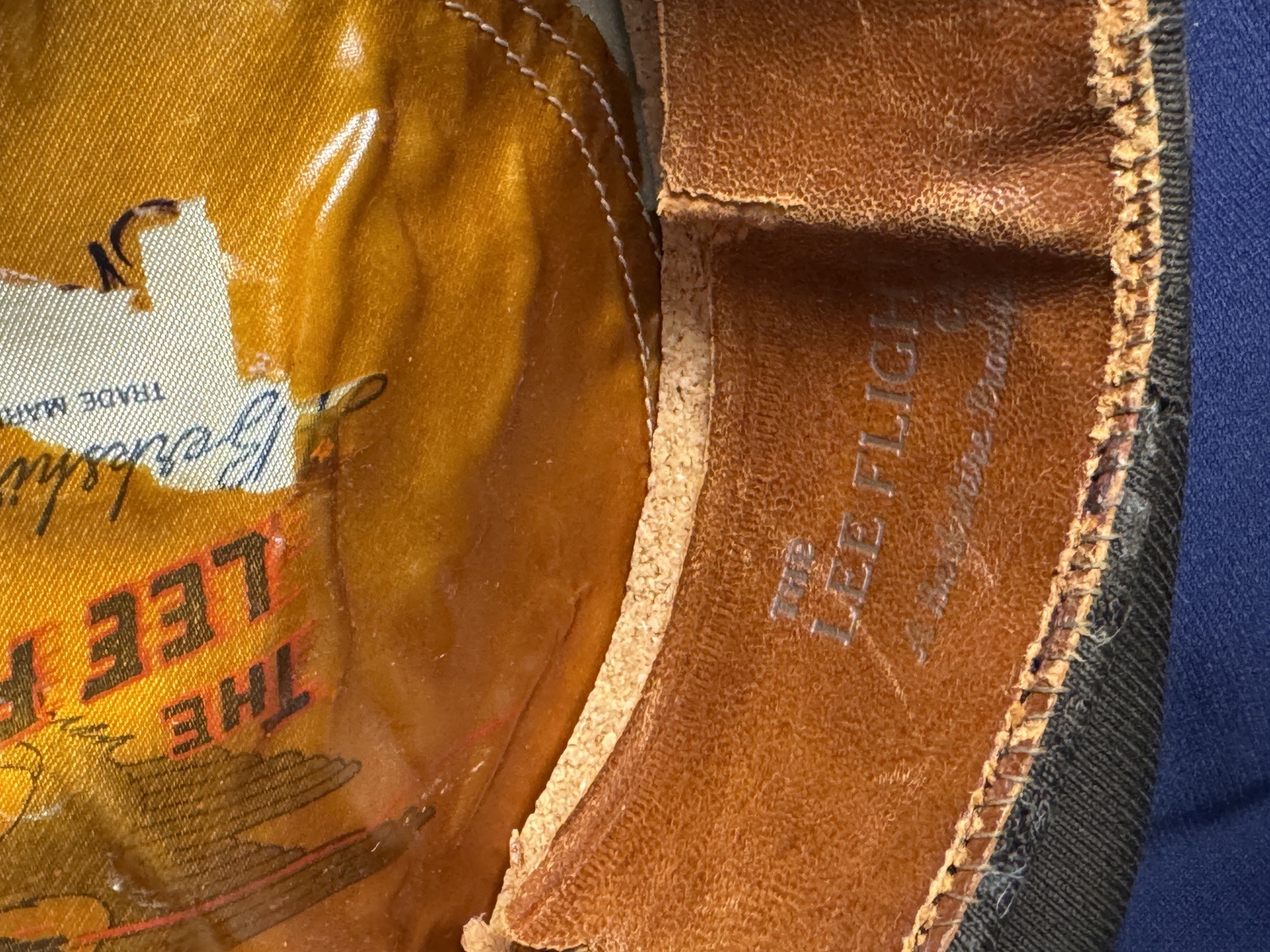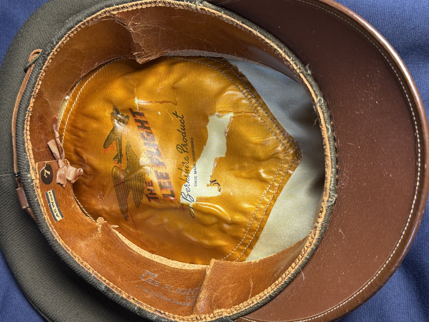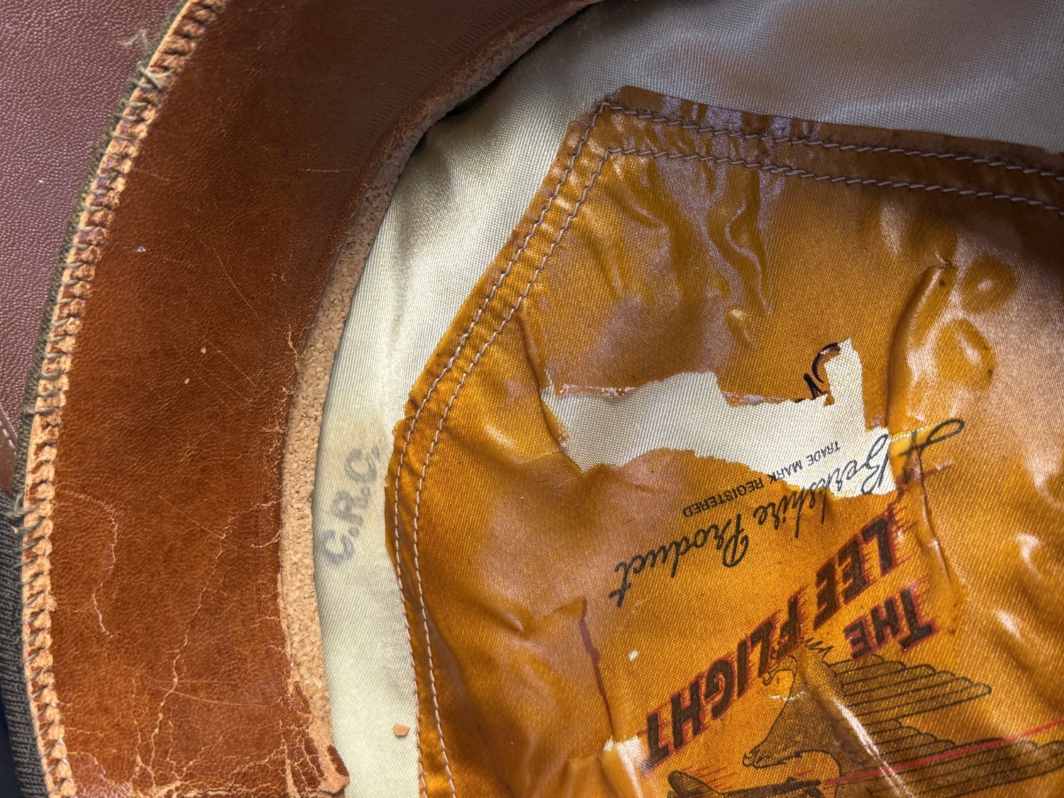 The interior provides exceptional provenance. The cap features a wide brown leather sweatband, which is embossed with the manufacturer or model name THE LEE FLIGHT. The satin lining inside the crown is a distinctive orange-gold color and features a printed graphic with a flying airplane and text advertising THE LEE FLIGHT A Berkshire Product. The interior leather is also lightly stenciled with what appears to be the owner s initials or identifying marks G.R.C. The high-quality manufacturing and the identifiable markings confirm this as a desirable, period-manufactured officers cap.