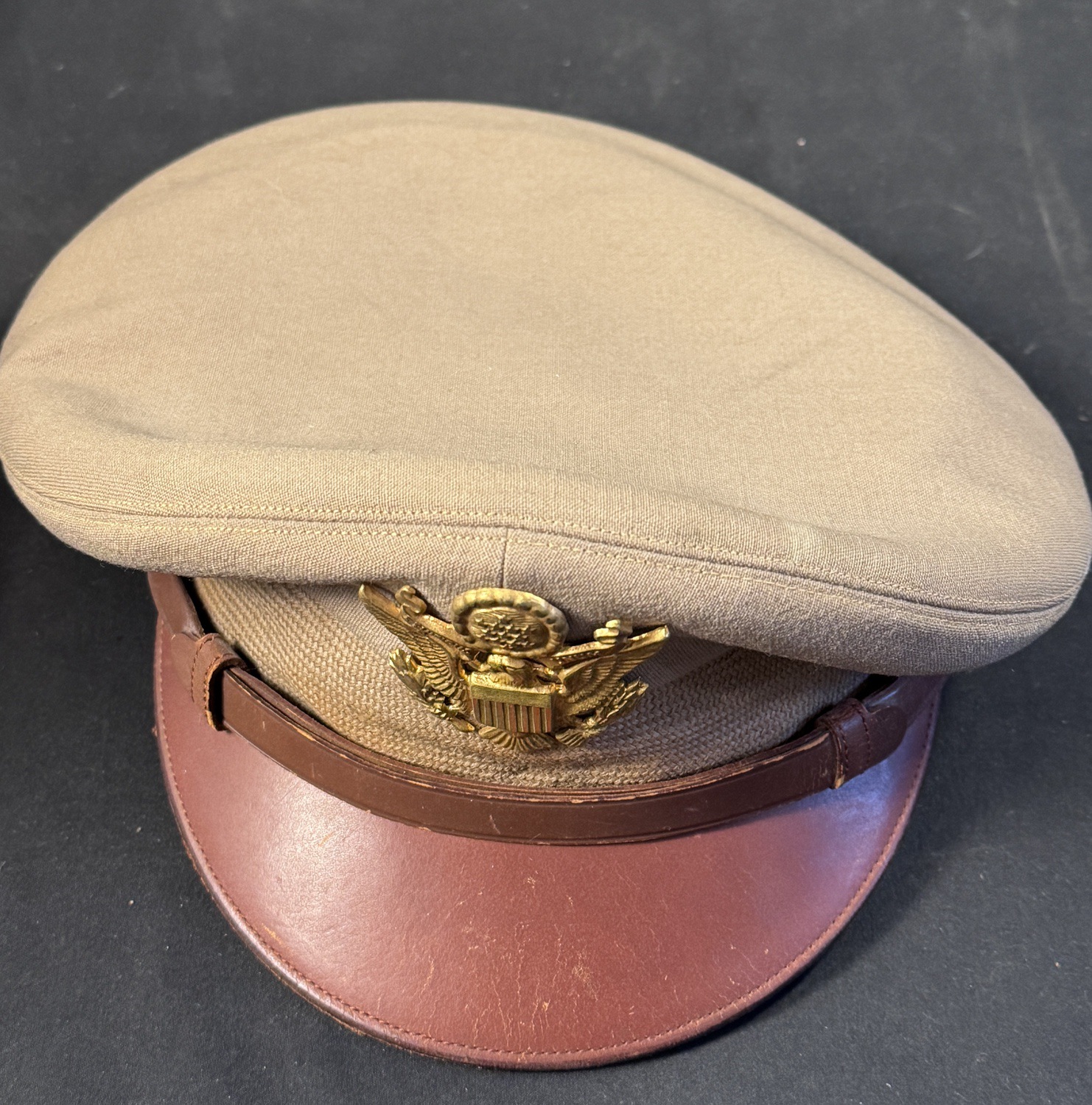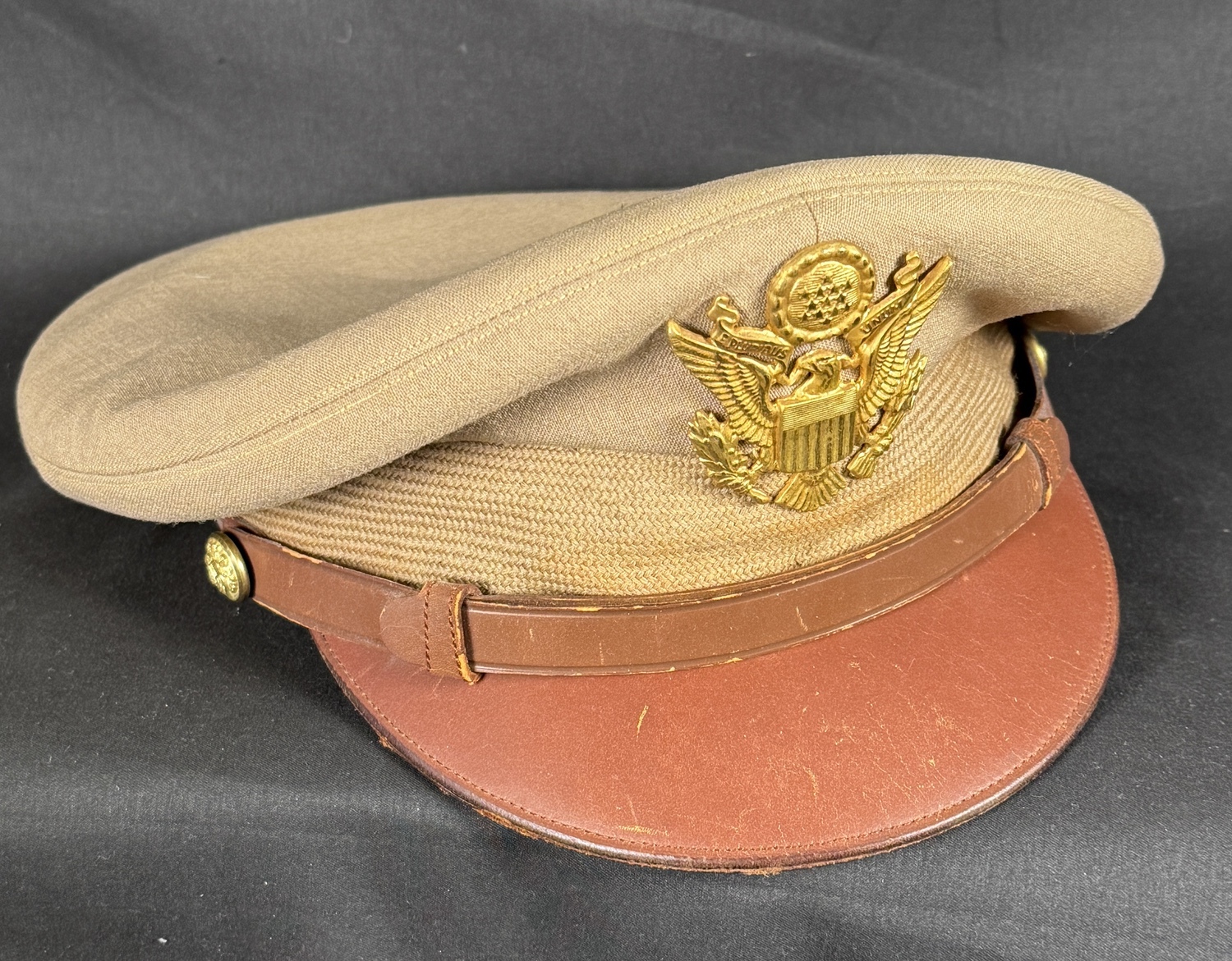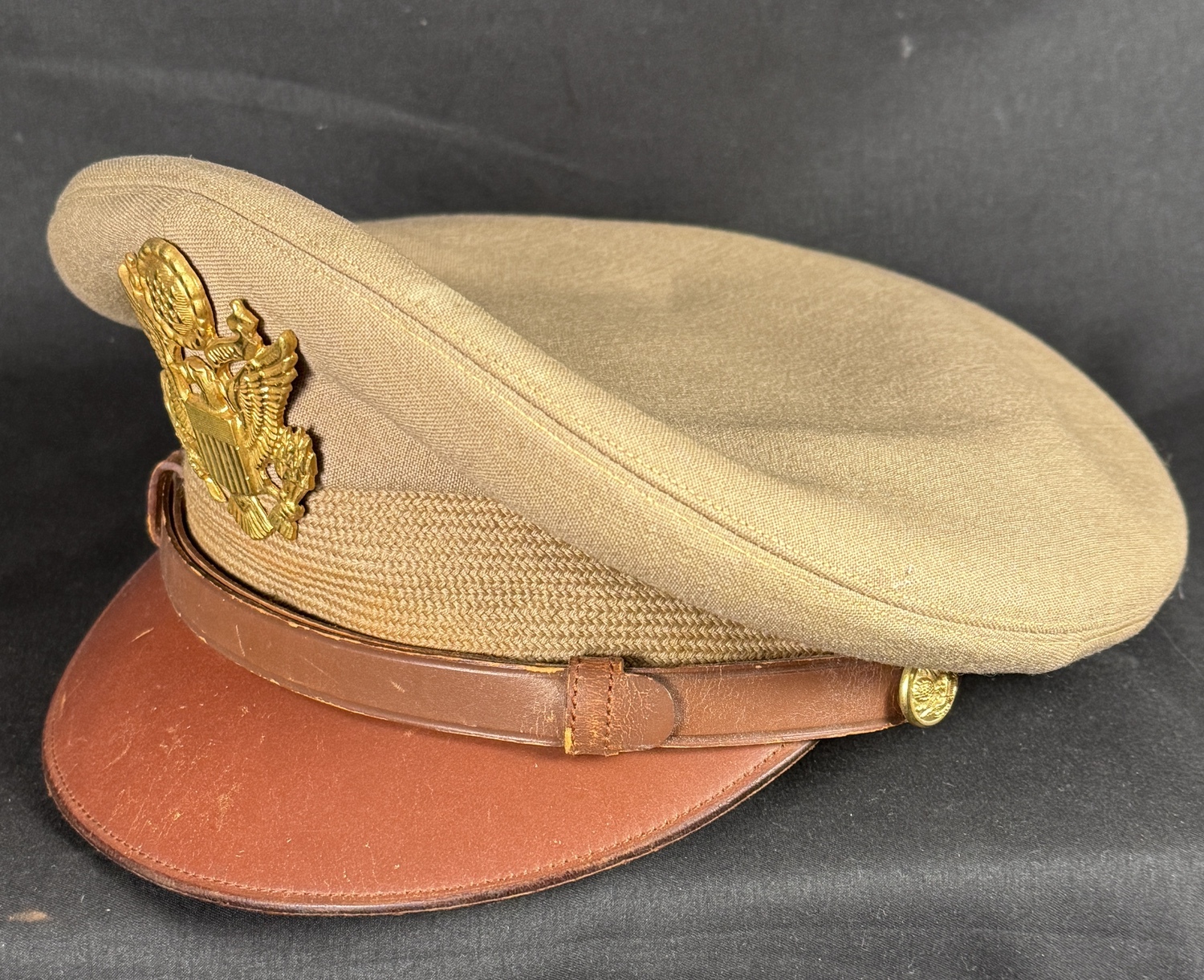 Outstanding condition. Name has not been researched. Officers Eagle Insignia, featuring the US Great Seal eagle, indicating commissioned officer status. The hat band is secured with a brown leather chinstrap fastened by two small gold-toned buttons. The cap retains its original shape, showing light wear and minor creasing consistent with its age.