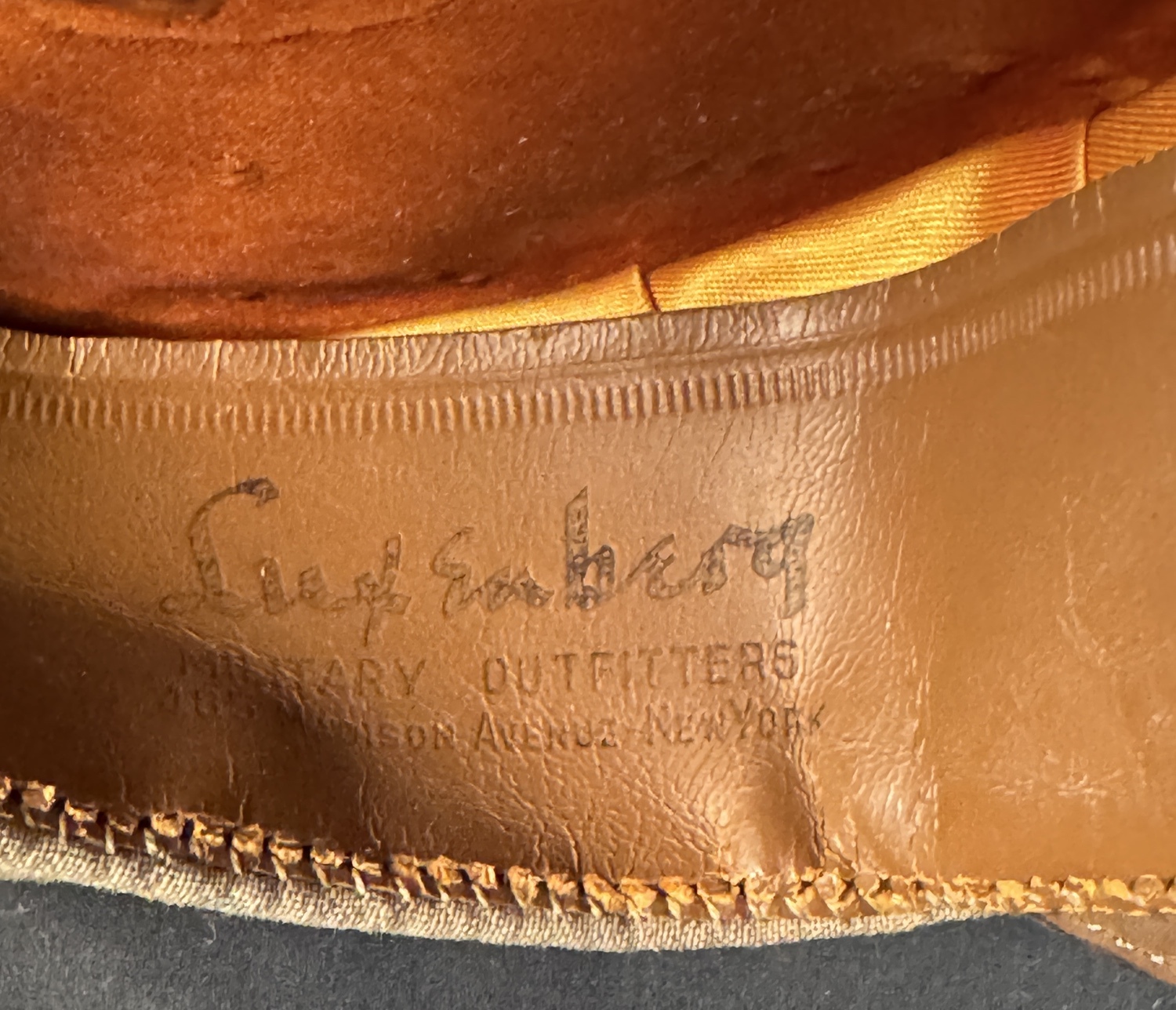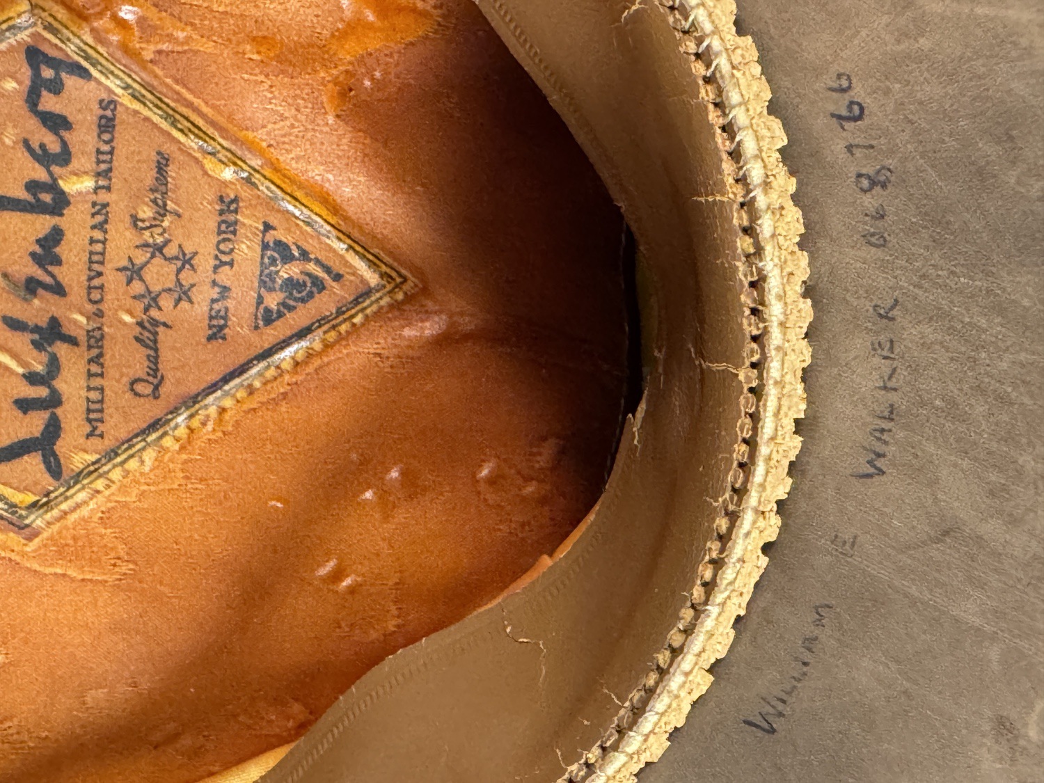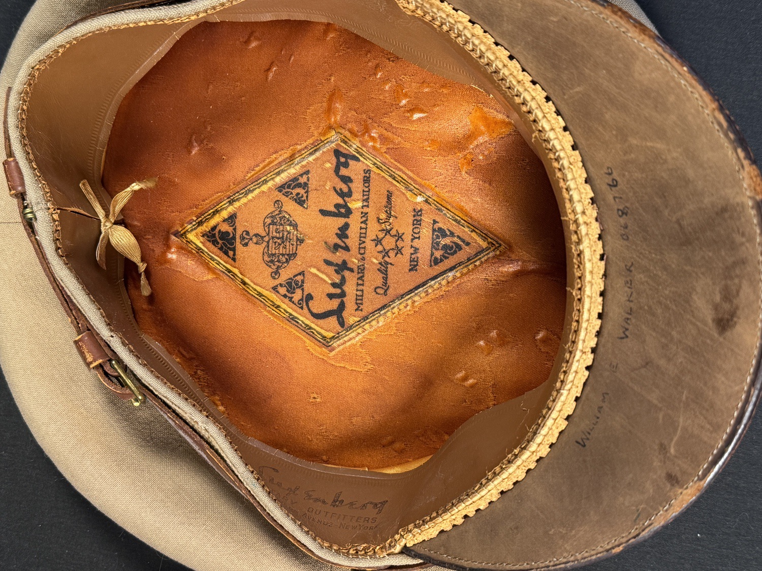 The interior provides exceptional and important provenance. The interior is lined with a smooth, gold-colored satin and features a large, detailed tailorÕs label for Sutfenborg Military & Civilian Tailors, New York, confirming it as a high-quality private purchase item. Crucially, the leather sweatband is inscribed with the owner s handwritten name and serial number: William E. Walker O-68766. This personalization allows for direct research into the officer. Research confirms that the service number O-68766 belongs to an officer named William E. Walker who served during the WWII era, a detail that greatly enhances the historical value of the cap.