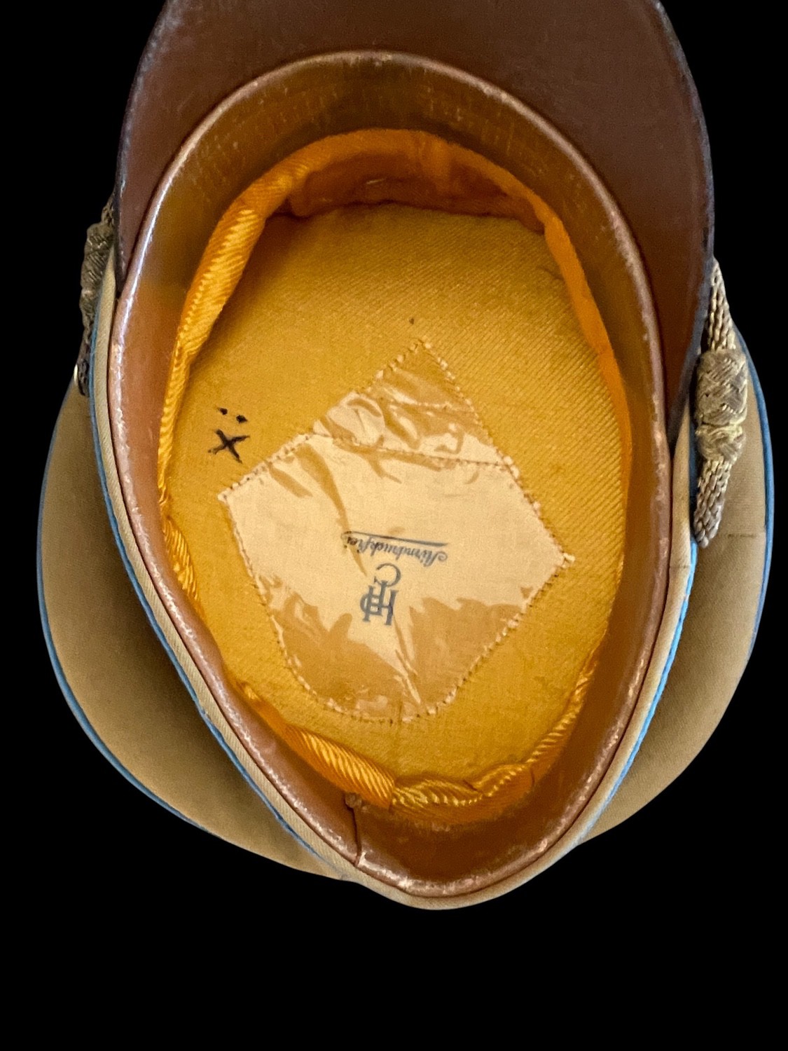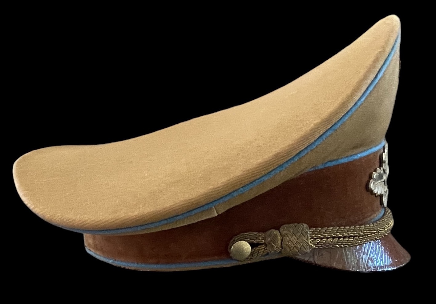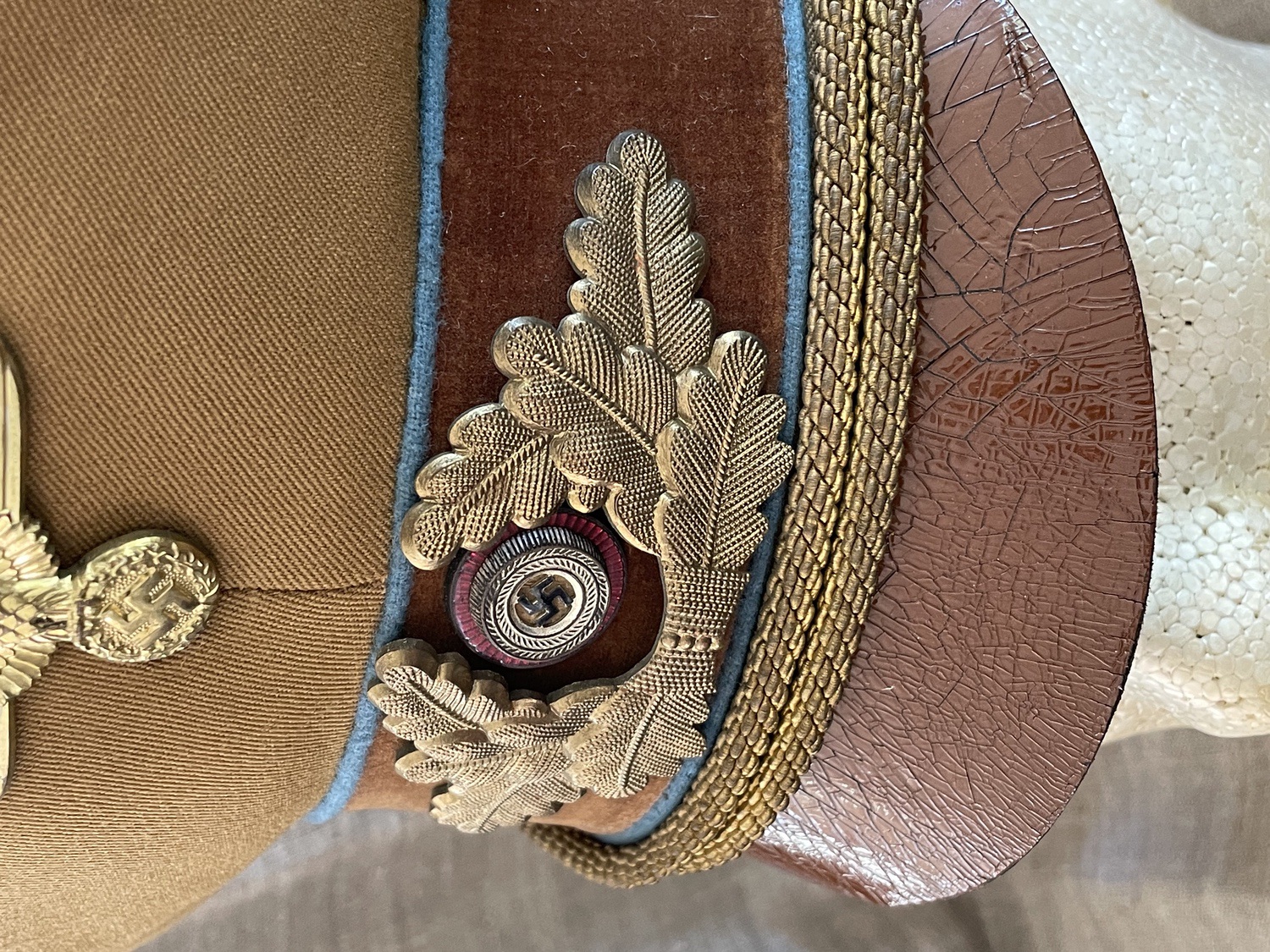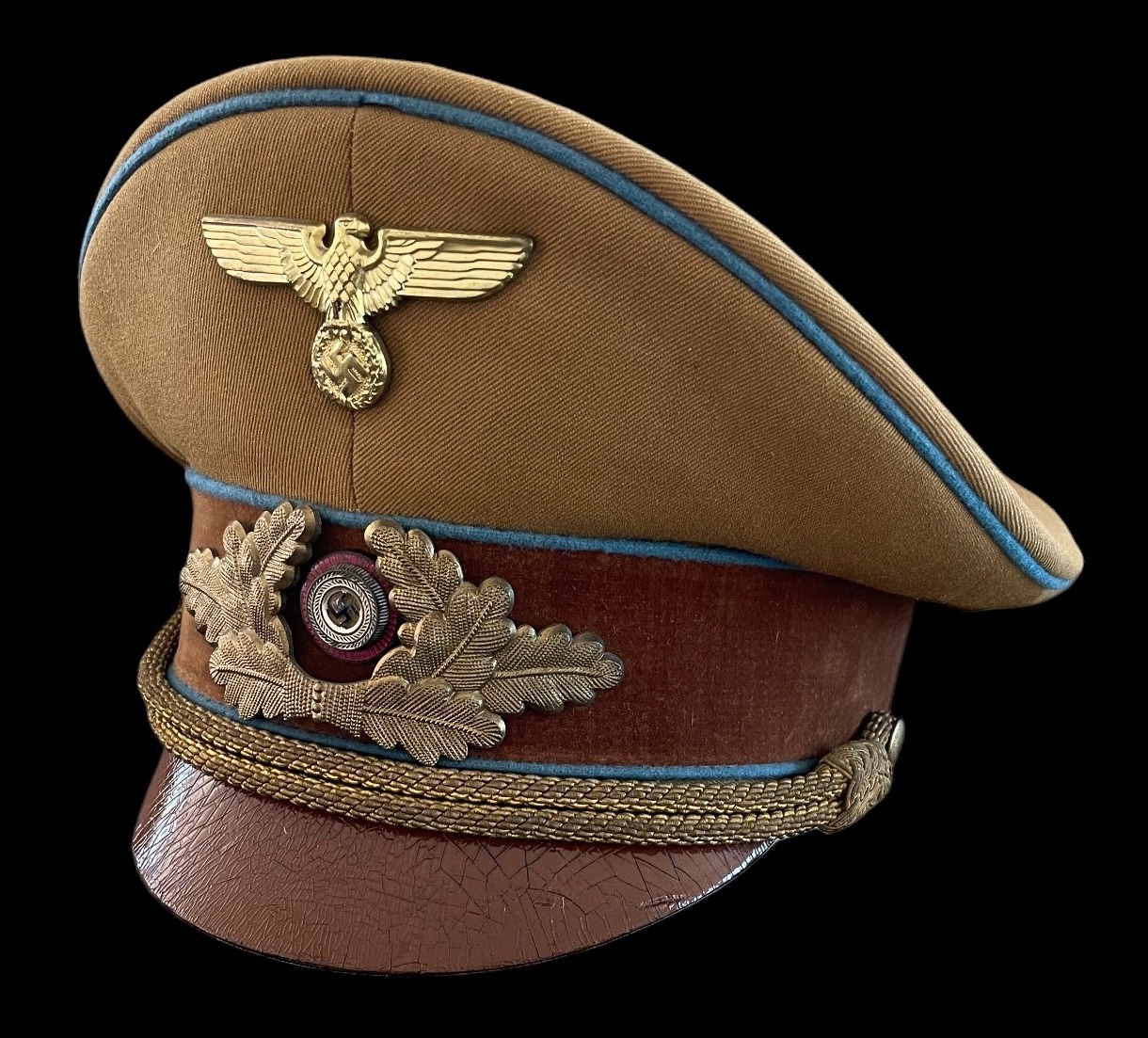 A highly impressive and original World War II German NSDAP Nazi Party Political LeaderÕs Visor Cap, correctly configured for the Ortsgruppe Local Group level. This cap embodies the distinctive paramilitary elegance of the Nazi Party leadership uniforms. The cap features a tan wool crown and a chocolate brown velvet cap band, beautifully accented by light blue piping Waffenfarbe , which definitively identifies the rank level as Ortsgruppe. The cap is adorned with high-quality gold-colored insignia, including the gilt metal National Eagle and the gilt metal oak leaf wreath surrounding the enamel tri-color cockade, indicating a Political Leader status. The chinstrap is a deluxe gold bullion cord, secured by two small gold pebble side buttons.The visor itself is made of brown lacquer-finished fiber, showing characteristic age cracking or crazing that is typical of period materials and confirms its originality. The interior is equally well-preserved, featuring a golden-yellow rayon lining and a diamond-shaped sweat shield beneath which the maker s logo, HP&C Stirndruckfrei forehead pressure-free, is visible, marking it as a high-quality, comfortable private purchase piece. The cap retains a desirable saddle shape and is in excellent overall condition, making it a highly desirable and visually stunning artifact for any collection of Third Reich political militaria.