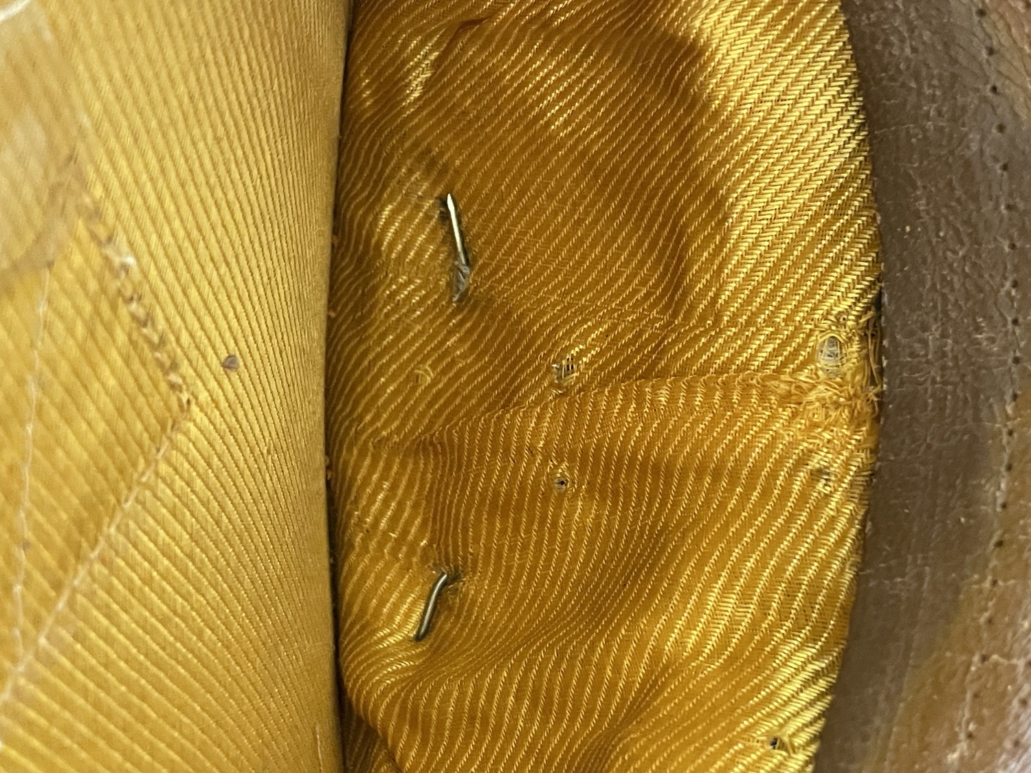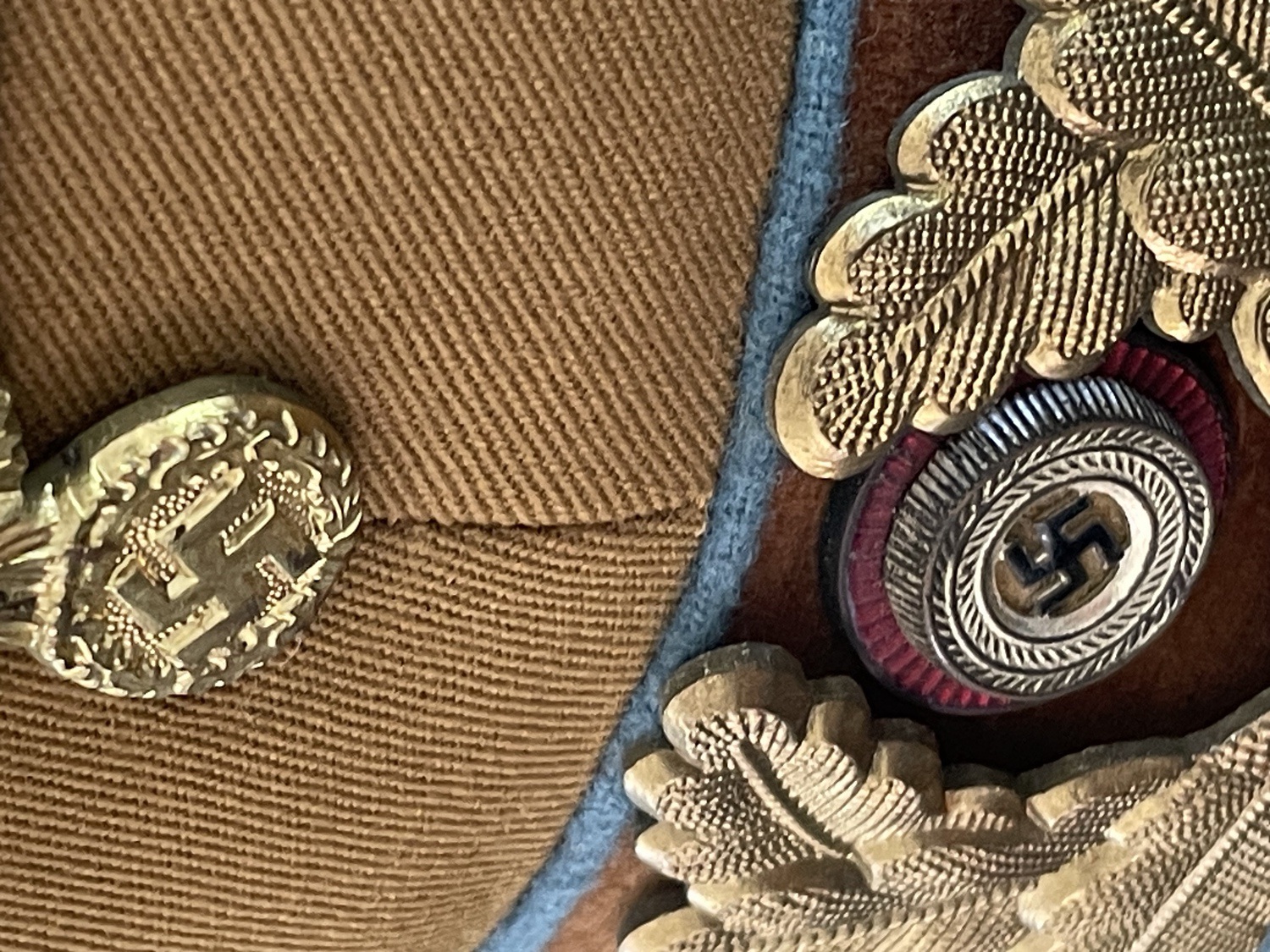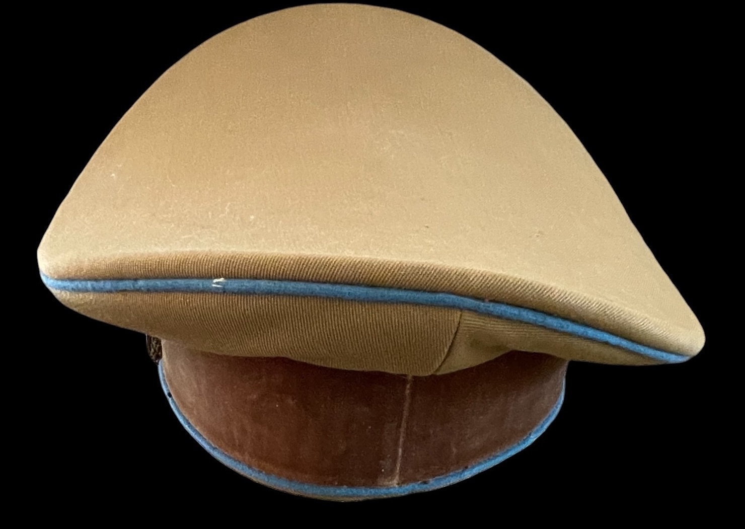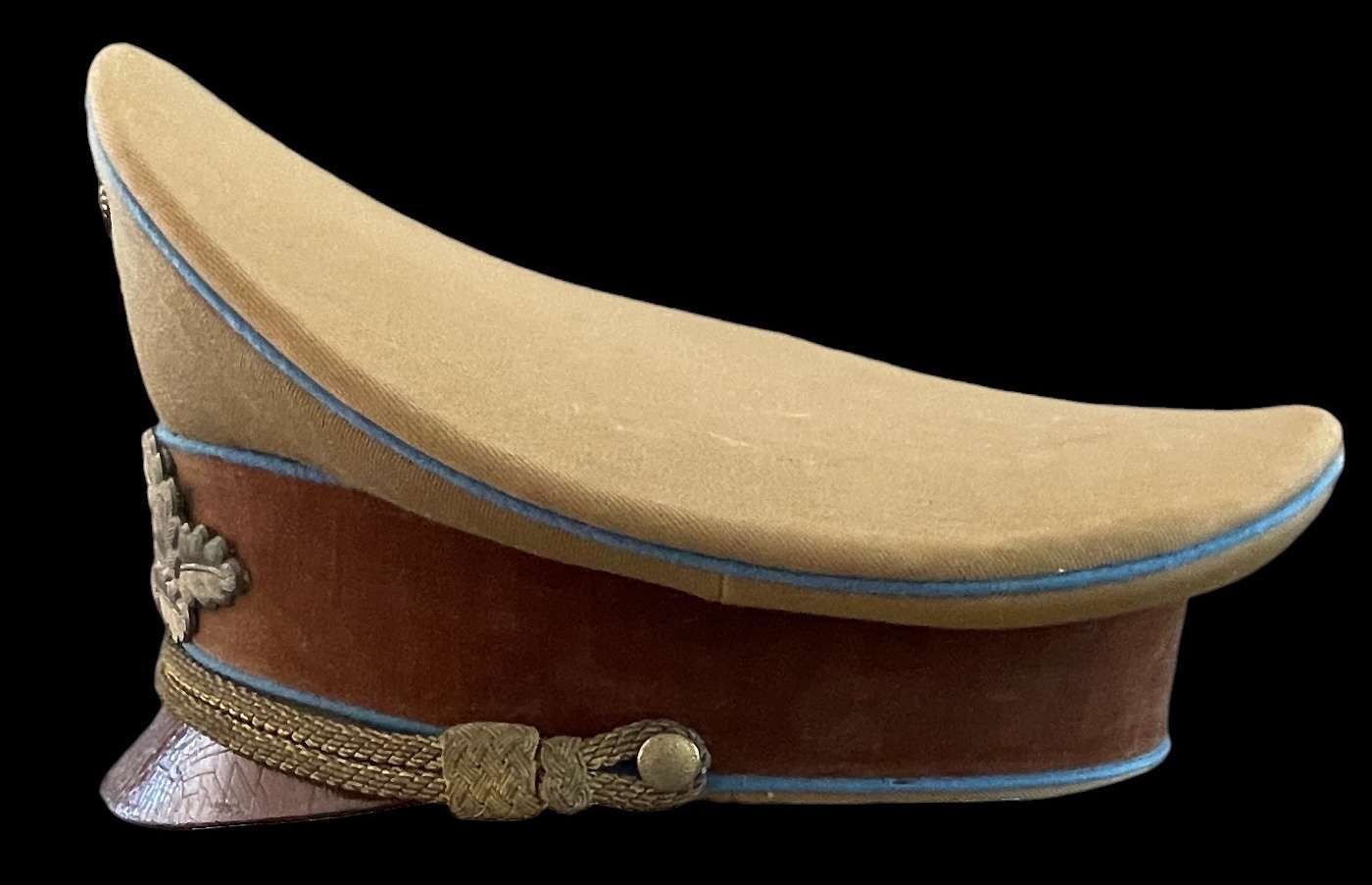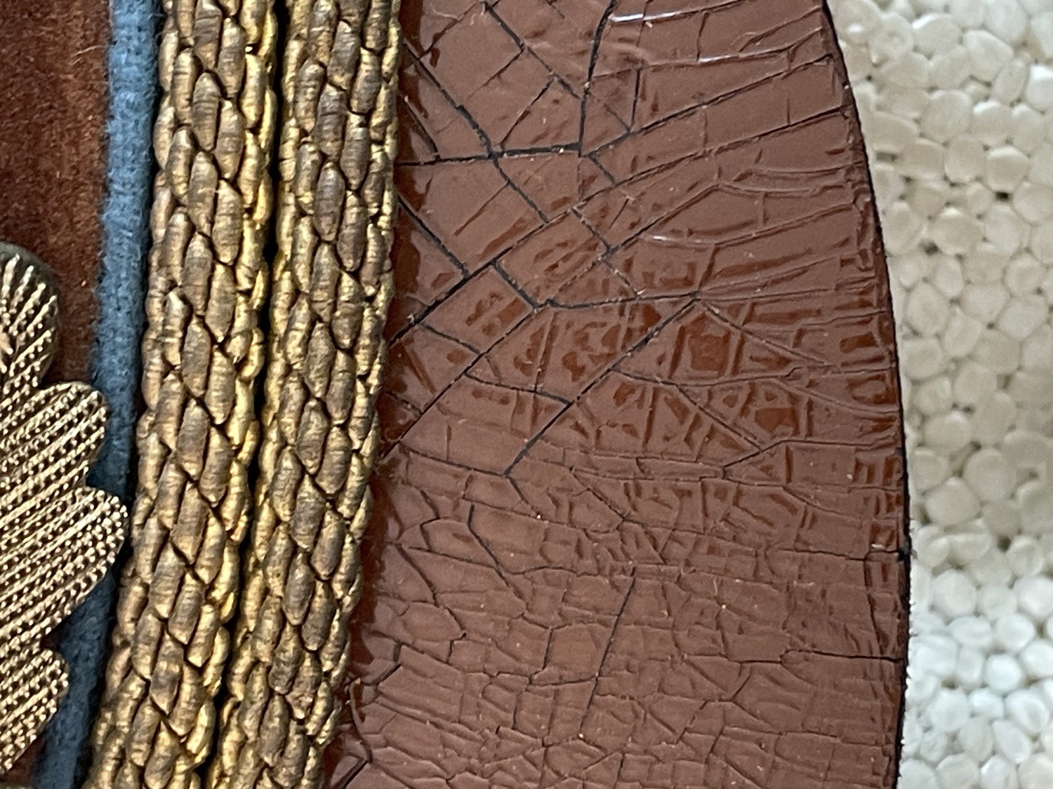 A highly impressive and original World War II German NSDAP Nazi Party Political LeaderÕs Visor Cap, correctly configured for the Ortsgruppe Local Group level. This cap embodies the distinctive paramilitary elegance of the Nazi Party leadership uniforms. The cap features a tan wool crown and a chocolate brown velvet cap band, beautifully accented by light blue piping Waffenfarbe , which definitively identifies the rank level as Ortsgruppe. The cap is adorned with high-quality gold-colored insignia, including the gilt metal National Eagle and the gilt metal oak leaf wreath surrounding the enamel tri-color cockade, indicating a Political Leader status. The chinstrap is a deluxe gold bullion cord, secured by two small gold pebble side buttons.The visor itself is made of brown lacquer-finished fiber, showing characteristic age cracking or crazing that is typical of period materials and confirms its originality. The interior is equally well-preserved, featuring a golden-yellow rayon lining and a diamond-shaped sweat shield beneath which the maker s logo, HP&C Stirndruckfrei forehead pressure-free, is visible, marking it as a high-quality, comfortable private purchase piece. The cap retains a desirable saddle shape and is in excellent overall condition, making it a highly desirable and visually stunning artifact for any collection of Third Reich political militaria.