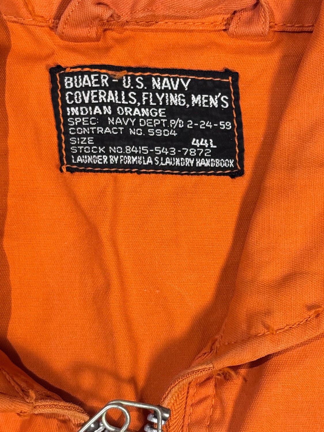 Crucially, the suit retains its original manufacturer s specification tag which is clearly legible and provides excellent provenance. The tag identifies the suit as BUAER U.S. NAVY COVERALLS, FLYING, MEN S INDIAN ORANGE, with the specification SPEC: NAVY DEPT P/D 2-24-59, confirming a definitive early Cold War 1959 manufacturing date. The suit is marked SIZE 44L and names the manufacturer as BUAER. The overall condition is excellent, showing minor wear and fading, but retaining its sharp color and functional zippers. This flight suit represents a key transitional period in US Navy aviation uniform development.