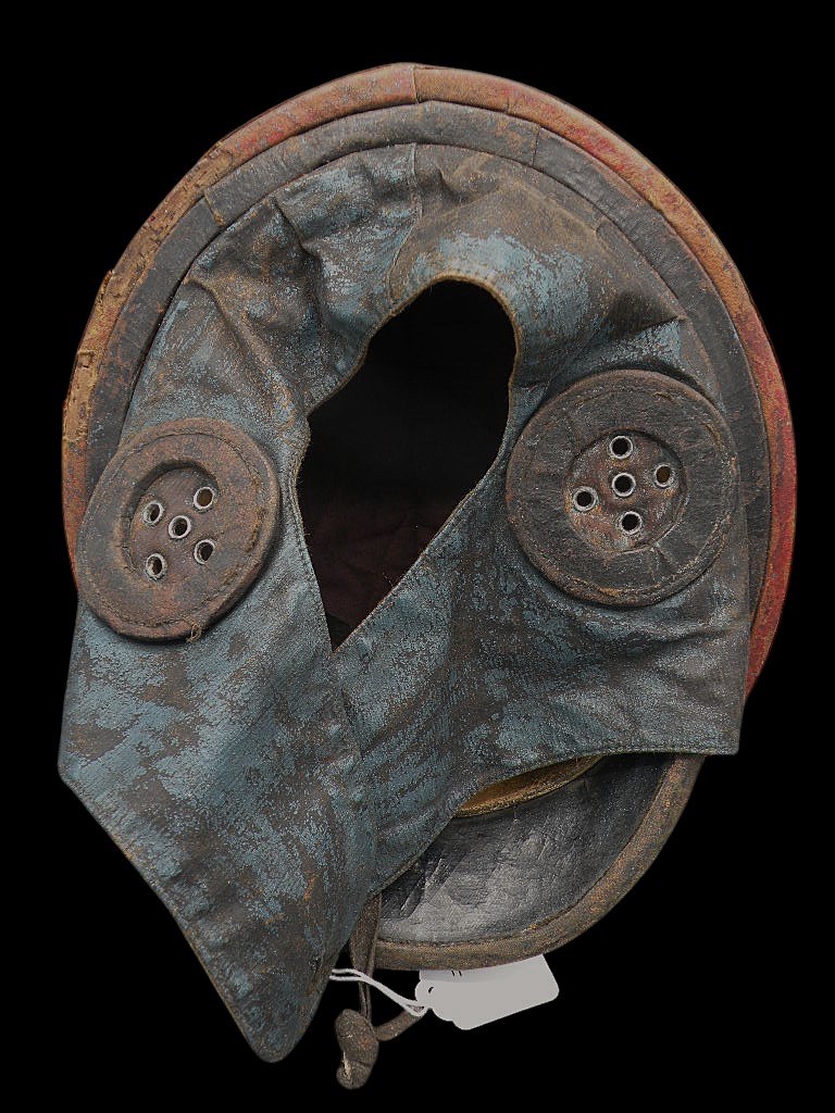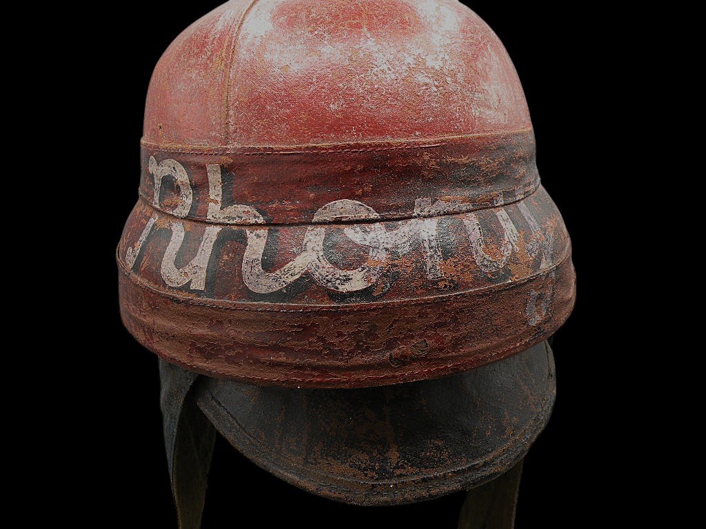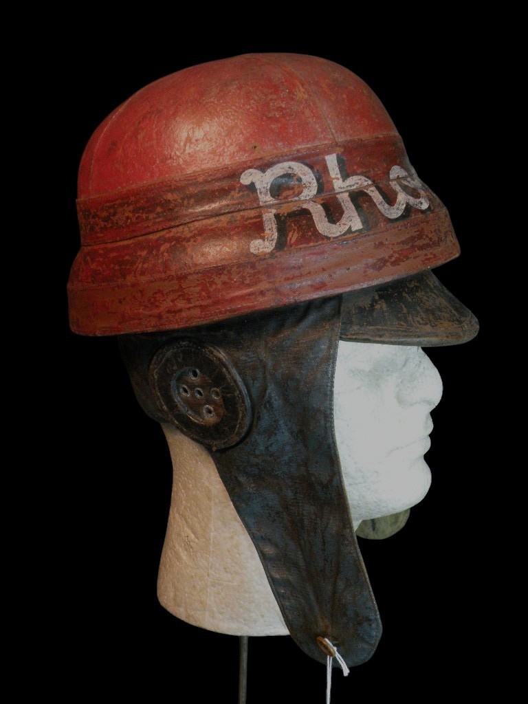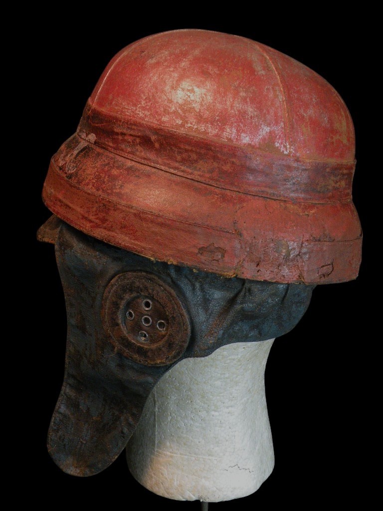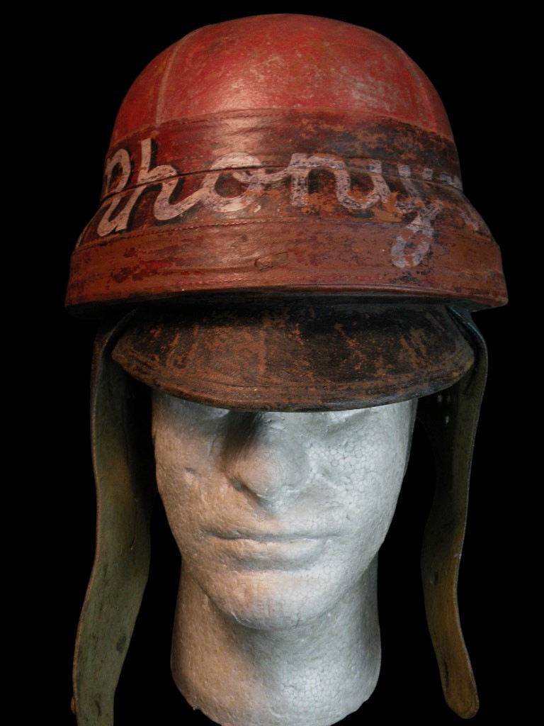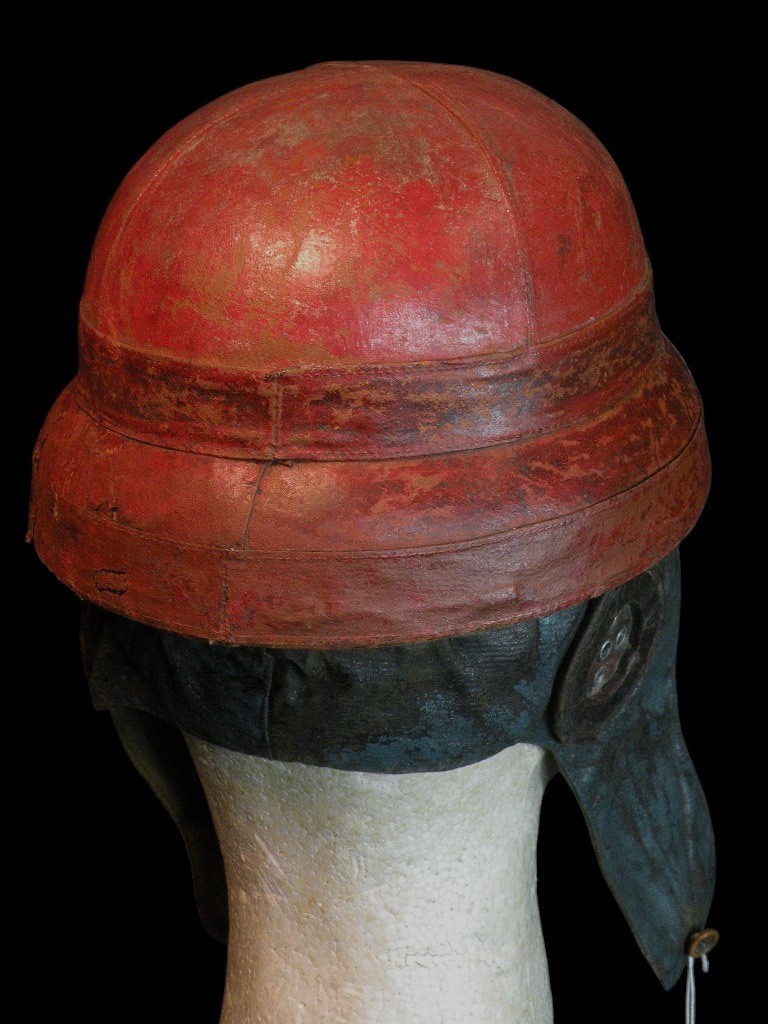 WW1 French Roold helmet, painted red, white and blue, the colors of France with a nickname painted across the front. This lot presents an exceptionally rare and museum-quality artifact of early military aviation: an Original World War I French Aviators Protective Flight Helmet, identified as a pattern similar to those supplied by the famous Roold company. This helmet is highly desirable due to its distinct construction and striking personalization.