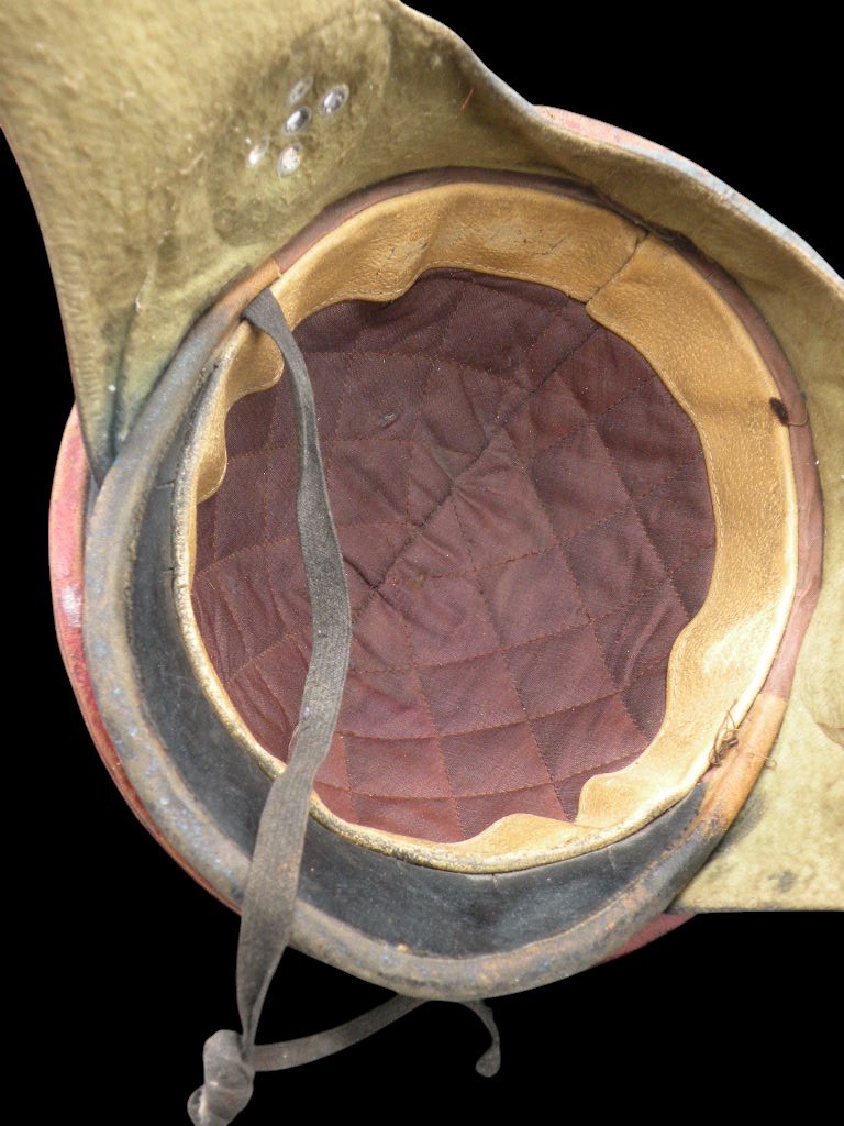 The interior of the hard dome features a quilted dark brown velvet or leather lining for cushioning. The inner soft helmet portion shows a contrasting lining, confirming the complex, layered construction of this protective headgear. The overall condition, while showing extensive age, paint wear, and patina, is excellent for a WWI leather artifact, preserving the unique personalization and construction details. This helmet is a truly unique, identifiable relic from the earliest days of aerial combat.