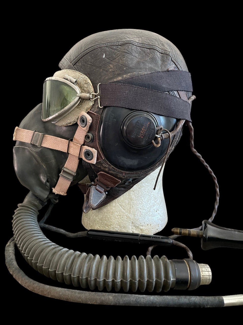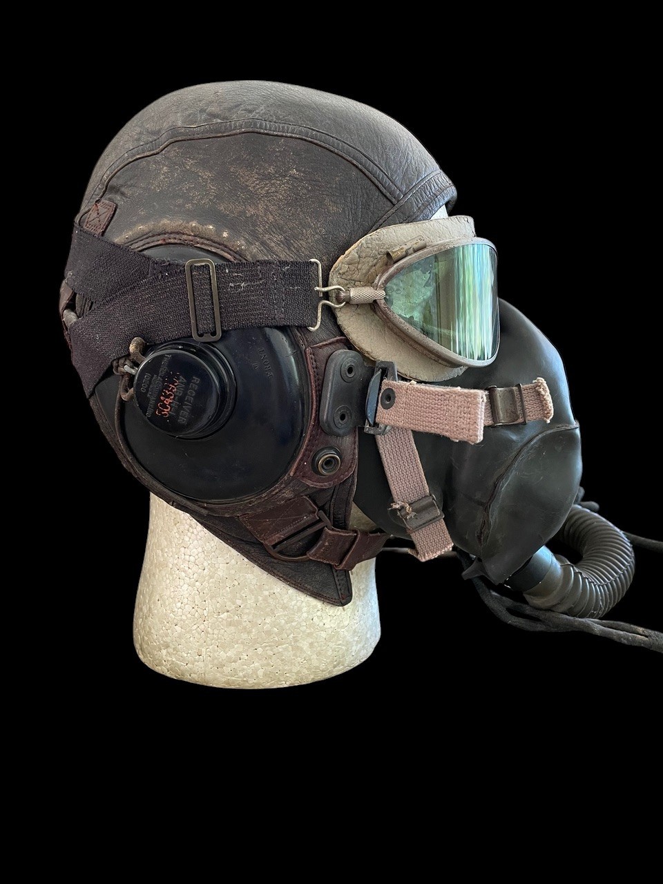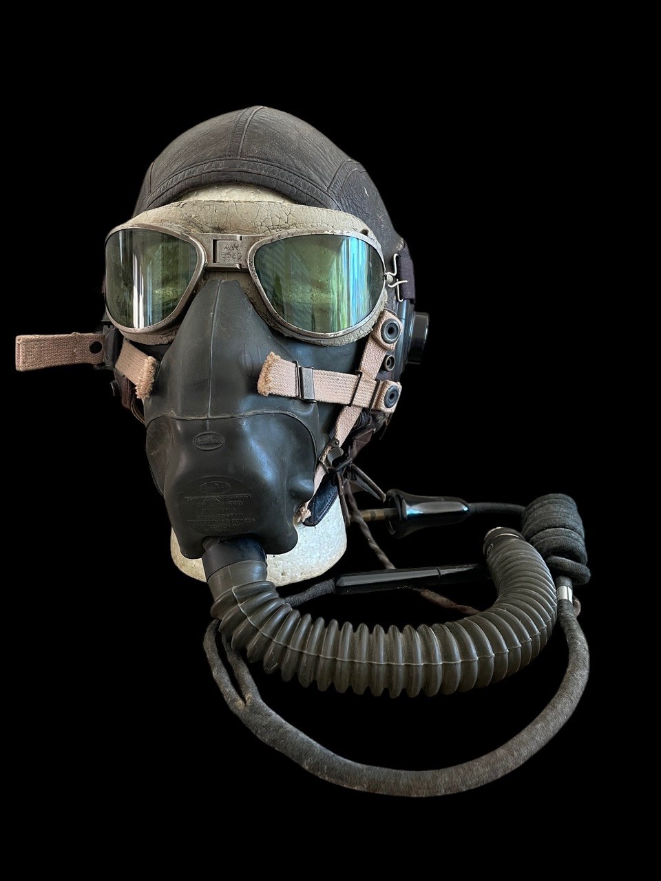 The helmet is outfitted with a period-correct Type A-10A Oxygen Mask, recognizable by its darker rubber and specific face seal contours, designed for superior oxygen delivery and fit compared to earlier models. The mask is secured by olive drab and tan webbing straps and is complete with its corrugated hose and end fittings. The set is capped by a pair of Type AN-6530 Flying Goggles. These goggles have an aluminum frame and rubber cushion. The rubber shows considerable wear.