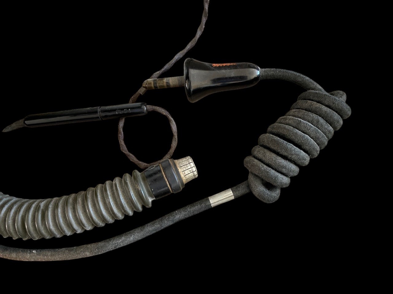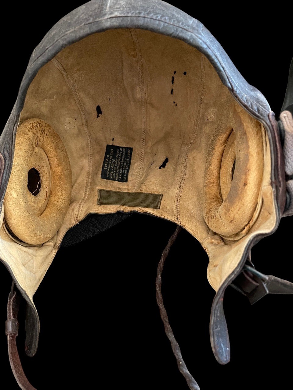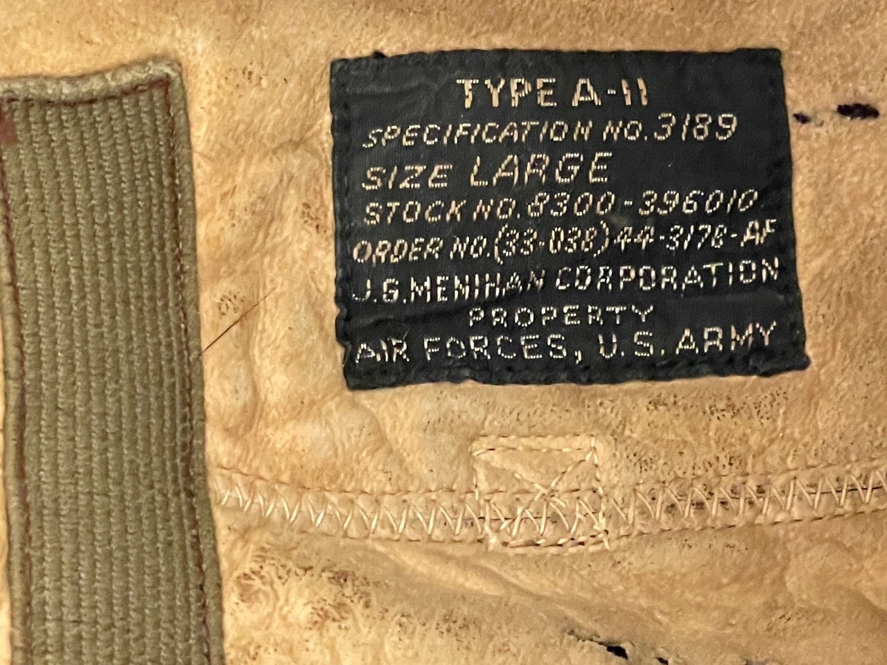 This is an exceptional and complete flight gear assembly from the World War Two U.S. Army Air Forces USAAF , perfectly configured for use by pilots and aircrews in high-altitude environments such as the European theater. The set is presented in excellent condition, comprising the A-11 Leather flight helmet, A10A oxygen mask, and AN-6530 Flight goggles. The core component is an original Type A-11 Leather Flight Helmet. The internal tag is fully legible and provides definitive provenance: SPEC. A-11, SIZE LARGE, manufactured by JG Menihan, with the contract number confirming this as a 1944 contract item. The helmet features rubber ear cups that house the ANB-H-1 receivers present and retaining straps for the oxygen mask, including the signature elastic retention strap running around the back, and a faint exterior USAAF stamp is also visible.