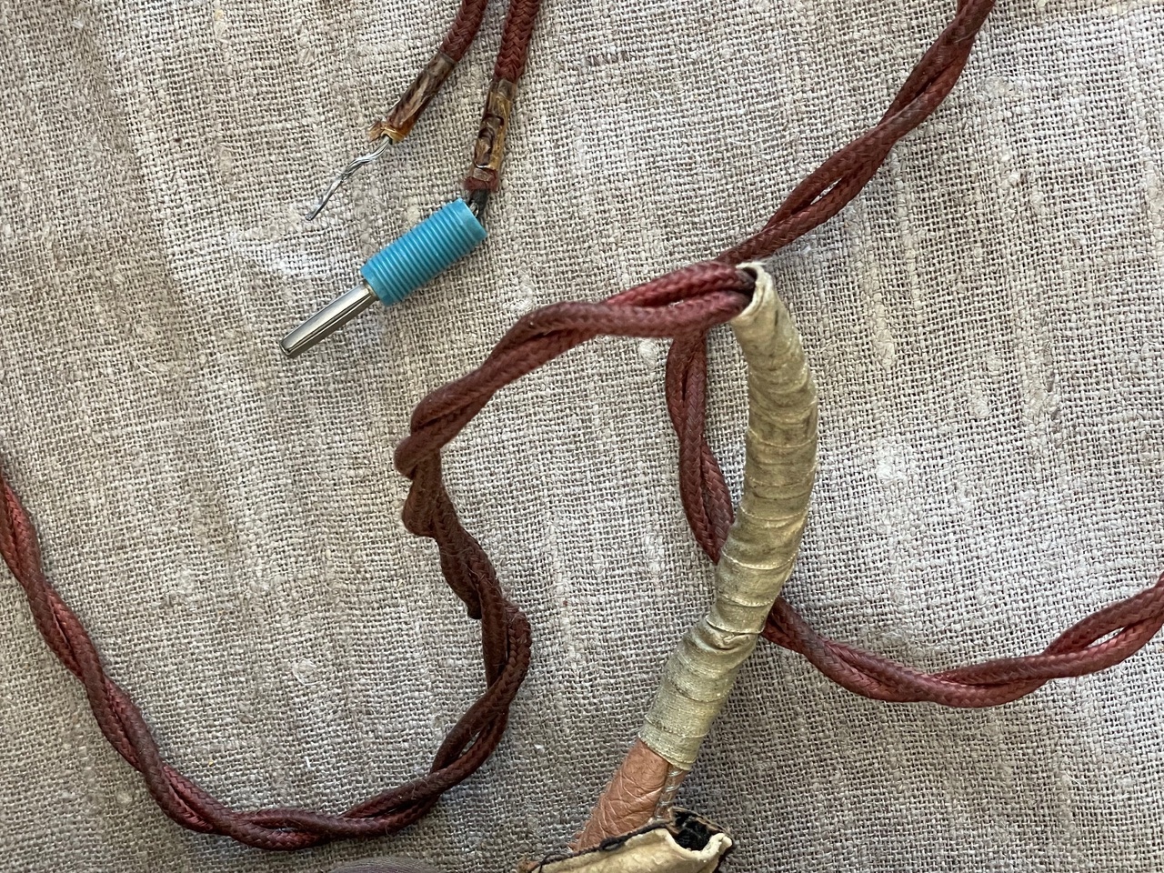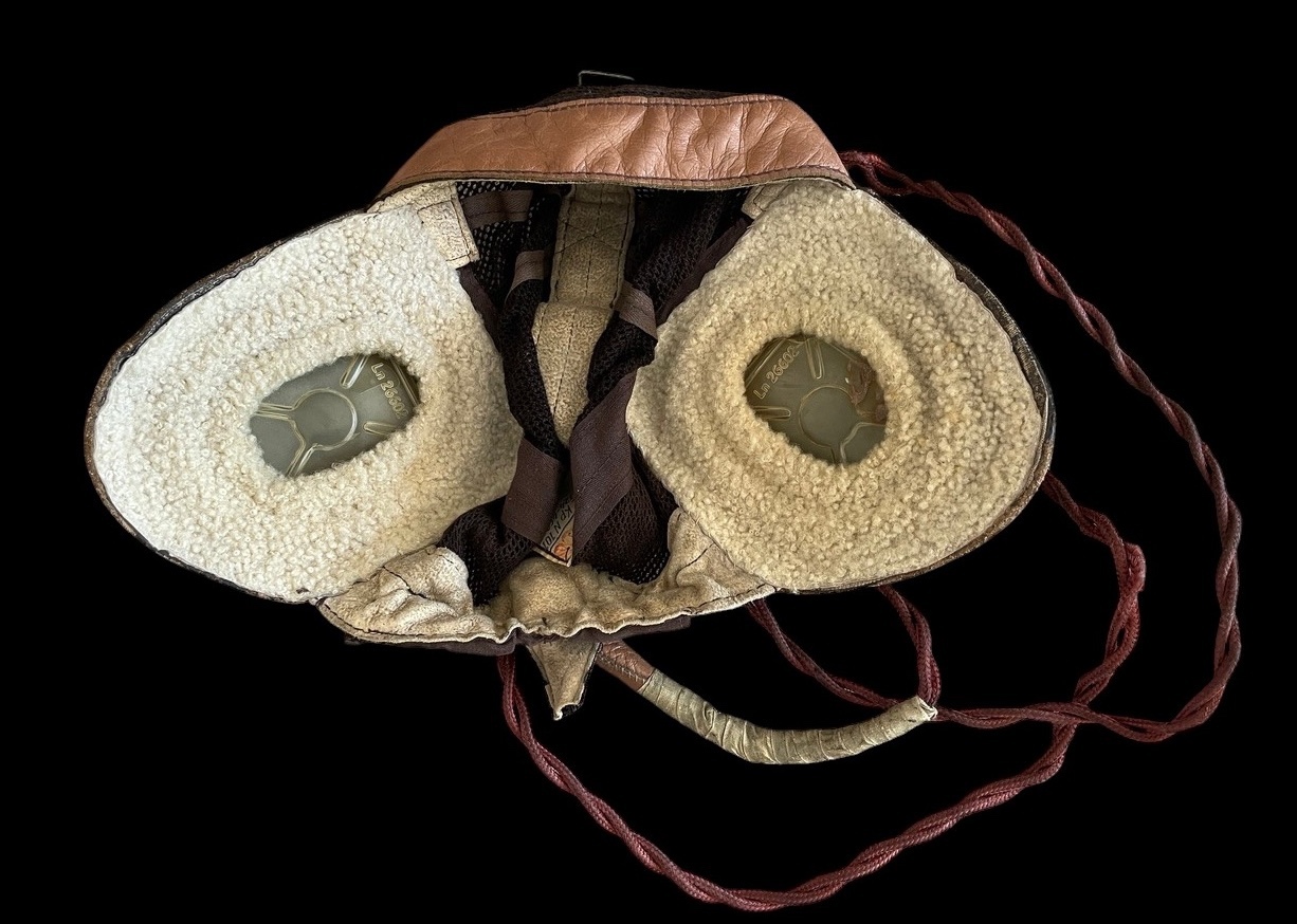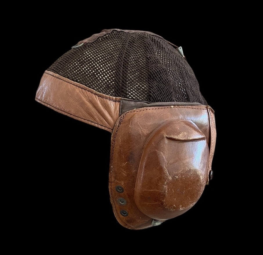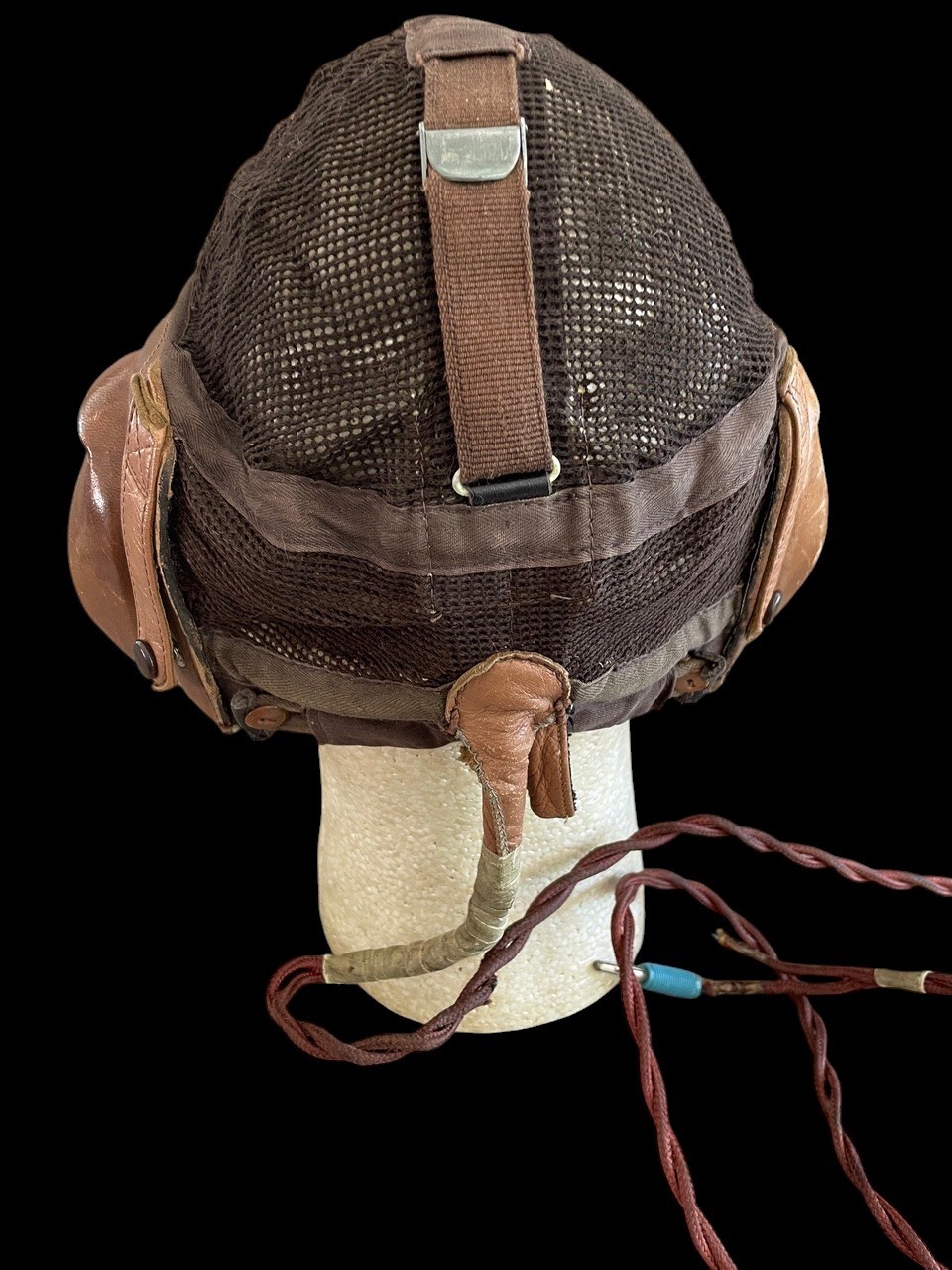 This lot presents a scarce and highly desirable piece of German aviation gear: an original World War II Luftwaffe Summer Flying Helmet, officially designated LKp N101 Netzkopfhaube Gr. The Netzkopfhaube, or net head-cap, was specifically designed for pilots and aircrew operating in warmer climates, featuring a lightweight, breathable construction for ventilation. The helmet is constructed primarily from a fine, brown leather shell covering the ears and base, while the top of the dome consists of a dark brown or black mesh netting, allowing for air circulation. The leather remains pliable and shows a rich, brown patina with minor scuffing consistent with age and use. The side flaps enclose the earpieces and feature snaps for securing an oxygen mask, which is not present. The interior of the earpieces are lined with white or cream-colored fleece/shearling for comfort and acoustic damping, showing evidence of the integrated speakers and headphones, though the headset components themselves are obscured by the lining. The wiring loom appears to have been modified for use in aircraft from the late 1940s to the 1950s.