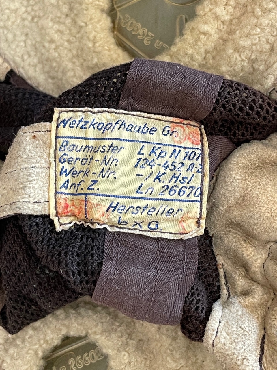 A crucial feature is the original sewn-in manufacturer s label which is still largely legible on the interior. The label confirms the designation and provides valuable data, including the size and designation Netzkopfhaube Gr. L.Kp N 101 Flieger-Kopfhaube No. 101, the design pattern Baumuster L 2-452 A-2, the factory number Werk-Nr. K.Hsl., the acceptance mark Anf. Z. Ln 26670, and the manufacturer Hersteller B & C. This helmet is a highly specialized piece of Luftwaffe equipment, valued not only for its authentic construction and completeness with communications wiring but especially for the presence and legibility of the detailed manufacturer s acceptance and designation tag.