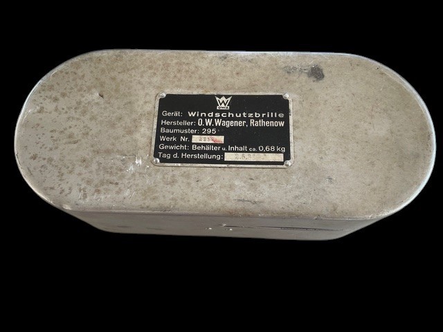 A fantastic, complete set of original World War II German Luftwaffe Windschutzbrille Wind Protection Goggles , specifically the highly desirable Model 295, housed in their original aluminum case. These goggles were a standard issue item for aircrew, particularly favored by air gunners in exposed positions and pilots in open-cockpit aircraft. The set is made by the highly recognizable manufacturer O. W. Wagener & Co., Rathenow, as clearly indicated on the case s data plate, along with the model designation Baumuster: 295.