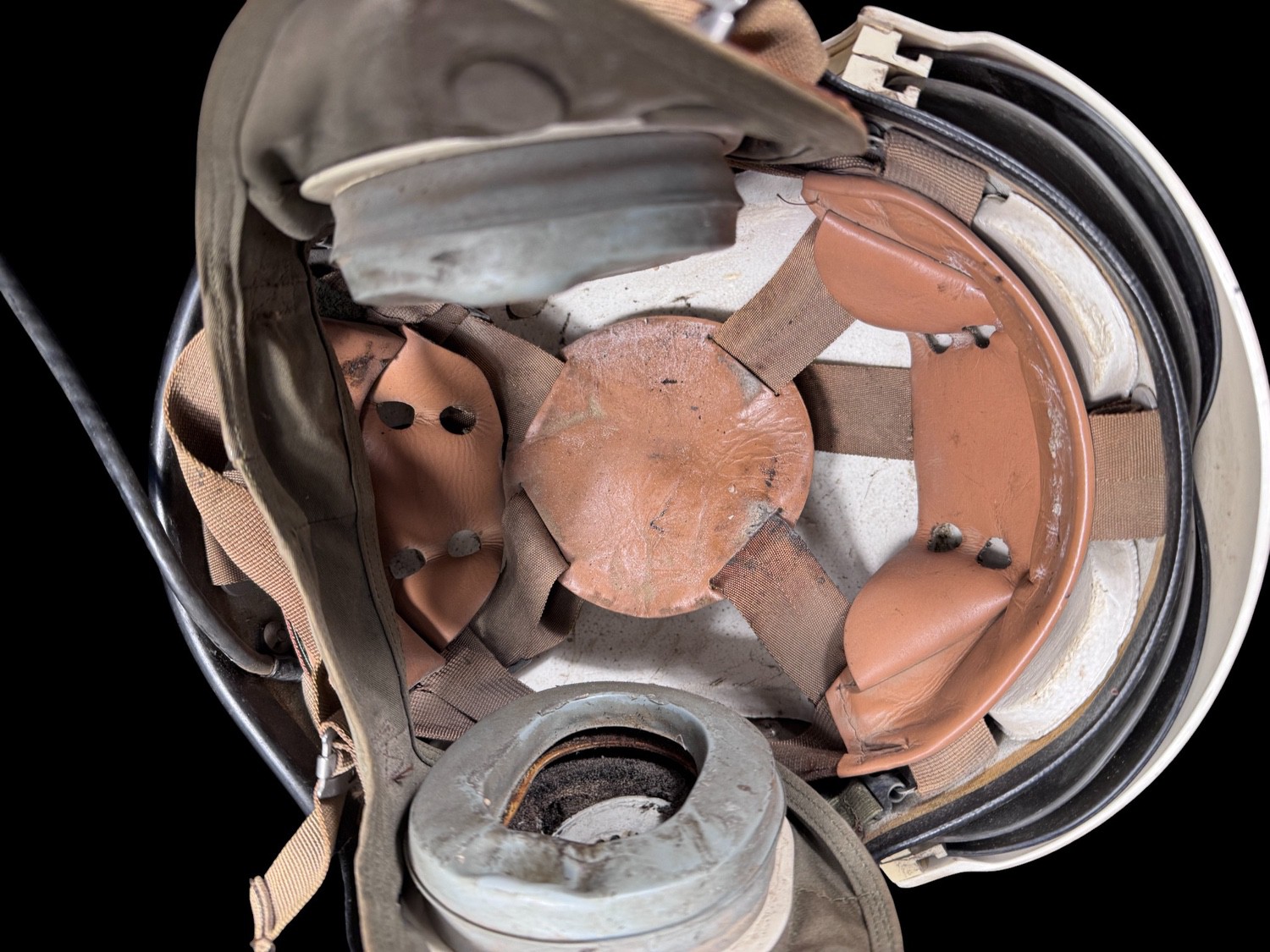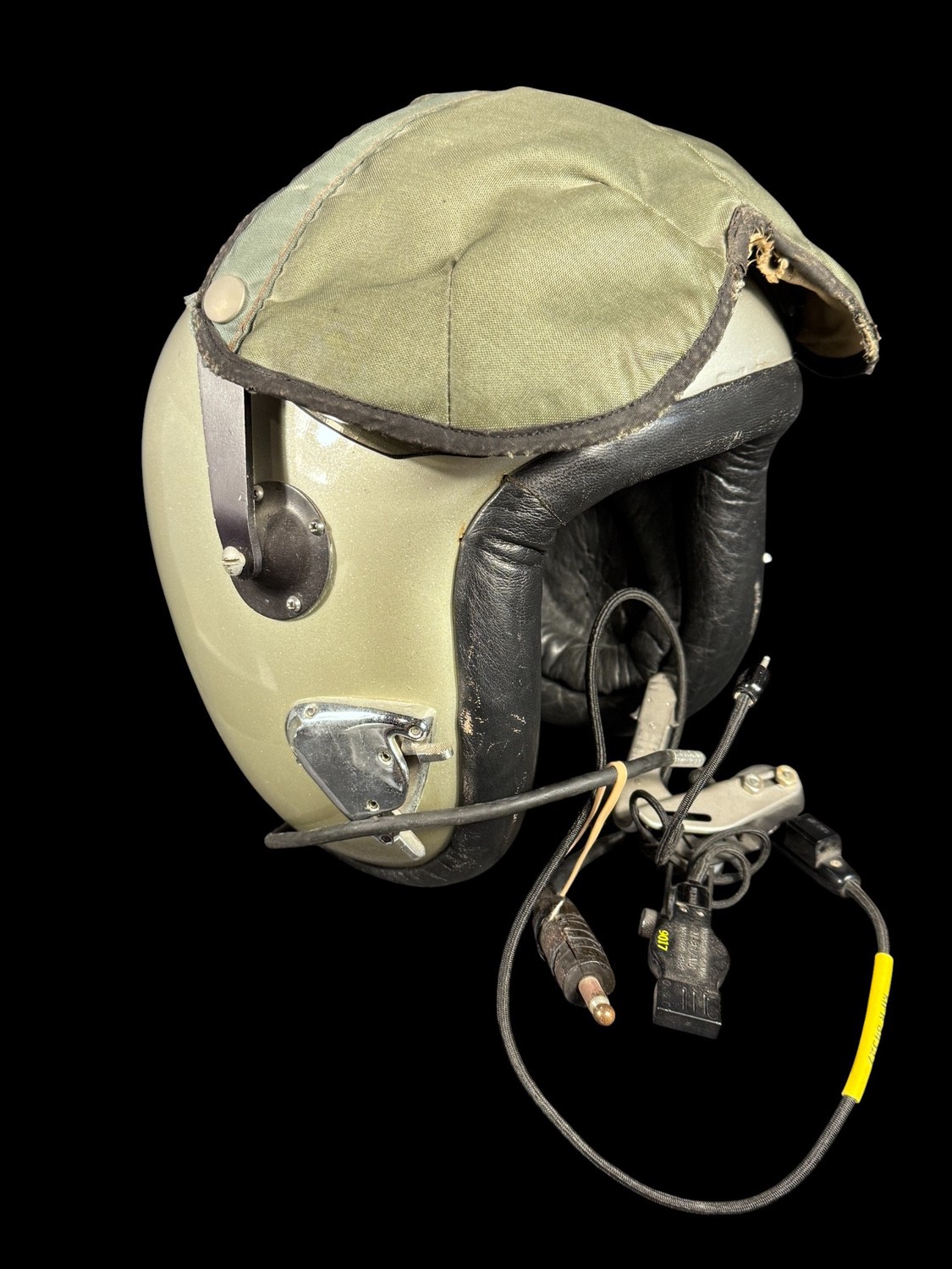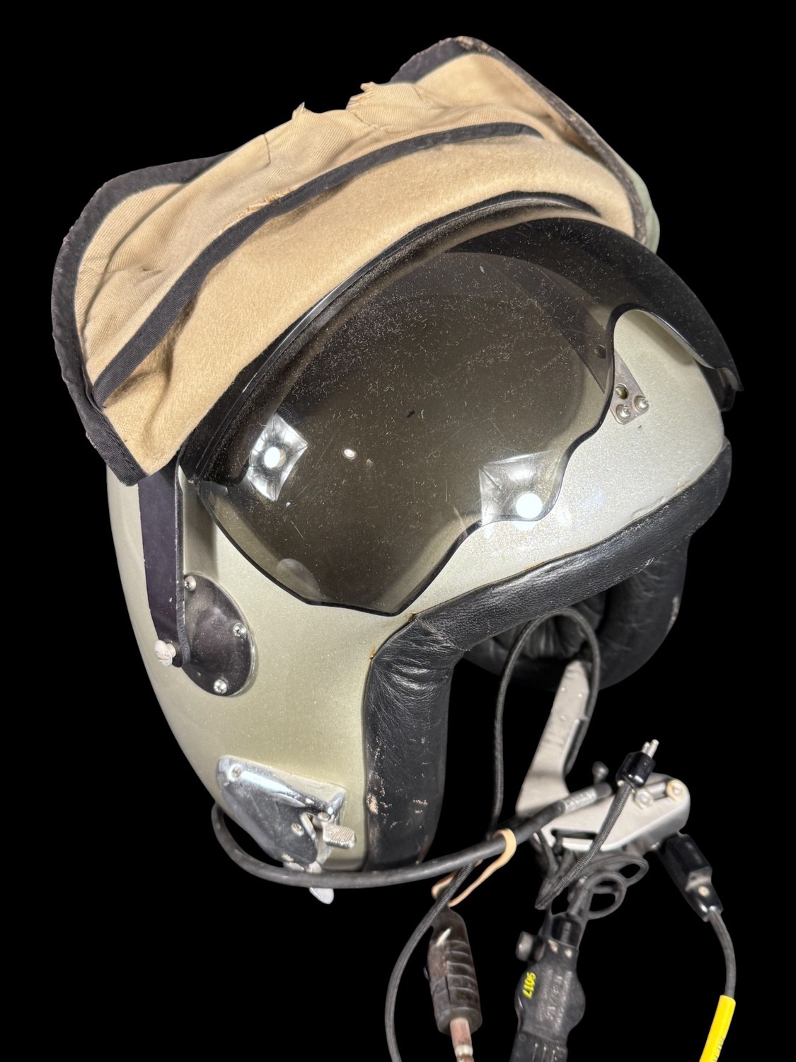 The helmet came from Republic Airport Co. and used by their test pilots. Customer liner, visor cover, comm. cord, Hardman receivers. Excellent condition
