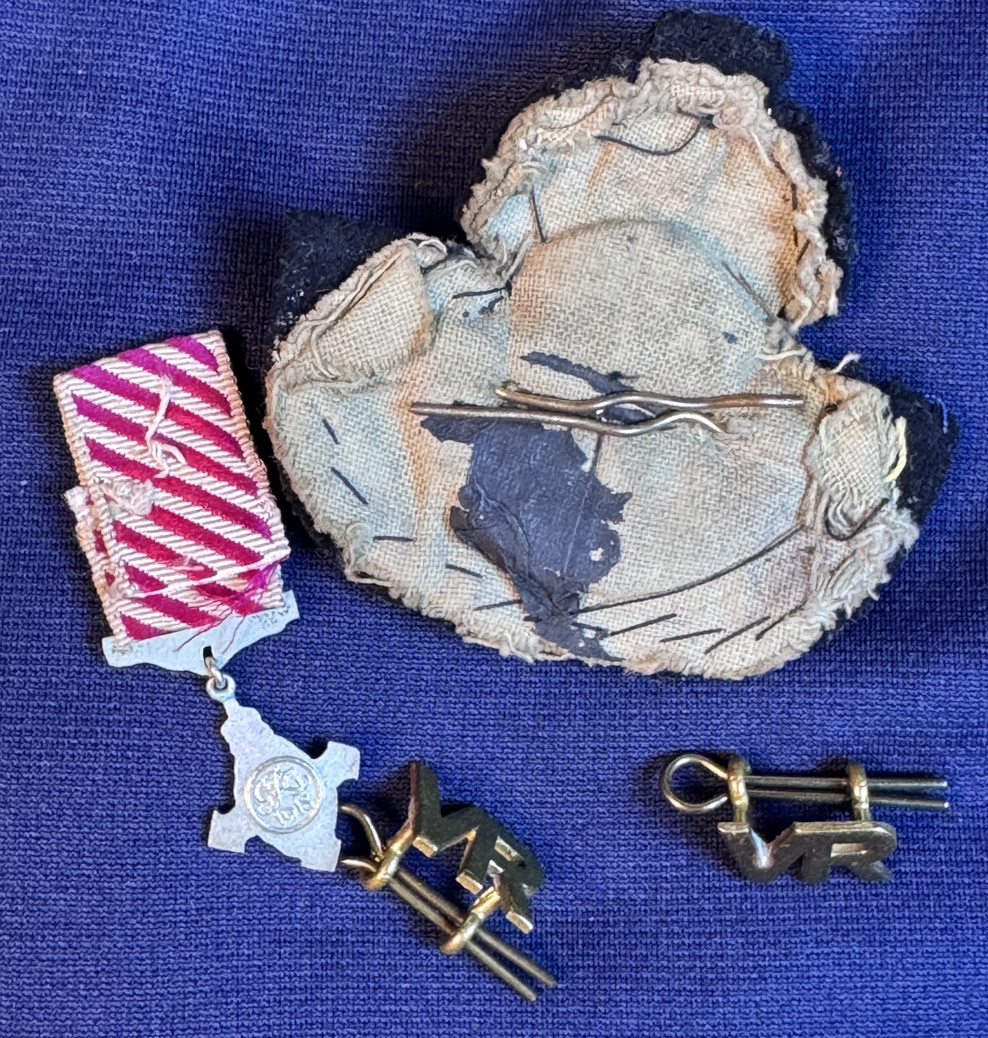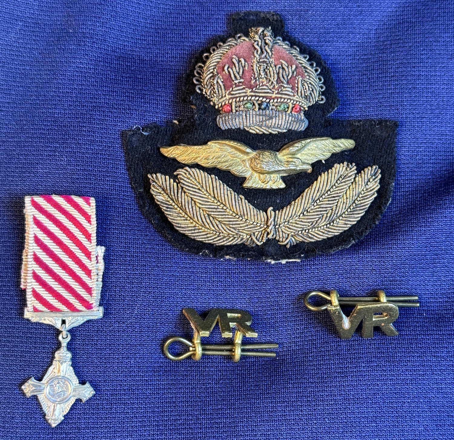 Scarge early Air Force Cross Miniature medal, bullion Officers cap device and Voluntary Reserve collar insignia.