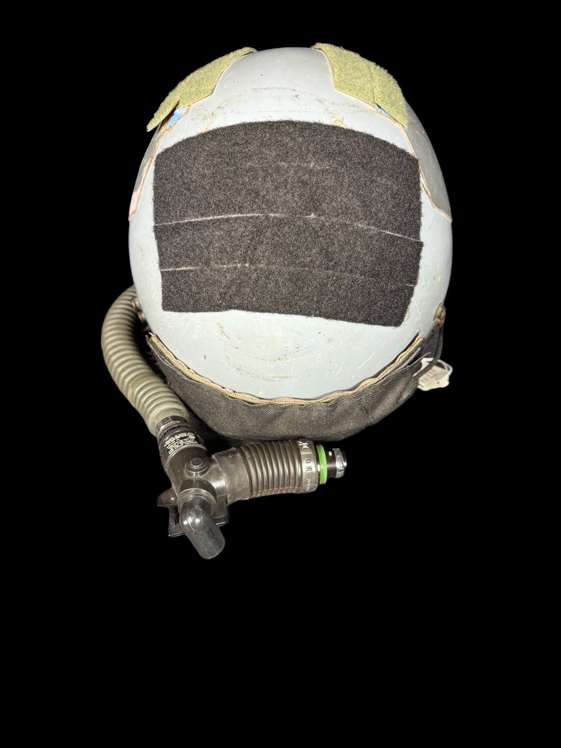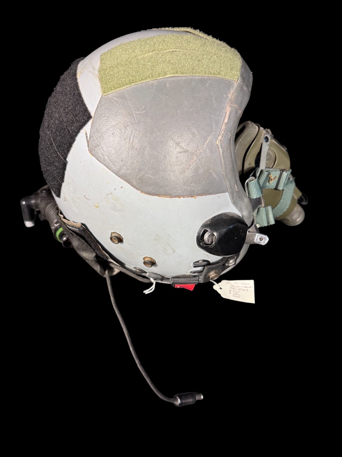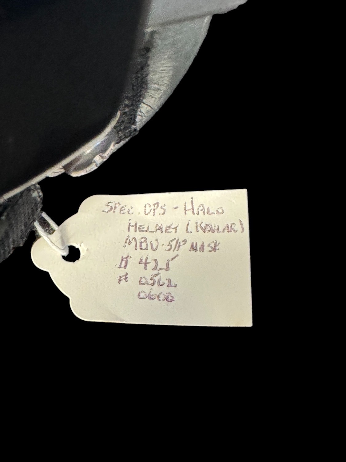The helmet is a protective Kevlar shell finished in a low-visibility light gray color. It features a streamlined shape to reduce wind resistance and is fitted with a specialized leather or synthetic padded interior for impact protection. The exterior is fitted with several strips of Velcro in black and olive green, used for attaching essential gear like night vision devices, counterweights, and identification patches. The shell displays clear signs of operational use and scuffing. A small, handwritten collector s tag attached to the harness identifies the helmet as SPEC OPS – HALO HELMET KEVLAR , confirming its specialized function.